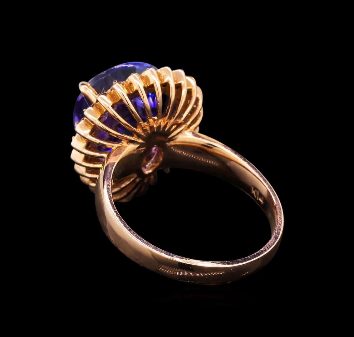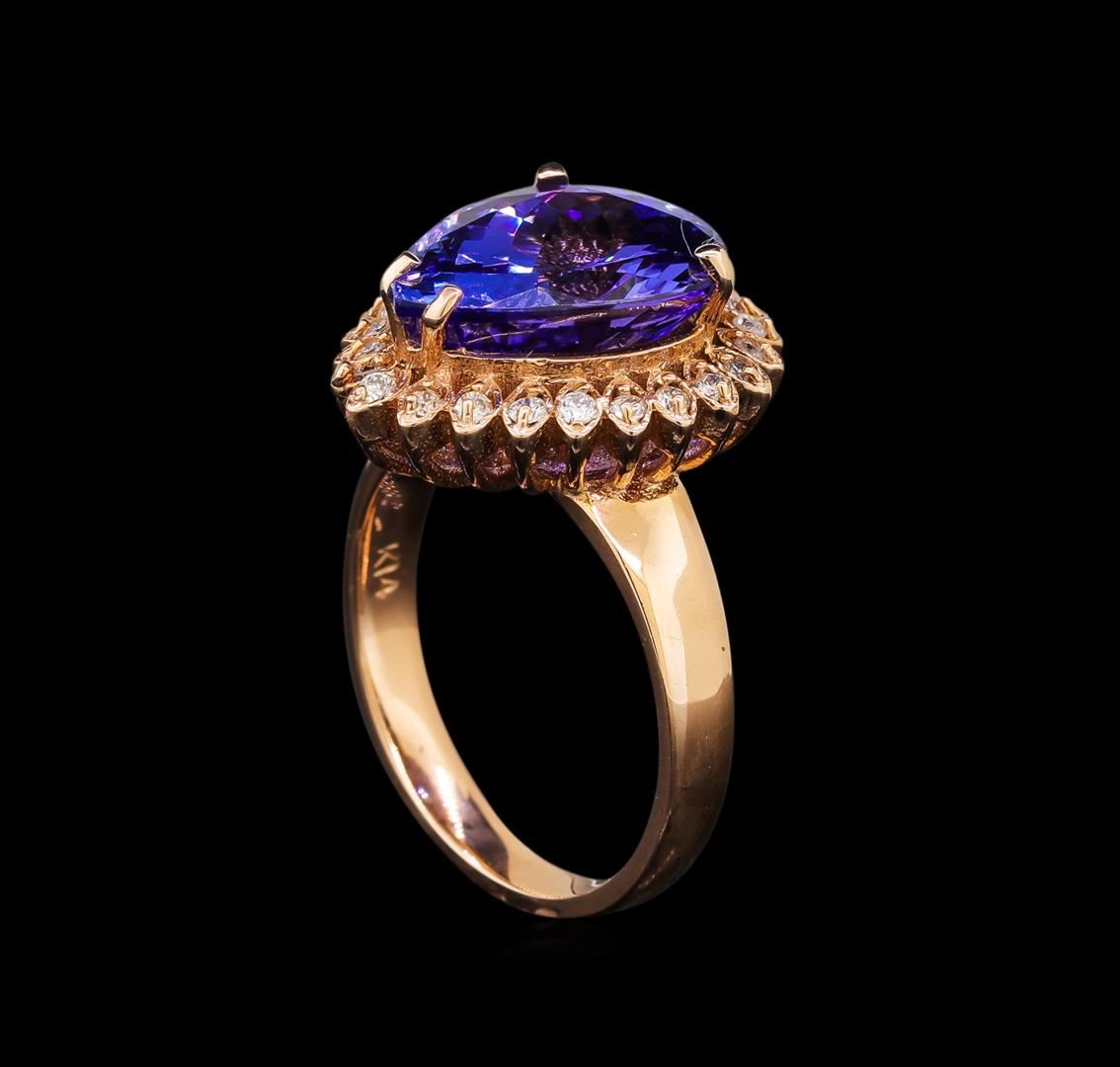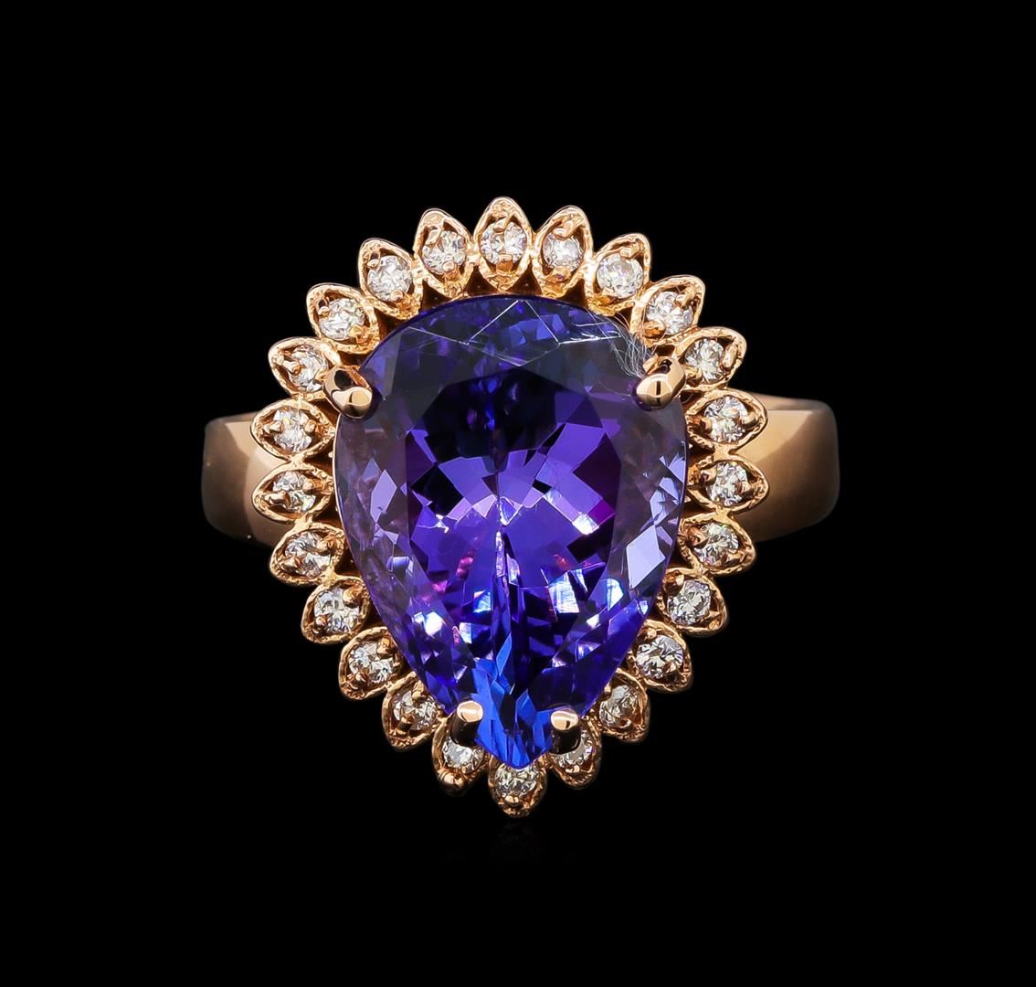 One electronically tested 14KT rose gold ladies cast tanzanite and diamond ring with a bright polish finish. Identified with markings of "K14". Condition is new. Containing: One prong set pear modified brilliant cut natural tanzanite, measuring 14.00 x 10.00 x 6.51mm, approximate weight of 6.11ct., clarity is eye clean, type I, medium light, very slightly grayish, violet color, (GIA V 4/3), cut is good. Twenty-Five prong set round brilliant cut diamonds, measuring 1.30 - 1.30 x 0.78mm (depth est.) approximate. total weight of 25 Stones = 0.20ct. Clarity: SI-2 to I-1. Color: J - K, Cut is Good. Colored gemstones are presumed to have been subjected to commonly used enhancement processes. All diamonds and colored gemstones are graded in the mounting, unless otherwise stated. Total Weight of Colored Stones 6.11ct. Total Weight of Diamonds 0.20ct. Total Weight of Ring 7.30 grams. GGL Appraised at $4,495.00.