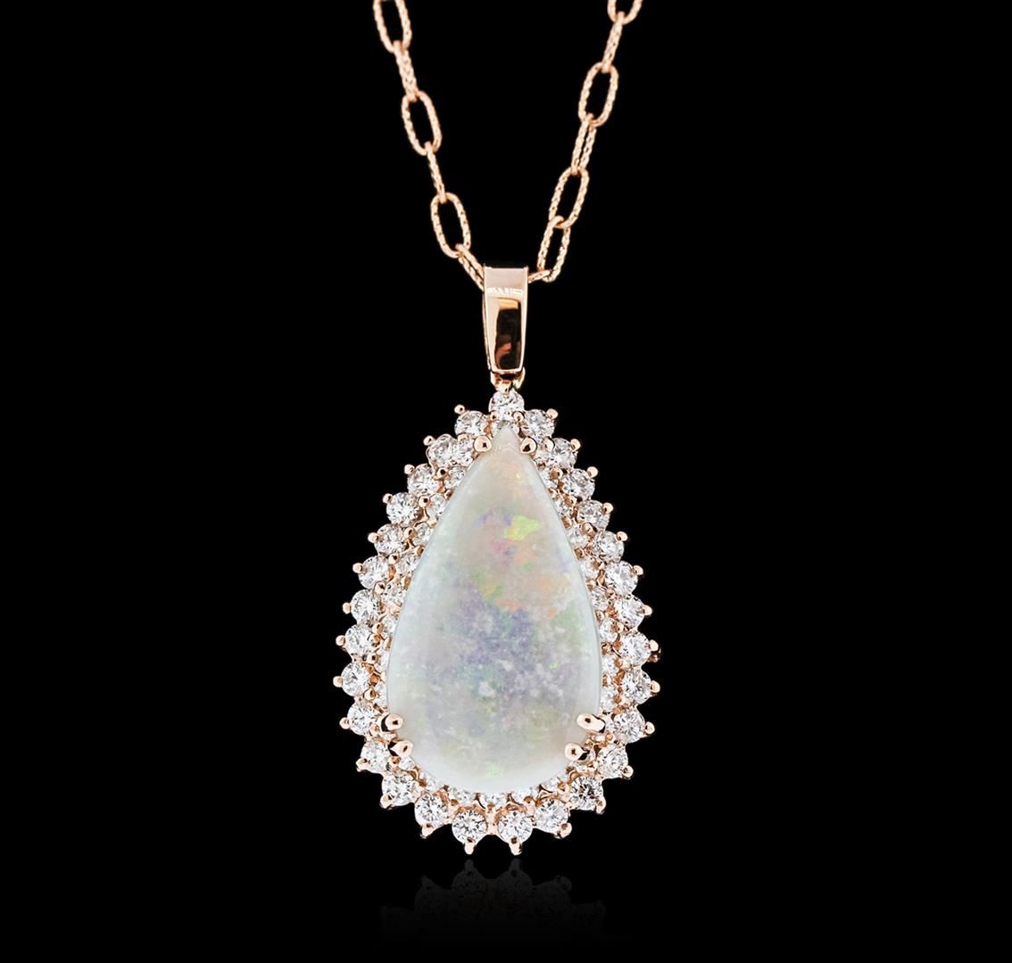 One electronically tested 14KT rose gold ladies cast opal and diamond pendant & chain 18.0" long, with a lobster claw clasp with a bright polish finish. Identified with markings of "14K". Condition is new. Containing: Fifty-Seven prong set round brilliant cut diamonds, measuring 2.30 - 1.80 x 1.23mm (depth est.) approximate total weight of 57 Stones = 1.80ct. Clarity: SI-1 to SI-2. Color: I - J, Cut is Good. One white opal that is cut in a pear shape and is prong set, measuring 26.12 mm long x 15.04 mm wide, and 4.10 mm thick and the approximate weight is 6.23 carats. The opal has a somewhat bright, green-orange play of color (fire) in a pattern; a medium dome; a good cut; no inclusions; consistent in its brightness and pattern; and is somewhat directional. Colored gemstones are presumed to have been subjected to commonly used enhancement processes. All diamonds and colored gemstones are graded in the mounting, unless otherwise stated. Total Weight of Diamonds 1.80ct. Total Weight of Opals 6.23ct. Total Weight of Pendant & Chain 16.20 grams. GGL Appraised at $6,825.00.