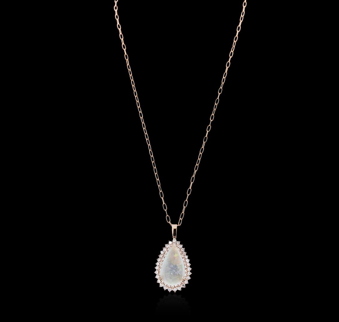 One electronically tested 14KT rose gold ladies cast opal and diamond pendant & chain 18.0" long, with a lobster claw clasp with a bright polish finish. Identified with markings of "14K". Condition is new. Containing: Fifty-Seven prong set round brilliant cut diamonds, measuring 2.30 - 1.80 x 1.23mm (depth est.) approximate total weight of 57 Stones = 1.80ct. Clarity: SI-1 to SI-2. Color: I - J, Cut is Good. One white opal that is cut in a pear shape and is prong set, measuring 26.12 mm long x 15.04 mm wide, and 4.10 mm thick and the approximate weight is 6.23 carats. The opal has a somewhat bright, green-orange play of color (fire) in a pattern; a medium dome; a good cut; no inclusions; consistent in its brightness and pattern; and is somewhat directional. Colored gemstones are presumed to have been subjected to commonly used enhancement processes. All diamonds and colored gemstones are graded in the mounting, unless otherwise stated. Total Weight of Diamonds 1.80ct. Total Weight of Opals 6.23ct. Total Weight of Pendant & Chain 16.20 grams. GGL Appraised at $6,825.00.