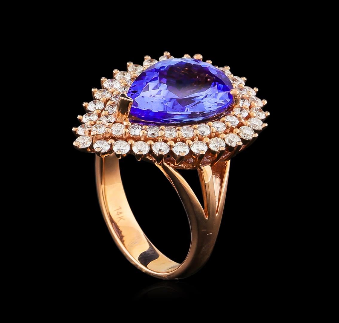 One electronically tested 14KT rose gold ladies combination cast & assembled tanzanite and diamond ring with a split shank with a bright polish finish. Identified with markings of "14K". Condition is new. Containing: One prong set pear modified brilliant cut natural tanzanite, measuring 13.70 x 10.29 x 6.69mm, approximate weight of 6.32ct., clarity is eye clean, type I, medium, moderately strong, bluish violet color, (GIA bV 5/4), cut is good. Forty-One prong set round brilliant cut diamonds, measuring 1.90 - 1.60 x 1.05mm (depth est.) stated total weight of 41 Stones = 0.80ct. Clarity: SI-2 to I-1. Color: I - J, Cut is Good. Colored gemstones are presumed to have been subjected to commonly used enhancement processes. All diamonds and colored gemstones are graded in the mounting, unless otherwise stated total weight of Colored Stones 6.32ct. Total Weight of Diamonds 0.80ct. Total Weight of Ring 8.80 grams. GGL Appraised at $13,495.00.