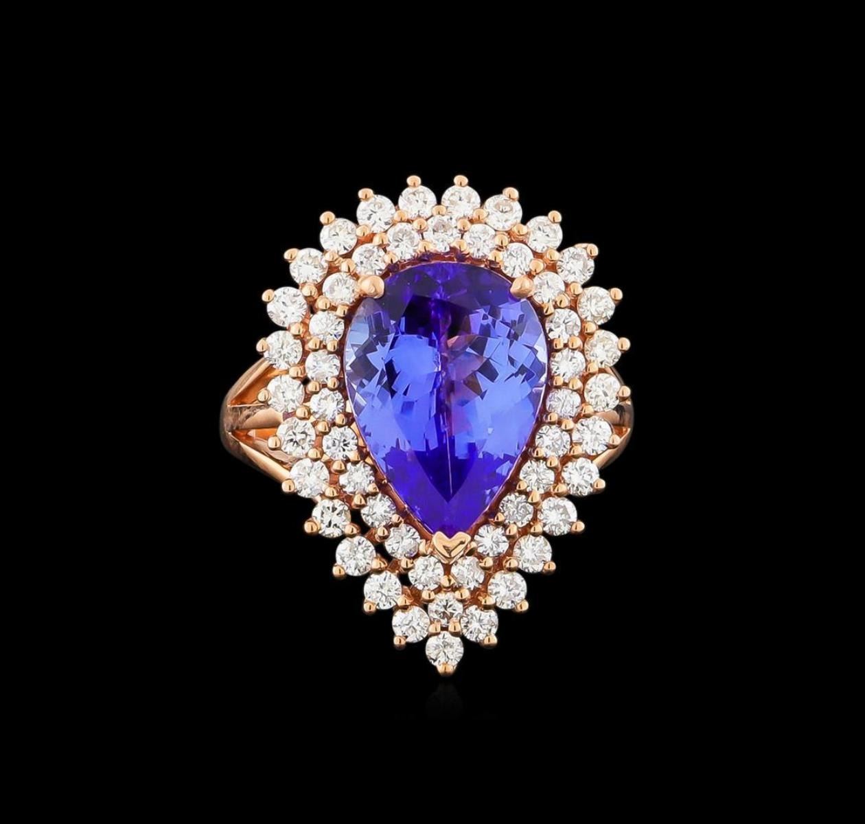 One electronically tested 14KT rose gold ladies combination cast & assembled tanzanite and diamond ring with a split shank with a bright polish finish. Identified with markings of "14K". Condition is new. Containing: One prong set pear modified brilliant cut natural tanzanite, measuring 13.70 x 10.29 x 6.69mm, approximate weight of 6.32ct., clarity is eye clean, type I, medium, moderately strong, bluish violet color, (GIA bV 5/4), cut is good. Forty-One prong set round brilliant cut diamonds, measuring 1.90 - 1.60 x 1.05mm (depth est.) stated total weight of 41 Stones = 0.80ct. Clarity: SI-2 to I-1. Color: I - J, Cut is Good. Colored gemstones are presumed to have been subjected to commonly used enhancement processes. All diamonds and colored gemstones are graded in the mounting, unless otherwise stated total weight of Colored Stones 6.32ct. Total Weight of Diamonds 0.80ct. Total Weight of Ring 8.80 grams. GGL Appraised.