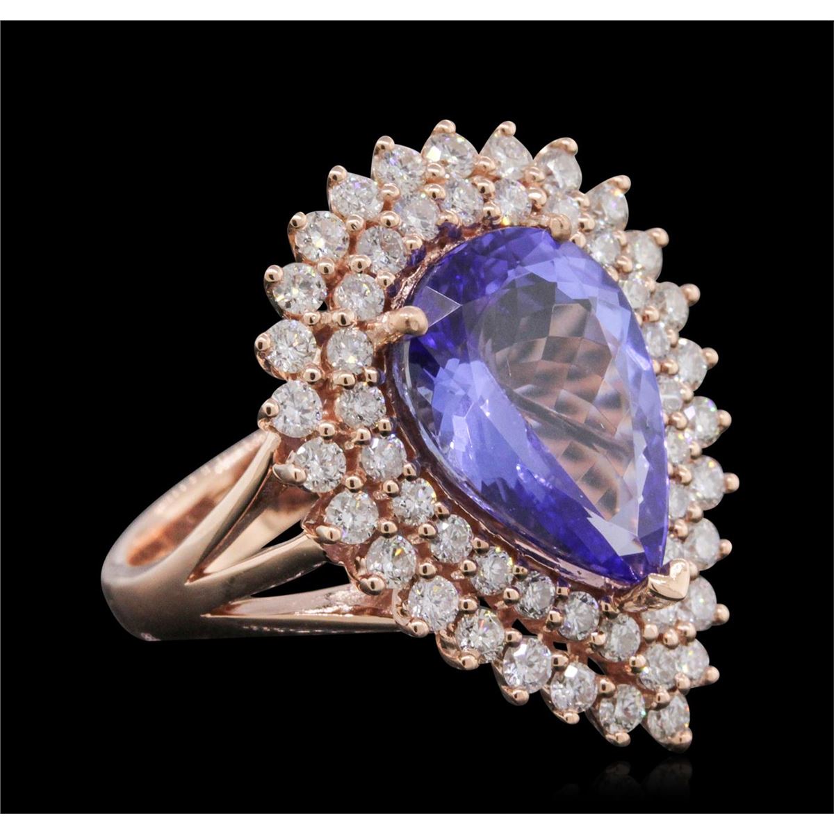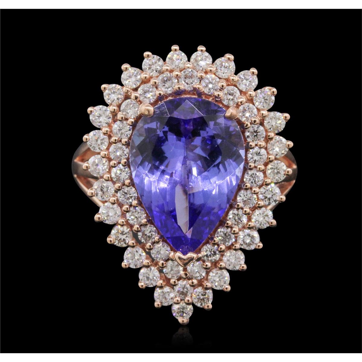 One electronically tested 14KT rose gold ladies combination cast & assembled tanzanite and diamond ring with a split shank with a bright polish finish. Identified with markings of "14K". Condition is new. Containing: One prong set pear modified brilliant cut natural tanzanite, measuring 13.70 x 10.29 x 6.69mm, approximate weight of 6.32ct., clarity is eye clean, type I, medium, moderately strong, bluish violet color, (GIA bV 5/4), cut is good. Forty-One prong set round brilliant cut diamonds, measuring 1.90 - 1.60 x 1.05mm (depth est.) stated total weight of 41 Stones = 0.80ct. Clarity: SI-2 to I-1. Color: I - J, Cut is Good. Colored gemstones are presumed to have been subjected to commonly used enhancement processes. All diamonds and colored gemstones are graded in the mounting, unless otherwise stated total weight of Colored Stones 6.32ct. Total Weight of Diamonds 0.80ct. Total Weight of Ring 8.80 grams. GGL Appraised at $13,495.00.