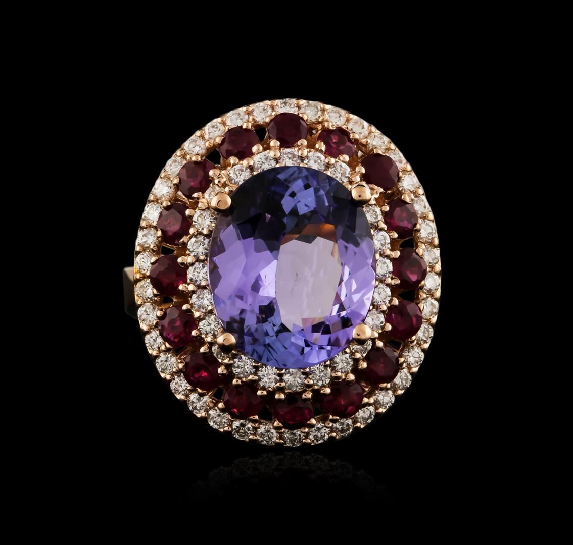 One electronically tested 14KT rose gold ladies cast tanzanite, ruby and diamond ring with a bright polish finish. Identified with markings of "14K". Condition is new. Containing: One prong set oval modified brilliant cut natural tanzanite, measuring 12.50 x 10.50 x 7.16mm, approximate weight of 6.61ct., clarity is eye clean, type I, medium light, very slightly grayish, violet color, (GIA V 4/3), cut is good. Sixty-two prong set round modified brilliant cut natural rubies, measuring 2.20 - 2.20 x 1.43 mm, approximate total weight of 3.72ct., clarity is heavily included, type II, medium dark, moderately strong, strongly purplish red color, (GIA stpR 6/4), cut is good. Sixty-Two prong set round brilliant cut diamonds, measuring 1.50 - 1.50 x 0.90mm (depth est.) approximate total weight of 62 Stones = 0.76ct. Clarity: SI-1. Color: J - K, Cut is Good. Colored gemstones are presumed to have been subjected to commonly used enhancement processes. All diamonds and colored gemstones are graded in the mounting, unless otherwise stated. Total Weight of Colored Stones 10.33ct. Total Weight of Diamonds 0.76ct. Total Weight of Ring 10.00 grams. GGL Appraised at $6,735.00.