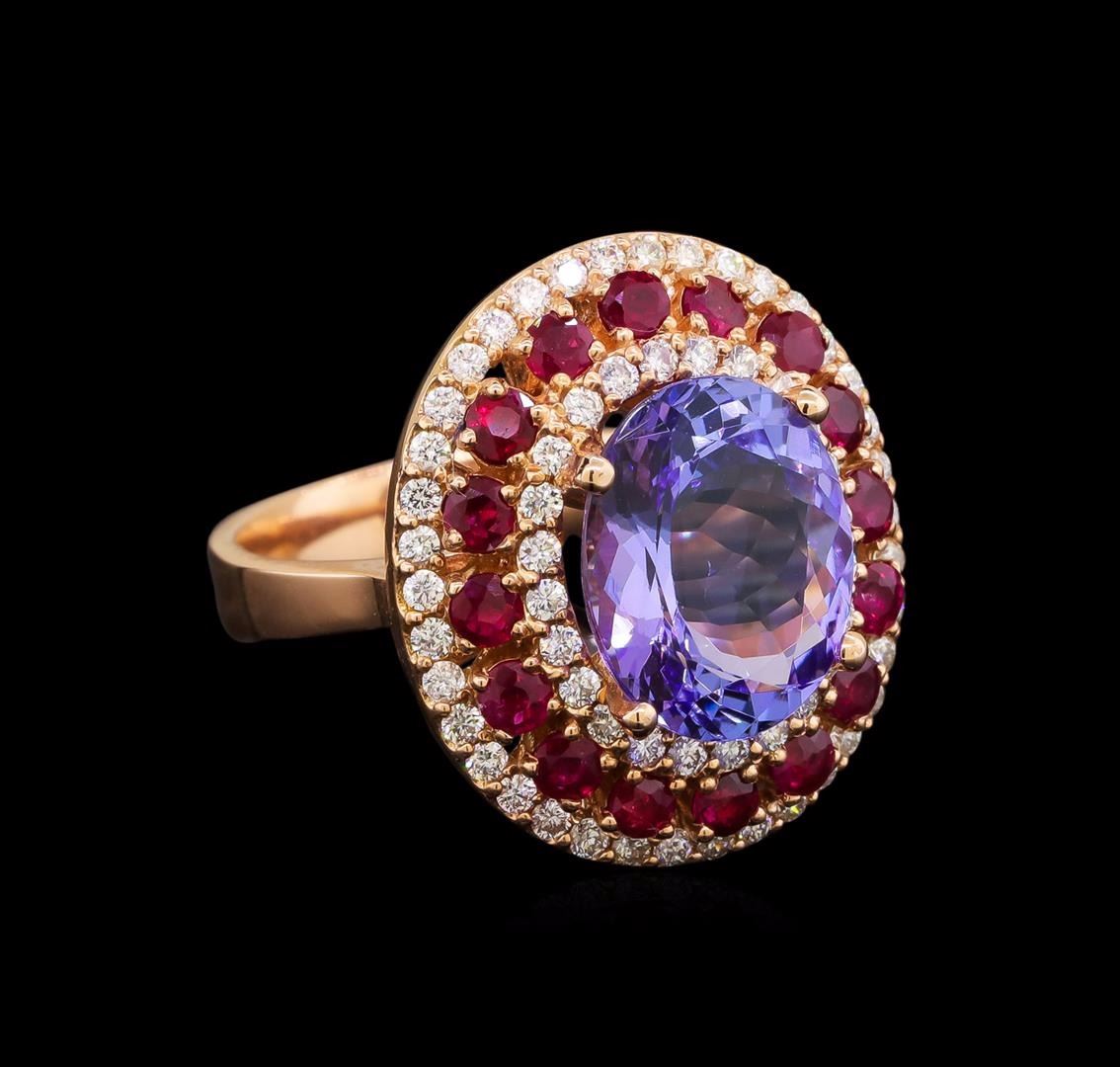 One electronically tested 14KT rose gold ladies cast tanzanite, ruby and diamond ring with a bright polish finish. Identified with markings of "14K". Condition is new. Containing: One prong set oval modified brilliant cut natural tanzanite, measuring 12.50 x 10.50 x 7.16mm, approximate weight of 6.61ct., clarity is eye clean, type I, medium light, very slightly grayish, violet color, (GIA V 4/3), cut is good. Sixty-two prong set round modified brilliant cut natural rubies, measuring 2.20 - 2.20 x 1.43 mm, approximate total weight of 3.72ct., clarity is heavily included, type II, medium dark, moderately strong, strongly purplish red color, (GIA stpR 6/4), cut is good. Sixty-Two prong set round brilliant cut diamonds, measuring 1.50 - 1.50 x 0.90mm (depth est.) approximate total weight of 62 Stones = 0.76ct. Clarity: SI-1. Color: J - K, Cut is Good. Colored gemstones are presumed to have been subjected to commonly used enhancement processes. All diamonds and colored gemstones are graded in the mounting, unless otherwise stated. Total Weight of Colored Stones 10.33ct. Total Weight of Diamonds 0.76ct. Total Weight of Ring 10.00 grams. GGL Appraised at $6,735.00.