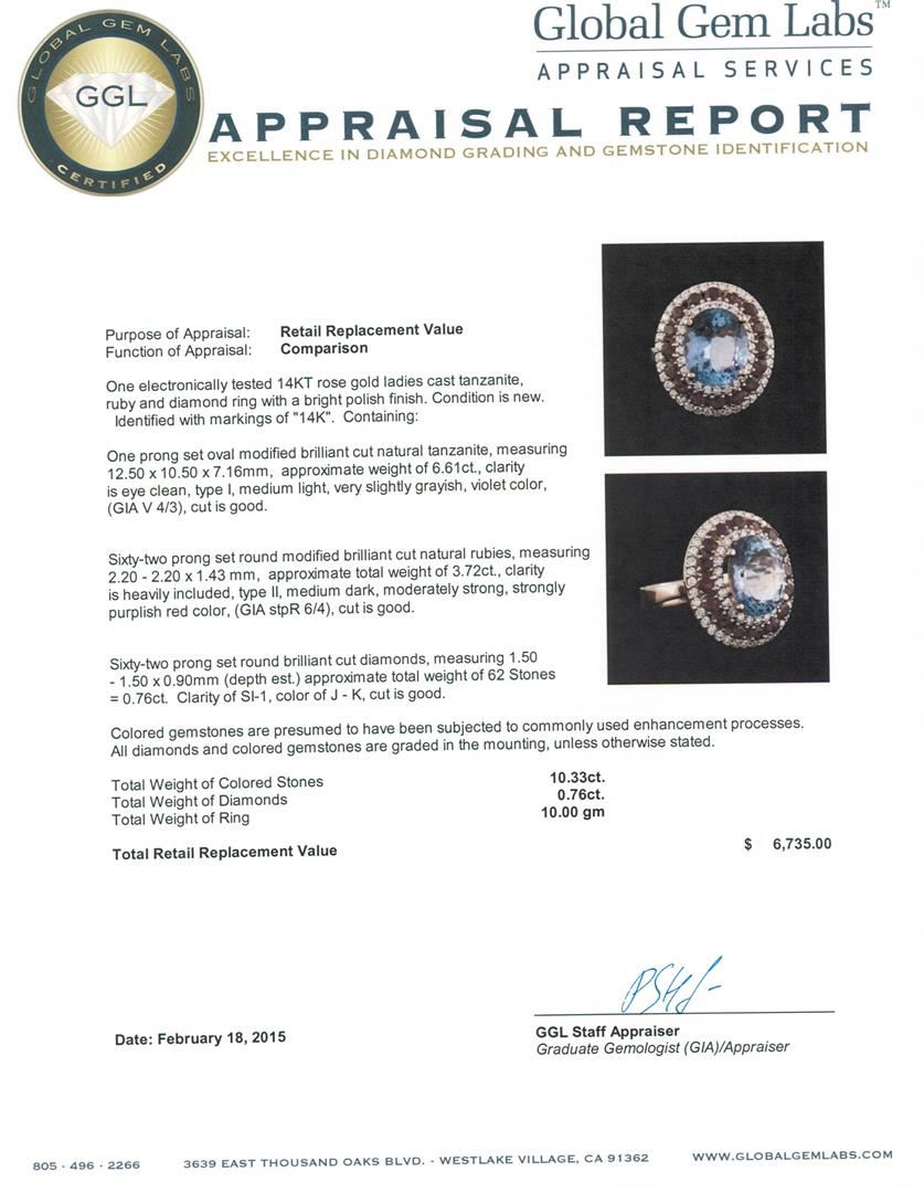 One electronically tested 14KT rose gold ladies cast tanzanite, ruby and diamond ring with a bright polish finish. Identified with markings of "14K". Condition is new. Containing: One prong set oval modified brilliant cut natural tanzanite, measuring 12.50 x 10.50 x 7.16mm, approximate weight of 6.61ct., clarity is eye clean, type I, medium light, very slightly grayish, violet color, (GIA V 4/3), cut is good. Sixty-two prong set round modified brilliant cut natural rubies, measuring 2.20 - 2.20 x 1.43 mm, approximate total weight of 3.72ct., clarity is heavily included, type II, medium dark, moderately strong, strongly purplish red color, (GIA stpR 6/4), cut is good. Sixty-Two prong set round brilliant cut diamonds, measuring 1.50 - 1.50 x 0.90mm (depth est.) approximate total weight of 62 Stones = 0.76ct. Clarity: SI-1. Color: J - K, Cut is Good. Colored gemstones are presumed to have been subjected to commonly used enhancement processes. All diamonds and colored gemstones are graded in the mounting, unless otherwise stated. Total Weight of Colored Stones 10.33ct. Total Weight of Diamonds 0.76ct. Total Weight of Ring 10.00 grams. GGL Appraised at $6,735.00.