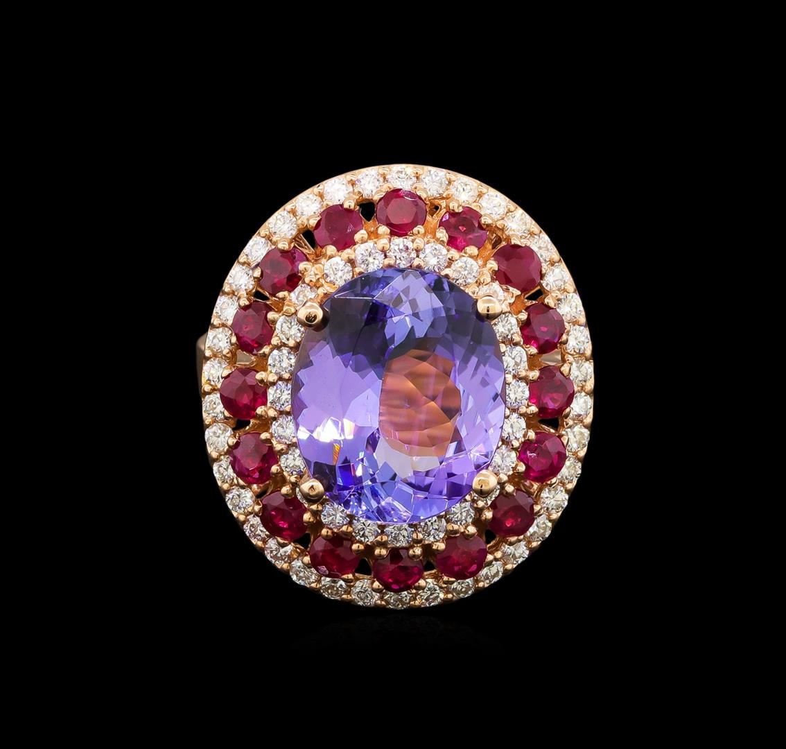 One electronically tested 14KT rose gold ladies cast tanzanite, ruby and diamond ring with a bright polish finish. Identified with markings of "14K". Condition is new. Containing: One prong set oval modified brilliant cut natural tanzanite, measuring 12.50 x 10.50 x 7.16mm, approximate weight of 6.61ct., clarity is eye clean, type I, medium light, very slightly grayish, violet color, (GIA V 4/3), cut is good. Sixty-two prong set round modified brilliant cut natural rubies, measuring 2.20 - 2.20 x 1.43 mm, approximate total weight of 3.72ct., clarity is heavily included, type II, medium dark, moderately strong, strongly purplish red color, (GIA stpR 6/4), cut is good. Sixty-Two prong set round brilliant cut diamonds, measuring 1.50 - 1.50 x 0.90mm (depth est.) approximate total weight of 62 Stones = 0.76ct. Clarity: SI-1. Color: J - K, Cut is Good. Colored gemstones are presumed to have been subjected to commonly used enhancement processes. All diamonds and colored gemstones are graded in the mounting, unless otherwise stated. Total Weight of Colored Stones 10.33ct. Total Weight of Diamonds 0.76ct. Total Weight of Ring 10.00 grams. GGL Appraised at $6,735.00.