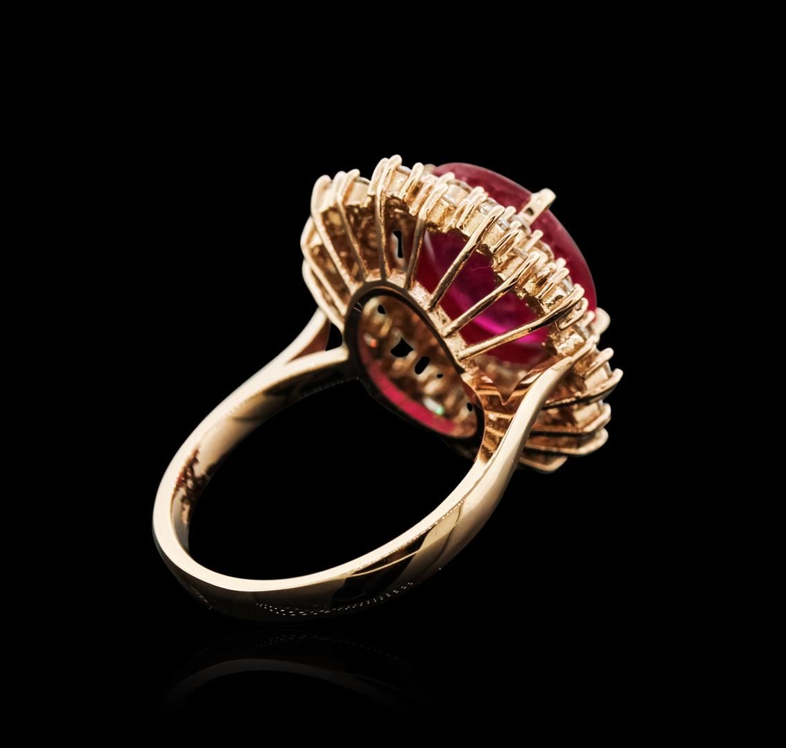 One electronically tested 14KT rose gold ladies cast ruby and diamond ring with a bright polish finish. Identified with markings of "14K". Condition is new. Containing: One prong set oval modified brilliant cut natural ruby, measuring 12.00 x 11.00 x 7.15mm, approximate weight of 6.64ct., clarity is heavily included, type II, medium light, very slightly brownish, slightly purplish red color, (GIA slpR 4/3), cut is good. Fifty-Four prong set round brilliant cut diamonds, measuring 2.50 - 1.50 x 1.20mm (depth est.) approximate total weight of 54 Stones = 1.58ct.. Clarity: SI-1 to SI-2. Color: I - J, Cut is Good. Colored gemstones are presumed to have been subjected to commonly used enhancement processes. All diamonds and colored gemstones are graded in the mounting, unless otherwise stated.. Total Weight of Colored Stones 6.64ct.. Total Weight of Diamonds 1.58ct.. Total Weight of Ring 7.10 grams. GGL Appraised at $5,275.00.