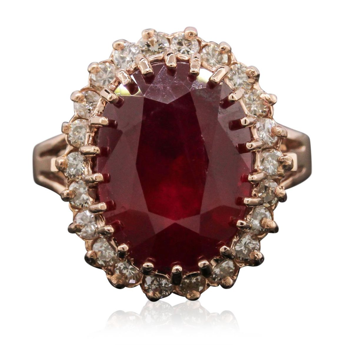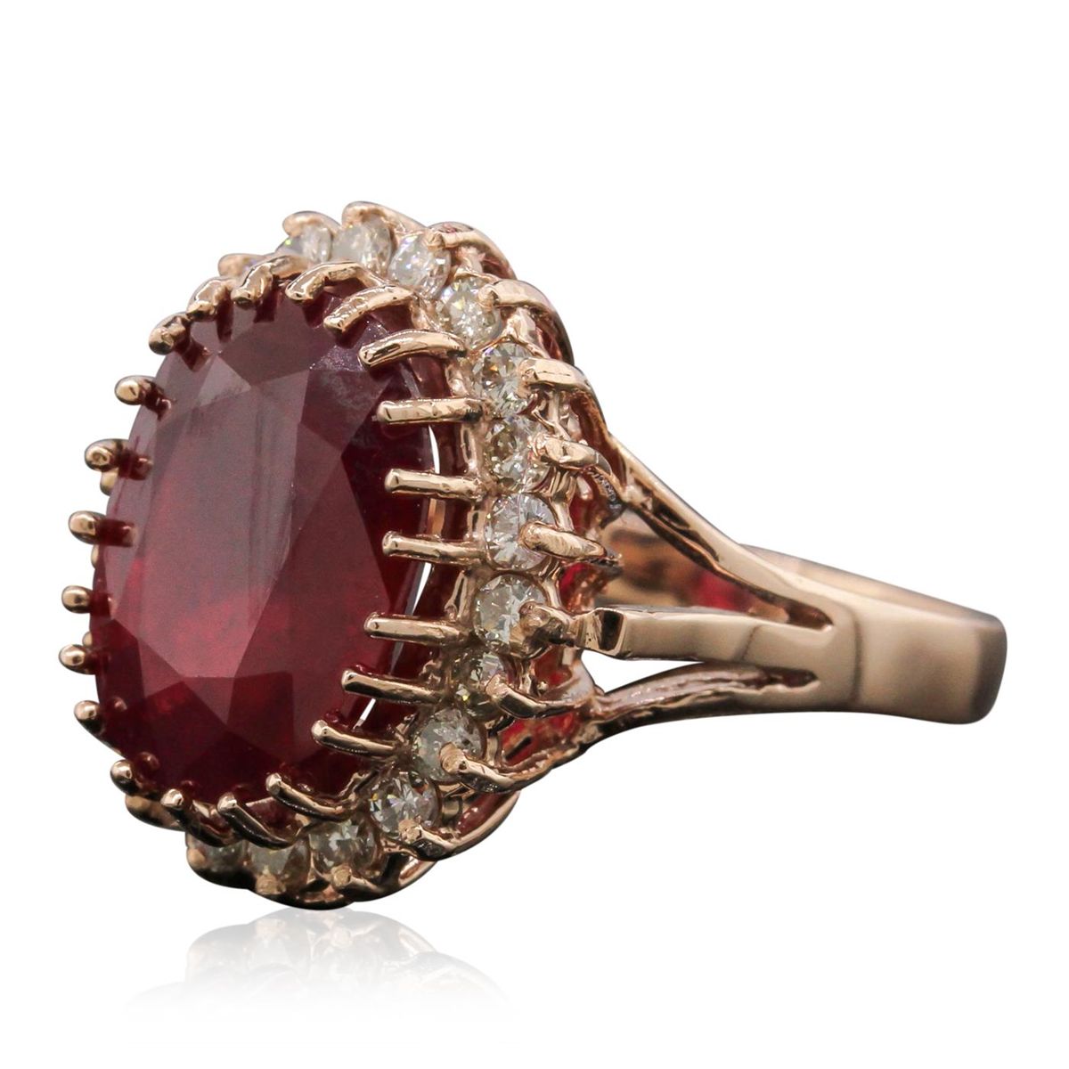 One electronically tested 14KT rose gold Ladies combination cast & assembled ring with a bright polish finish. Condition is new. Identified with markings of "14K". Containing: One prong set oval modified brilliant cut natural ruby, measuring 13.00 x 10.50 x 6.10mm, approximate weight of 6.74ct., clarity is heavily included, type II, medium dark, moderately strong, strongly purplish red color, (GIA stpR 6/4), cut is good. Colored gemstones are presumed to have been subjected to commonly used color/clarity enhancement processes. Twenty-Two prong set round brilliant cut diamonds, measuring 1.80 - 1.80 x 1.08mm (depth est.) approximate. Total Weight of 22 Stones = 0.50ct. Clarity: I-1 to I-2. Color: J - K, Cut is Good. Total Weight of Colored Stones 6.74ct. Total Weight of Diamonds 0.50ct. Total Weight of Ring 5.60 grams. GGL Appraised at $4,320.00.