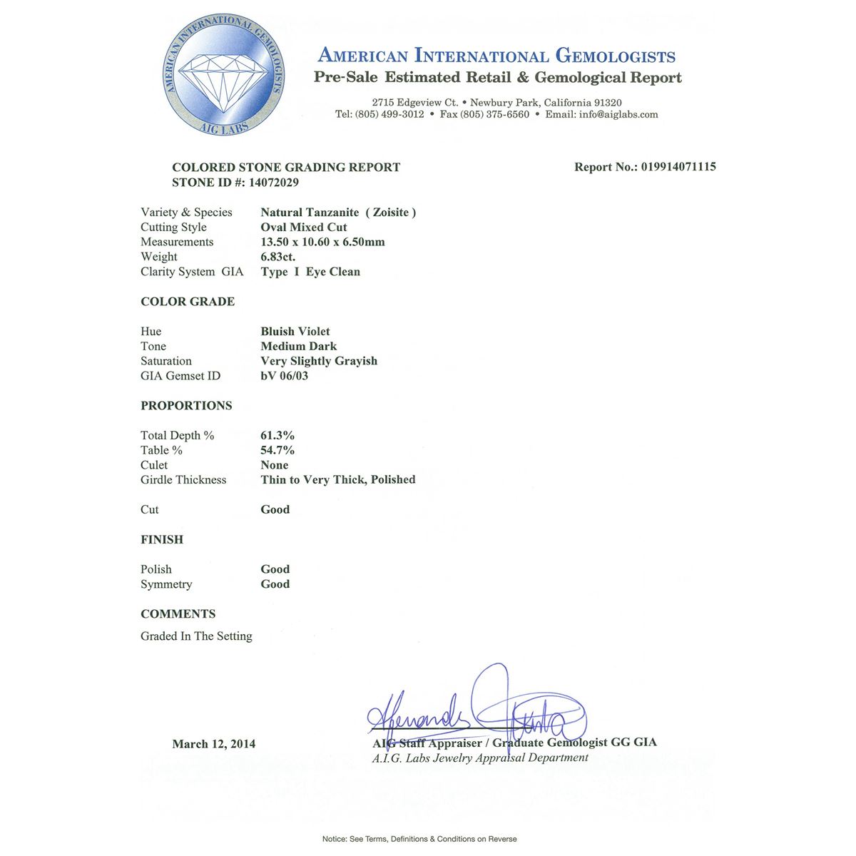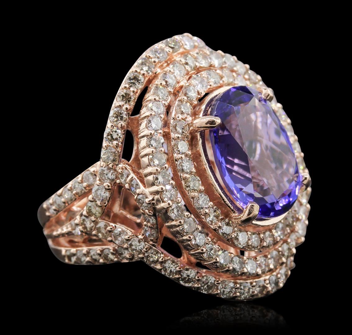One electronically tested 14KT rose gold ladies cast tanzanite and diamond ring with a bright polish finish. Condition is new, good workmanship. The featured tanzanite is set within a two tiered diamond bezel, supported by intertwined ribbons of diamonds as shoulders and completed by a four millimeter wide band. Identified with markings of "K14". Containing: One prong set oval mixed cut natural tanzanite, measuring 13.50 x 10.60 x 6.50mm, 8%. bulge factor, approximate weight of 6.83ct., clarity is eye clean, type I, medium dark, very slightly grayish, bluish violet color, (GIA bV 6/3), cut is good. Transmitting light with no distortion, transparent. Colored Stone Grading Report attached. Graded in the setting. Tanzanite is a very rare gemstone that is only found in the country of Tanzania. Originally discovered in 1967. Tiffany & Company, named the stone Tanzanite. It is found in the Usumburu Mountains that border the Umba Valley of northern Tanzania. Tanzanite occurs in gray, brown, violet, blue, reddish-purple, & green. The gem is interesting because of its exceptional pleochroism. Rotated in different directions a tanzanite will exhibit multiple changes of color. Tanzanite has a low tolerance to ultrasonic cleaning, and should not be cleaned using this method. One Hundred Thirty-Nine prong set round brilliant cut diamonds, measuring 2.00 - 1.90 x 1.17mm (depth est.) approximate. Total Weight of 139 Stones = 3.86ct. Faint brown secondary color throughout. Graded in the setting. Clarity: SI-1 to I-1. Color: I - K. Total Weight of Colored Stones 6.83ct. Total Weight of Diamonds 3.86ct. Total Weight of Ring 16.90 grams. AIG Appraised at $28,400.00.