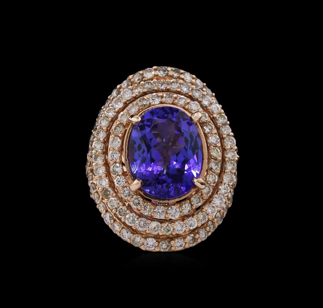One electronically tested 14KT rose gold ladies cast tanzanite and diamond ring with a bright polish finish. Condition is new, good workmanship. The featured tanzanite is set within a two tiered diamond bezel, supported by intertwined ribbons of diamonds as shoulders and completed by a four millimeter wide band. Identified with markings of "K14". Containing: One prong set oval mixed cut natural tanzanite, measuring 13.50 x 10.60 x 6.50mm, 8%. bulge factor, approximate weight of 6.83ct., clarity is eye clean, type I, medium dark, very slightly grayish, bluish violet color, (GIA bV 6/3), cut is good. Transmitting light with no distortion, transparent. Colored Stone Grading Report attached. Graded in the setting. Tanzanite is a very rare gemstone that is only found in the country of Tanzania. Originally discovered in 1967. Tiffany & Company, named the stone Tanzanite. It is found in the Usumburu Mountains that border the Umba Valley of northern Tanzania. Tanzanite occurs in gray, brown, violet, blue, reddish-purple, & green. The gem is interesting because of its exceptional pleochroism. Rotated in different directions a tanzanite will exhibit multiple changes of color. Tanzanite has a low tolerance to ultrasonic cleaning, and should not be cleaned using this method. One Hundred Thirty-Nine prong set round brilliant cut diamonds, measuring 2.00 - 1.90 x 1.17mm (depth est.) approximate. Total Weight of 139 Stones = 3.86ct. Faint brown secondary color throughout. Graded in the setting. Clarity: SI-1 to I-1. Color: I - K. Total Weight of Colored Stones 6.83ct. Total Weight of Diamonds 3.86ct. Total Weight of Ring 16.90 grams. AIG Appraised at $28,400.00.