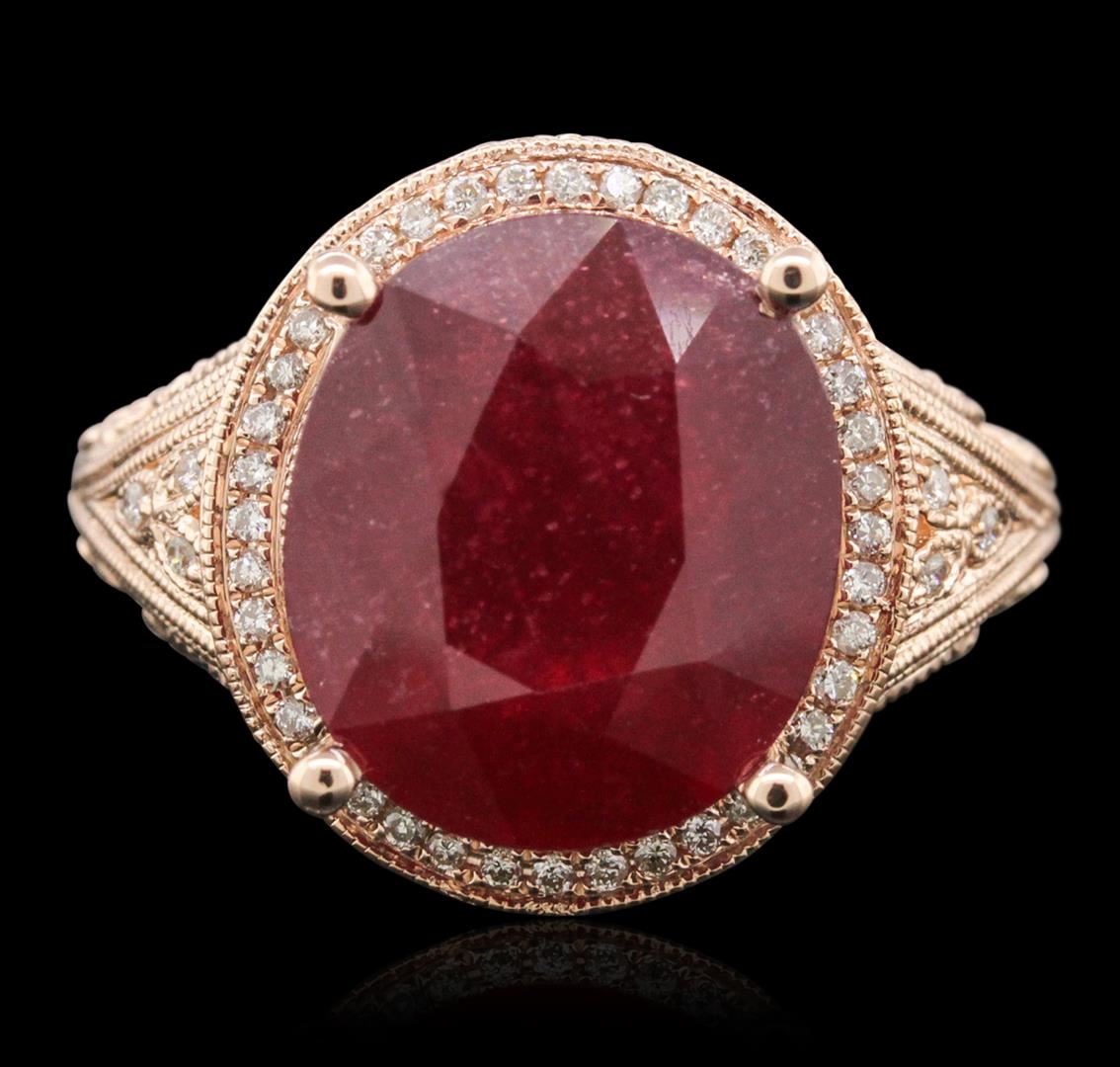 One electronically tested 14KT rose gold ladies cast ruby and diamond ring. Condition is new, good workmanship. The featured ruby is set within a diamond bezel supported by elaborate diamond accented shoulders, completed by a two and one-half millimeter wide band. Bright polish finish with milgrain detailing throughout. Trademark is PMI. Identified with markings of "14K". Containing: One prong set oval mixed cut natural ruby, measuring 13.30 x 10.16 x 5.75mm, 10%. bulge factor, approximate weight of 6.96ct., clarity is heavily included, type II, dark, very slightly brownish, red color, (GIA R 7/3), cut is good. Transmitting light somewhat diffusely, transparent to translucent. Naturally occurring internal & external characteristics are present. Indications of laboratory high temperature heat treatment, with glass & flux additives. Graded in the setting. Ruby has a low tolerance to rhodium plating, repolishing the surface, & ultrasonic cleaning. Forty-Six prong set round brilliant cut diamonds, measuring 1.10 - 1.00 x 0.63mm (depth est.) approximate. Total Weight of 46 Stones = 0.29ct. Graded in the setting. Clarity: SI-1 to I-1. Color: G - I. Total Weight of Colored Stones 6.96ct. Total Weight of Diamonds 0.29ct. Total Weight of Ring 8.50 grams. AIG Appraised at $3,935.00.