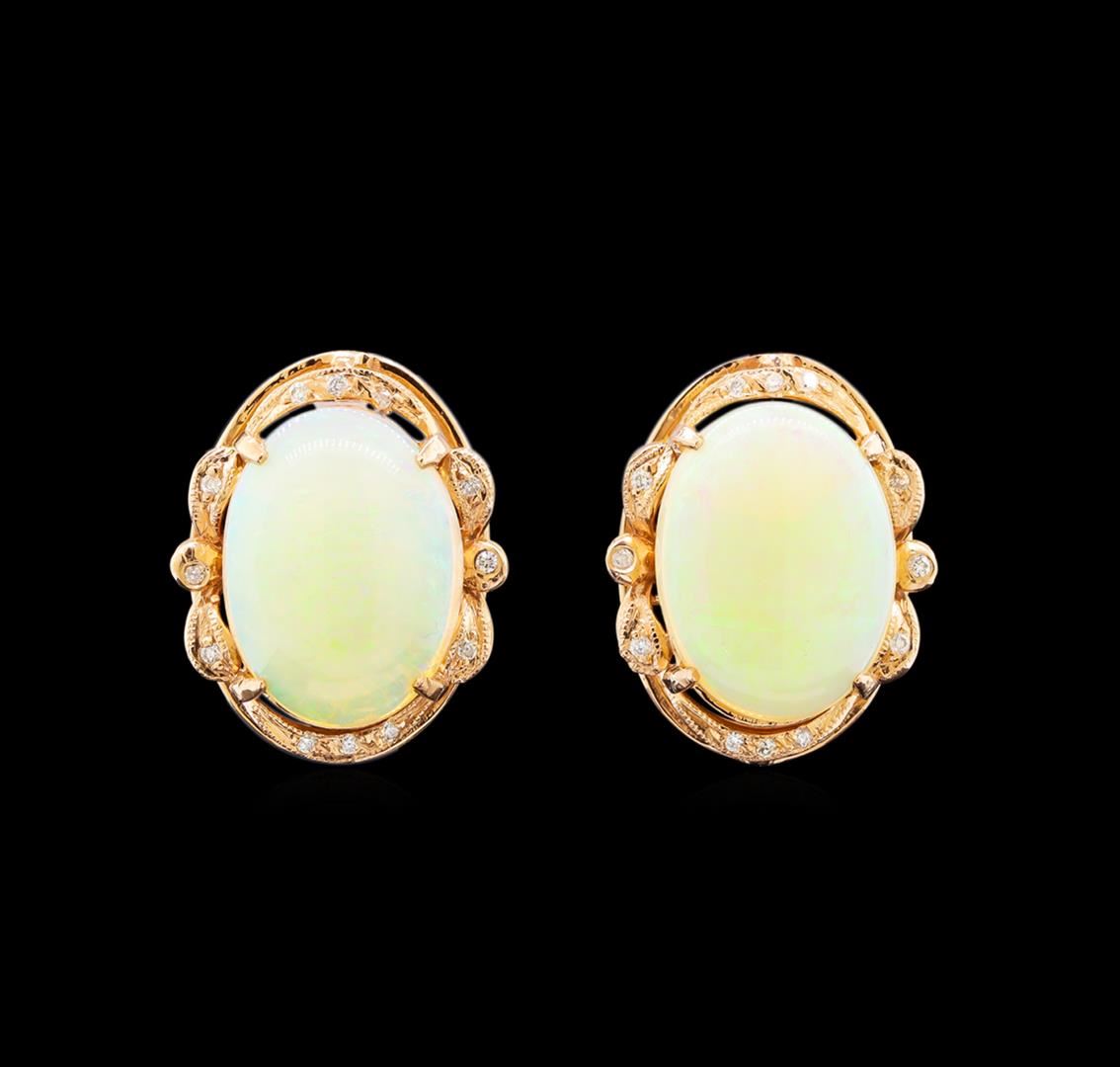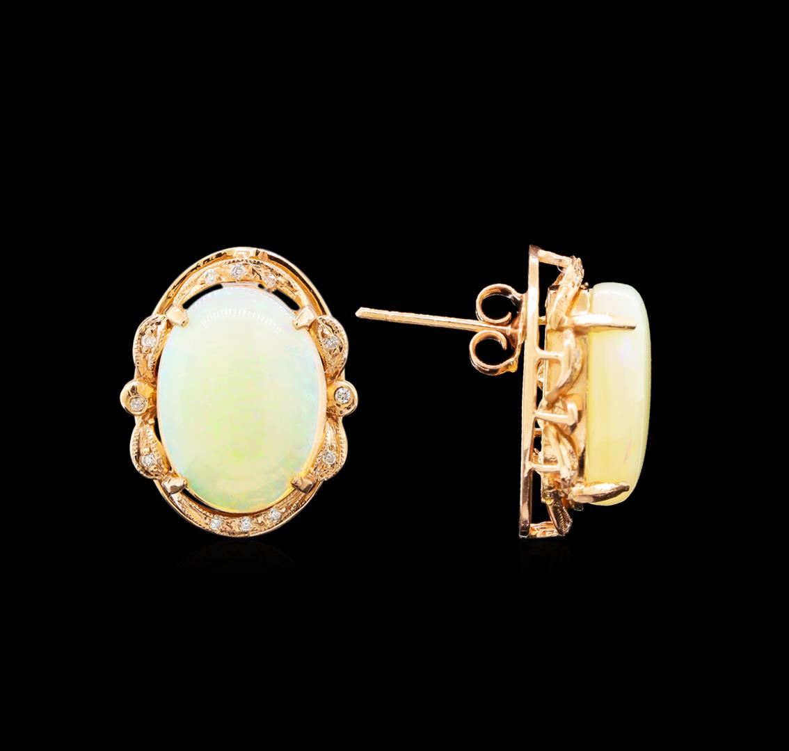 One pair electronically tested 14KT rose gold ladies cast opal and diamond earrings with friction posts with a bright polish finish. Identified with markings of "14K". Condition is new. Containing: Two white opals that are cut in a oval shaped and are prong set, measuring 16.00 mm long x 12.50 mm wide, and 4.01 mm thick and the approximate weight is 7.00 carats. The opals have a somewhat bright, green only play of color (fire) in a flashfire pattern; a medium dome; a good cut; no inclusions; consistent in their brightness and pattern; and are somewhat directional. Twelve prong set round brilliant cut diamonds, measuring 1.00 - 1.00 x 0.60mm (depth est.) approximate total weight of 12 Stones = 0.04ct. Clarity: I-1 to I-2. Color: I - J. Colored gemstones are presumed to have been subjected to commonly used enhancement processes. All diamonds and colored gemstones are graded in the mounting, unless otherwise stated. Total Weight of Diamonds 0.04ct. Total Weight of Opals 7.00ct. Total Weight of Earrings 8.40 grams. GGL Appraised at $2,650.00.