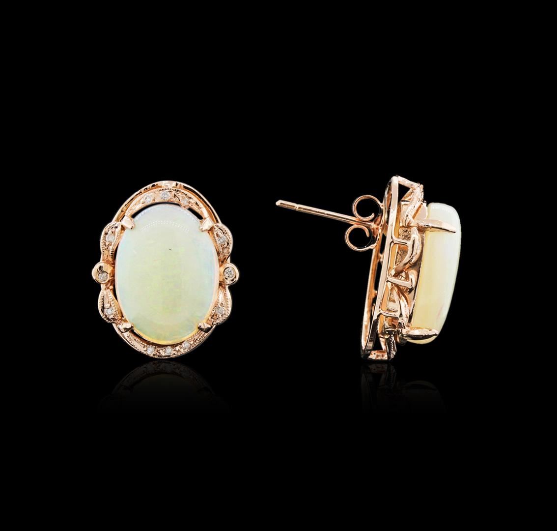 One pair electronically tested 14KT rose gold ladies cast opal and diamond earrings with friction posts with a bright polish finish. Identified with markings of "14K". Condition is new. Containing: Two white opals that are cut in a oval shaped and are prong set, measuring 16.00 mm long x 12.50 mm wide, and 4.01 mm thick and the approximate weight is 7.00 carats. The opals have a somewhat bright, green only play of color (fire) in a flashfire pattern; a medium dome; a good cut; no inclusions; consistent in their brightness and pattern; and are somewhat directional. Twelve prong set round brilliant cut diamonds, measuring 1.00 - 1.00 x 0.60mm (depth est.) approximate total weight of 12 Stones = 0.04ct. Clarity: I-1 to I-2. Color: I - J. Colored gemstones are presumed to have been subjected to commonly used enhancement processes. All diamonds and colored gemstones are graded in the mounting, unless otherwise stated. Total Weight of Diamonds 0.04ct. Total Weight of Opals 7.00ct. Total Weight of Earrings 8.40 grams. GGL Appraised at $2,650.00.