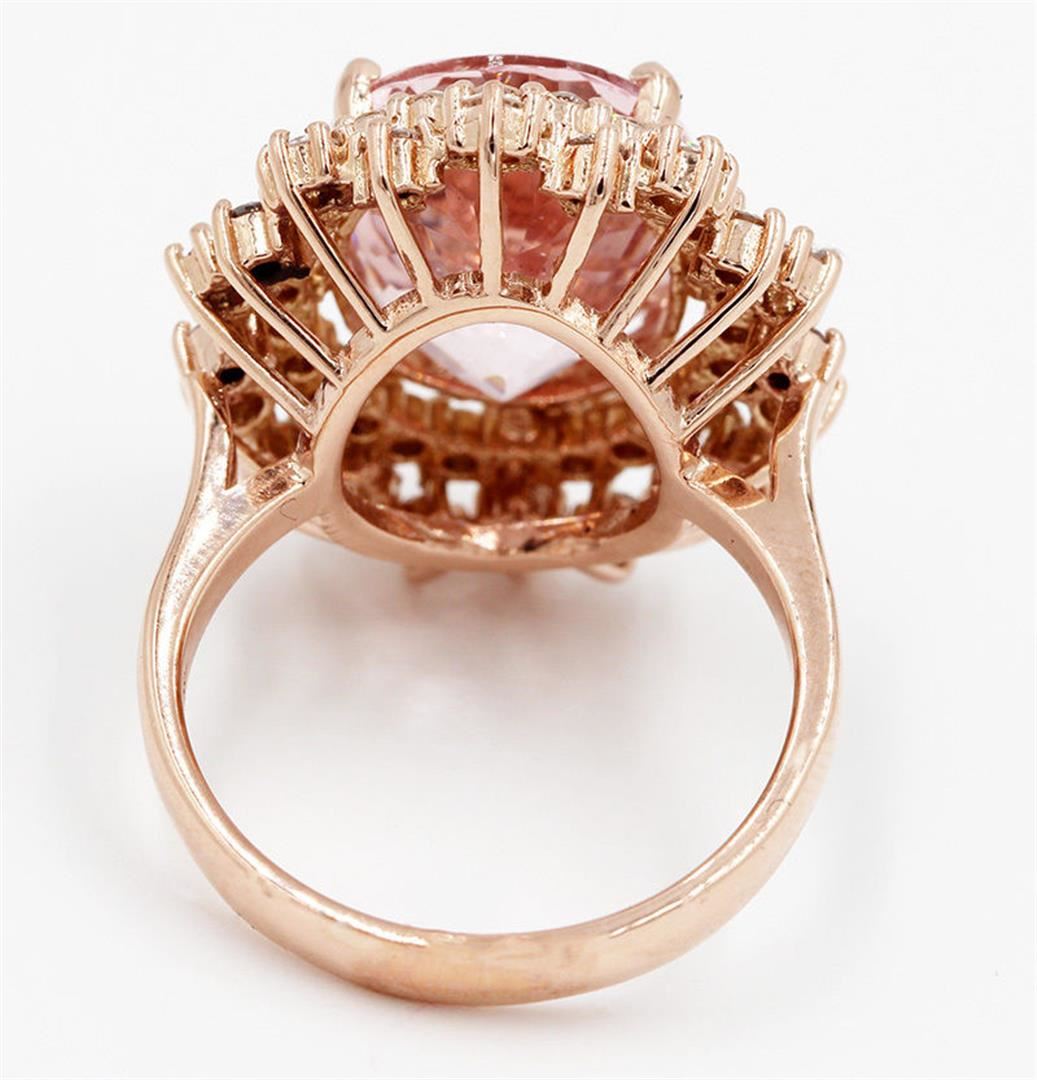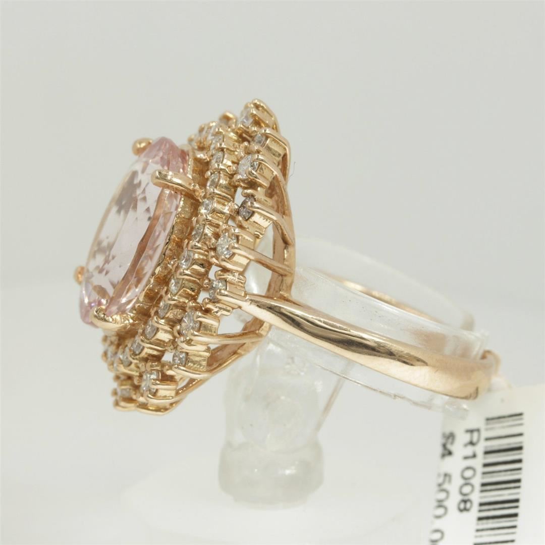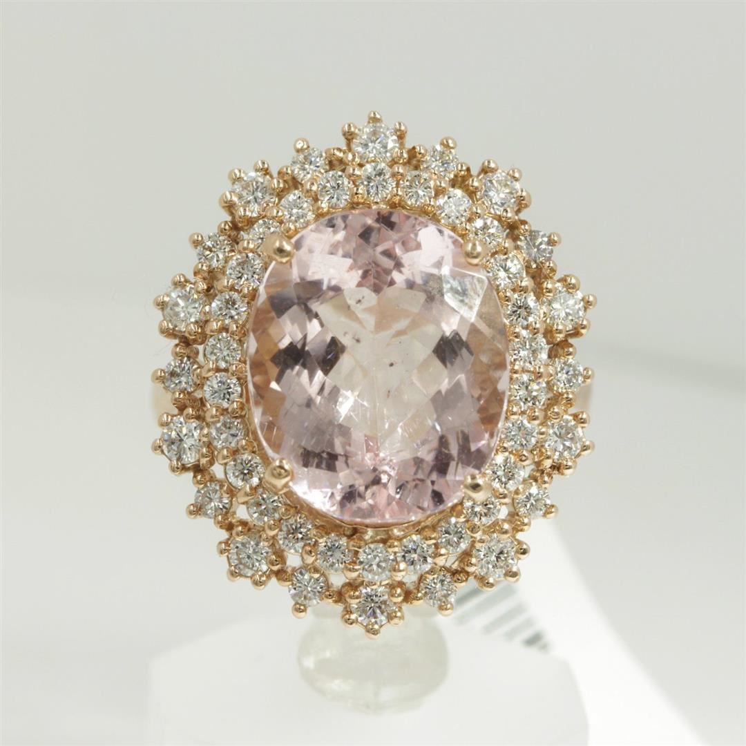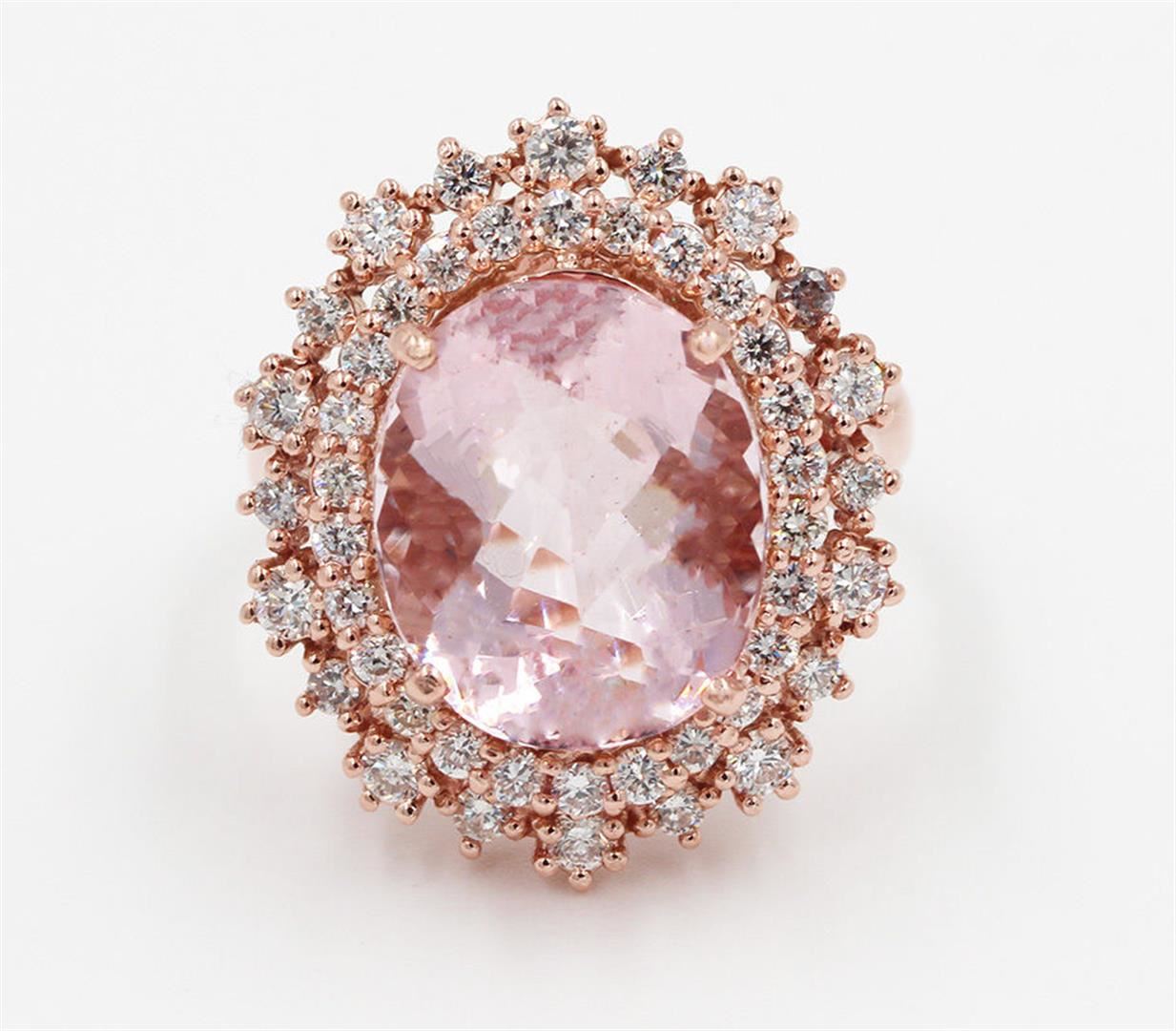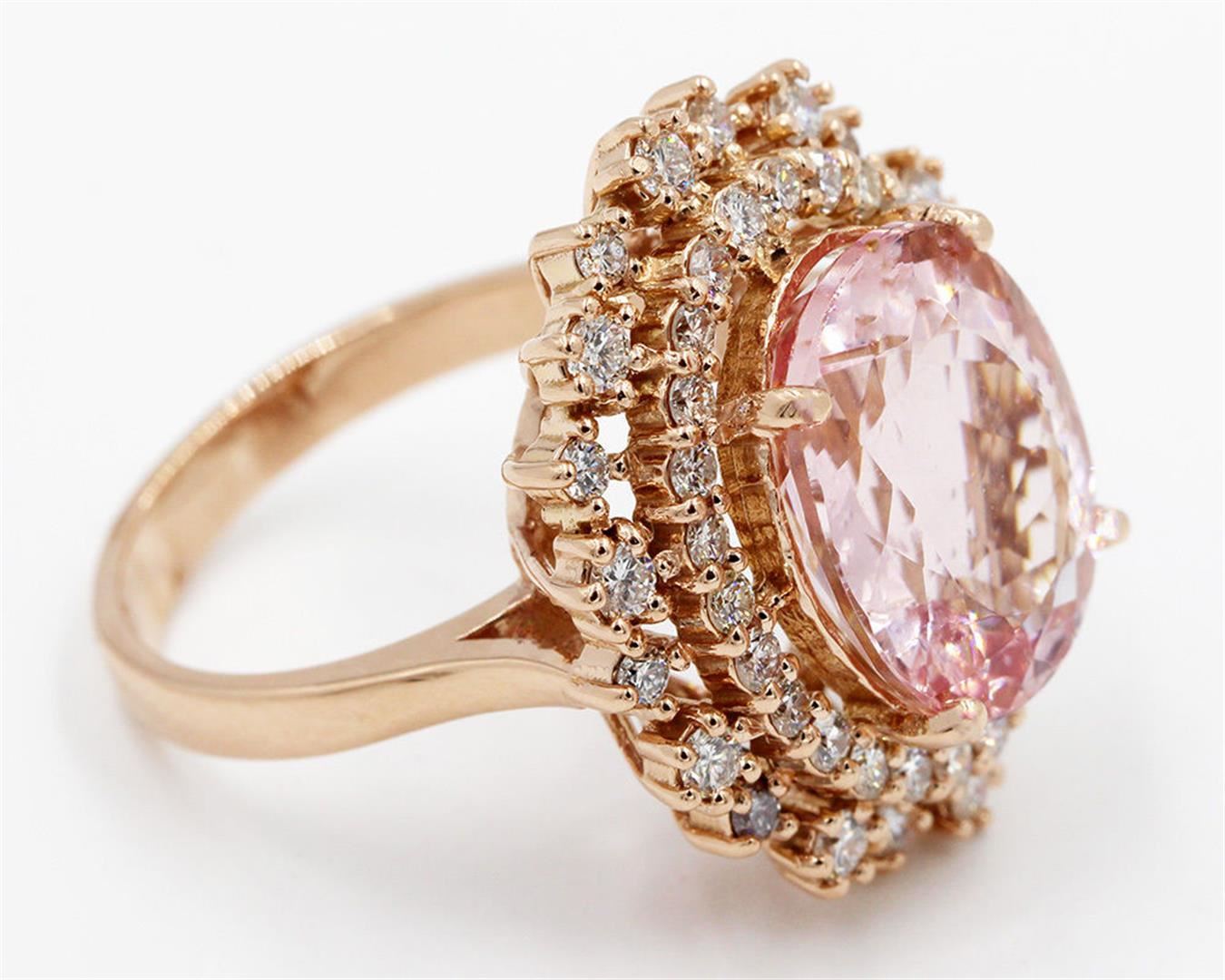 One Pink Morganite Oval and Diamond Engagement Ring in 14k Rose Cold. Total carat weight of ring is 7.18 Ct. Size 6.5 but resizable. Setting style is engagement ring / Morganite set in 4 prongs. Gross weight is 6.60 grams with a total of 47 stones. Condition is brand new. Main stone treatment is natural and non-enhanced. Main stone is 6.23 carats. Main stone shape is oval cut, good clarity, color fine pink morganite, and has an excellent cut. Side stone is natural and non-enhanced. Side diamonds total carats is 0.95 Ct. Side diamond shape is brilliant round cut, SI1 clarity, G-H color, and has an excellent cut. Total number of side diamonds is 46.