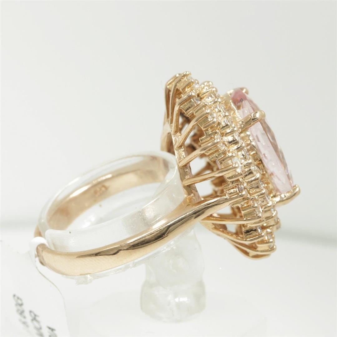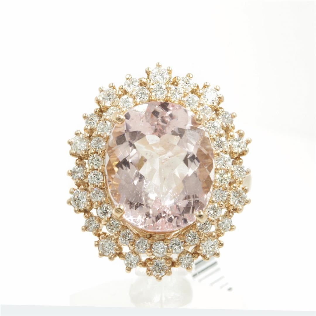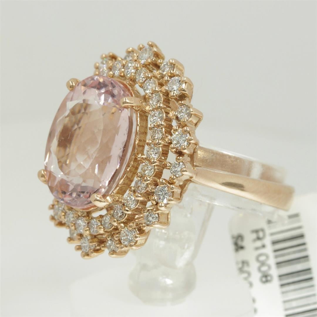 One Pink Morganite Oval and Diamond Engagement Ring in 14k Rose Cold. Total carat weight of ring is 7.18 Ct. Size 6.5 but resizable. Setting style is engagement ring / Morganite set in 4 prongs. Gross weight is 6.60 grams with a total of 47 stones. Condition is brand new. Main stone treatment is natural and non-enhanced. Main stone is 6.23 carats. Main stone shape is oval cut, good clarity, color fine pink morganite, and has an excellent cut. Side stone is natural and non-enhanced. Side diamonds total carats is 0.95 Ct. Side diamond shape is brilliant round cut, SI1 clarity, G-H color, and has an excellent cut. Total number of side diamonds is 46.