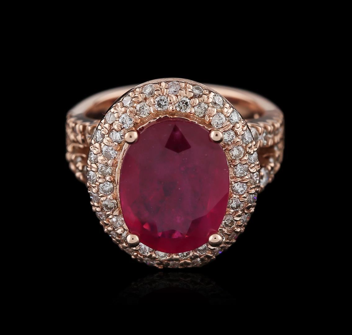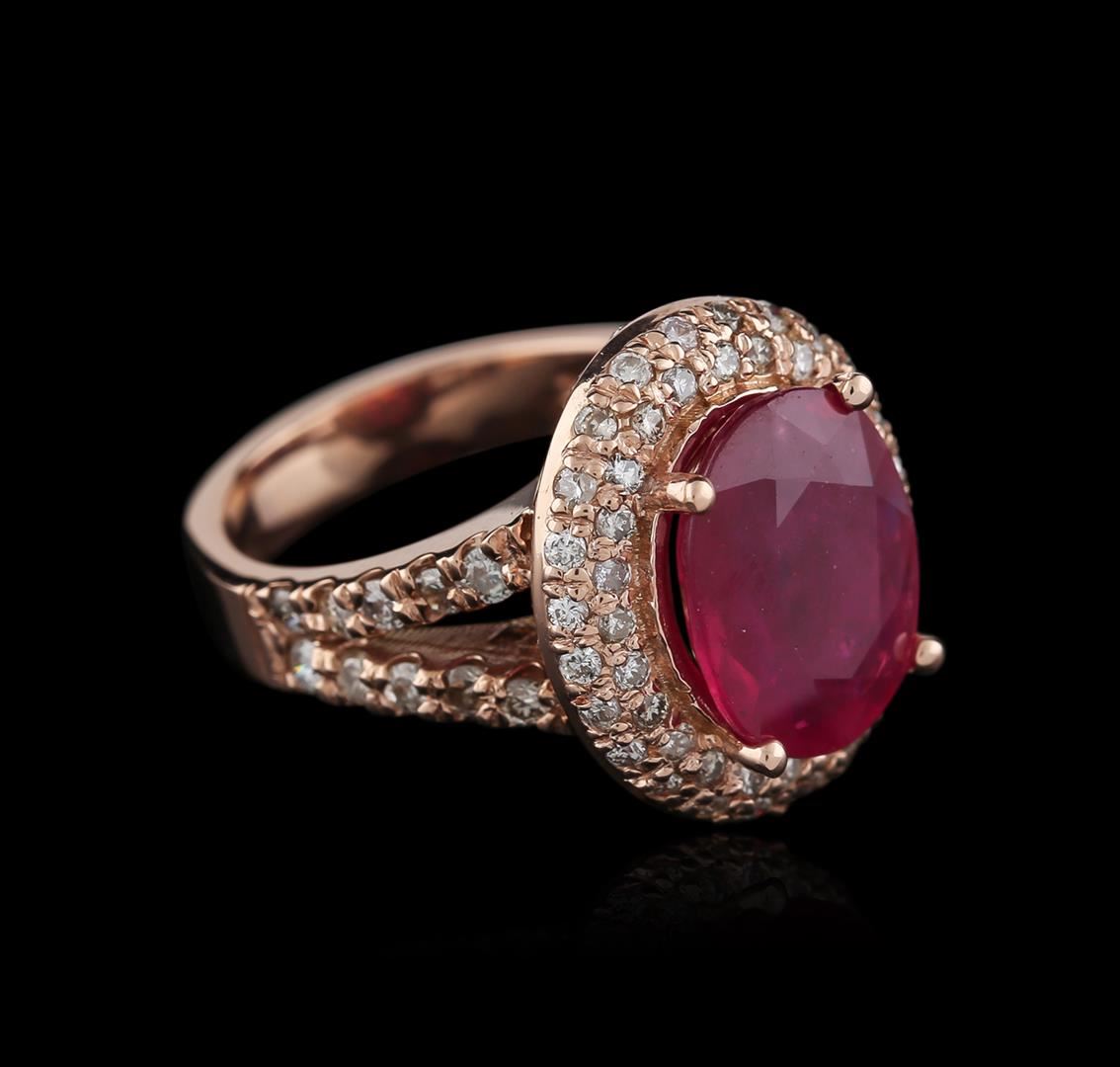 One electronically tested 14KT rose gold ladies cast ruby and diamond ring with a split shoulder shank with a bright polish finish. Identified with markings of "14K". Condition is new. Containing: One prong set oval modified brilliant cut natural ruby, measuring 12.88 x 10.11 x 6.57mm, approximate weight of 7.19ct., clarity is heavily included, type II, medium, very slightly brownish, slightly purplish red color, (GIA slpR 5/3), cut is good. Sixty-Eight prong set round brilliant cut diamonds, measuring 1.90 - 1.30 x 0.96mm (depth est.) approximate total weight of 68 Stones = 1.01ct. Clarity: SI-2 to I-1. Color: L - M, Cut is Good. All diamonds and colored gemstones are graded in the mounting, unless otherwise stated. Colored gemstones are presumed to have been subjected to commonly used enhancement processes.. Total Weight of Colored Stones 7.19ct. Total Weight of Diamonds 1.01ct. Total Weight of Ring 10.20 grams. GGL Appraised at $4,520.00.