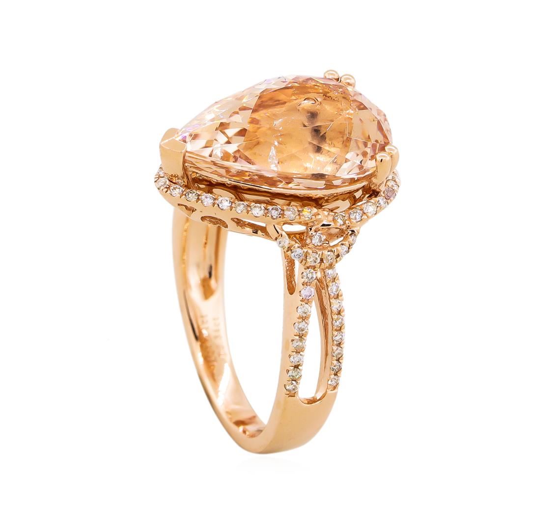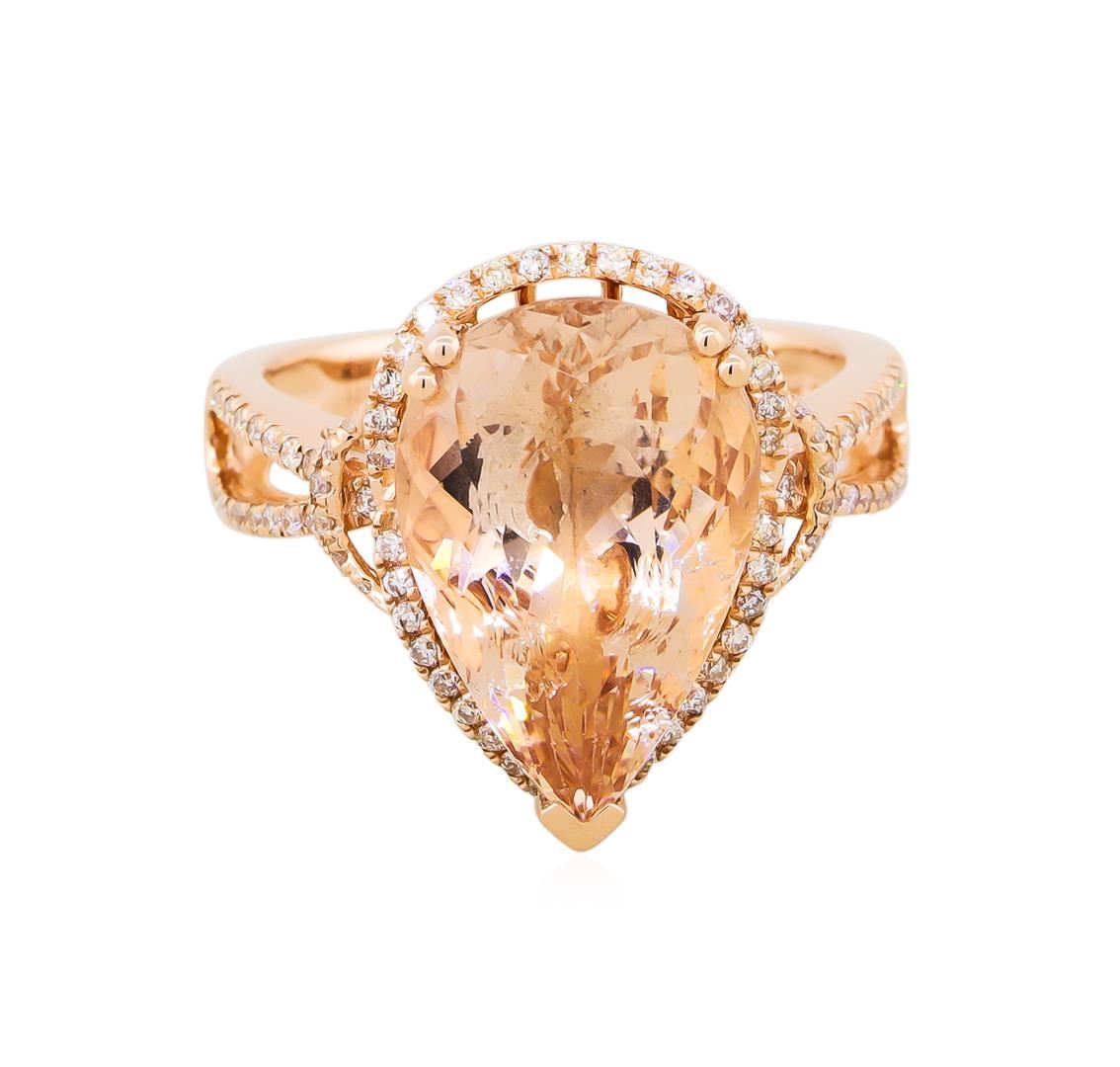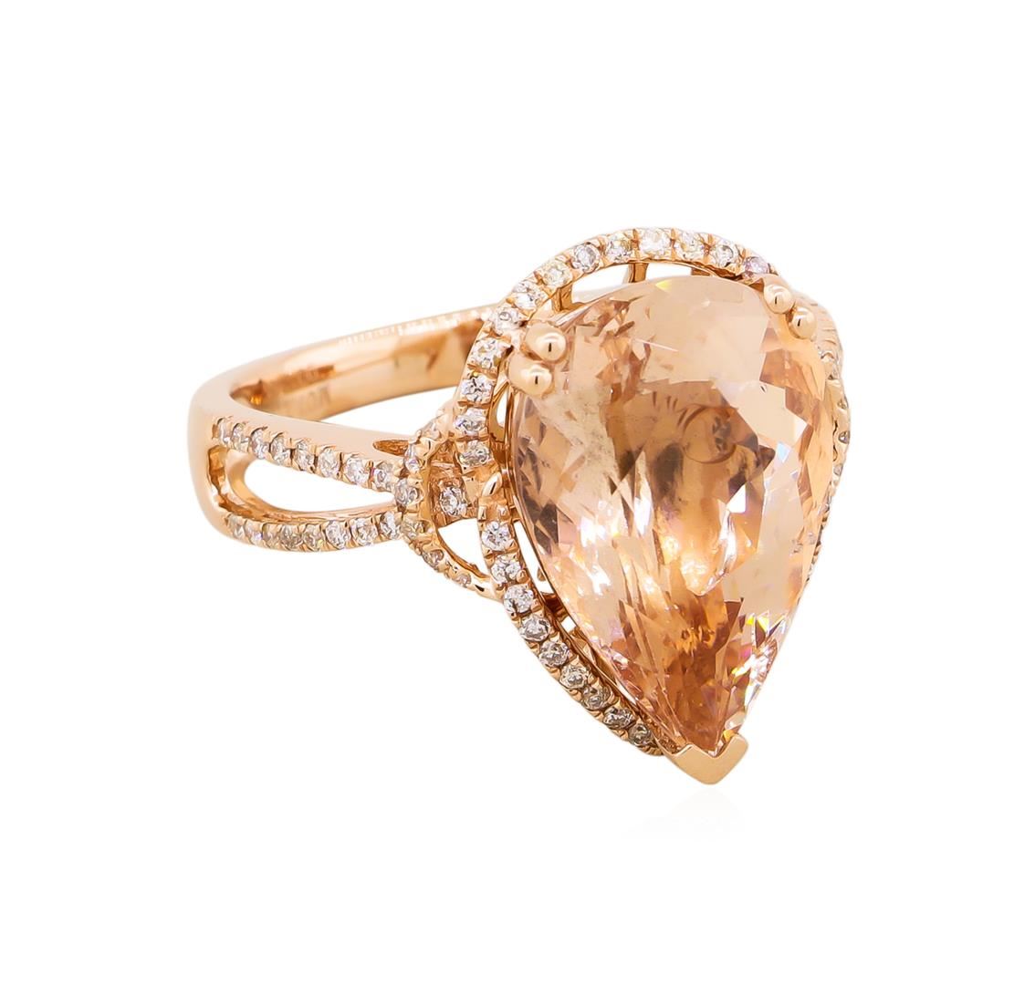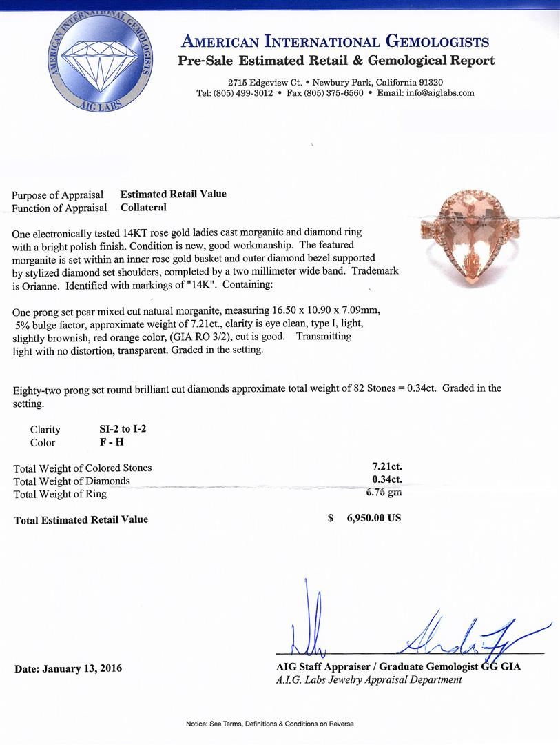 One electronically tested 14KT rose gold ladies cast morganite and diamond ring with a bright polish finish. The featured morganite is set within an inner rose gold basket and outer diamond bezel supported by stylized diamond set shoulders, completed by a two millimeter wide band. Trademark is Orianne. Identified with markings of "14K". Condition is new, good workmanship. Containing: One prong set pear mixed cut natural morganite, measuring 16.50 x 10.90 x 7.09mm, 5%. bulge factor, approximate weight of 7.21ct., clarity is eye clean, type I, light, slightly brownish, red orange color, (GIA RO 3/2), cut is good. Transmitting light with no distortion, transparent. Graded in the setting.Eighty-Two prong set round brilliant cut diamonds approximate. Total Weight of 82 Stones = 0.34ct. Graded in the setting. Clarity: SI-2 to I-2. Color: F - H. Total Weight of Colored Stones 7.21ct. Total Weight of Diamonds 0.34ct. Total Weight of Ring 6.76gm. AIG Appraised at $6,950.00.