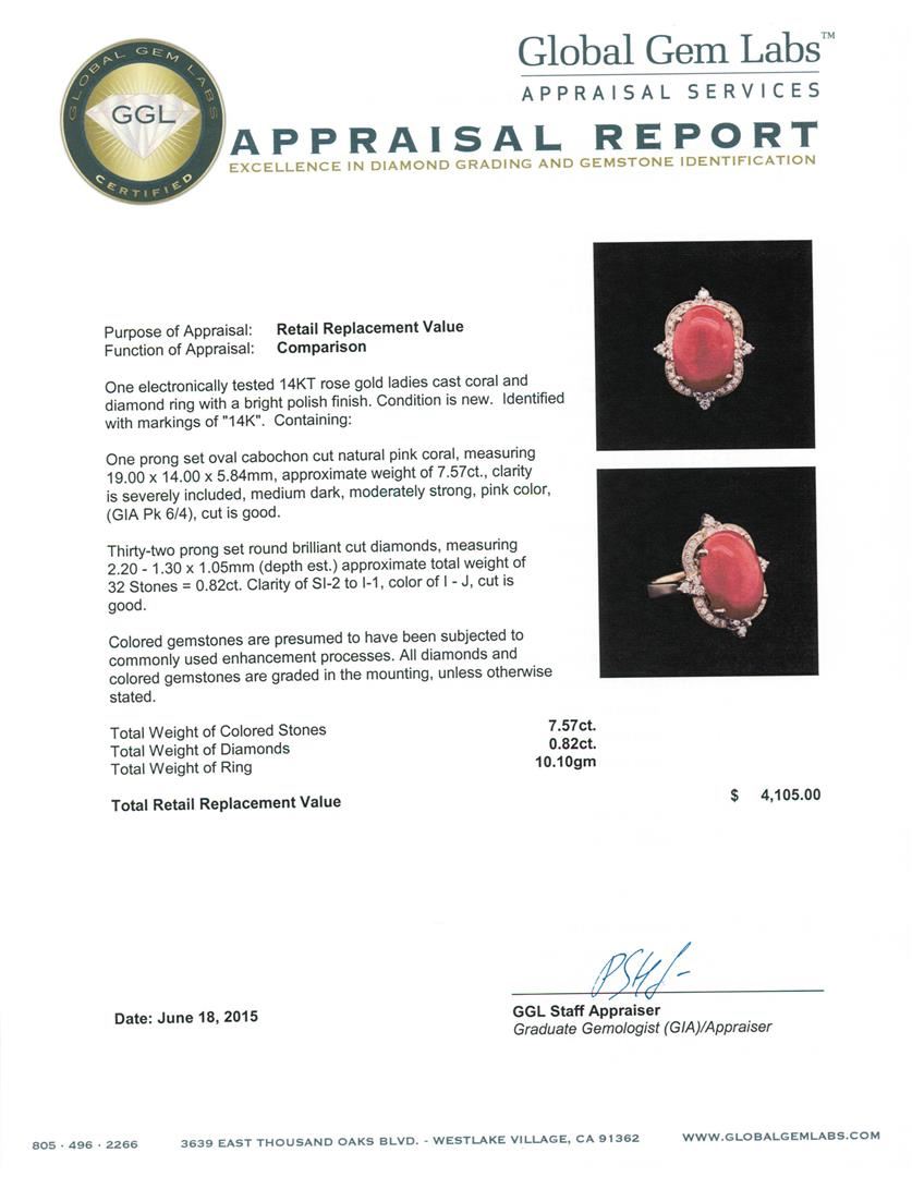 One electronically tested 14KT rose gold ladies cast coral and diamond ring with a bright polish finish. Identified with markings of "14K". Condition is new. Containing: One prong set oval cabochon cut natural pink coral, measuring 19.00 x 14.00 x 5.84mm, approximate weight of 7.57ct., clarity is severely included, medium dark, moderately strong, pink color, (GIA Pk 6/4), cut is good. Thirty-Two prong set round brilliant cut diamonds, measuring 2.20 - 1.30 x 1.05mm (depth est.) approximate total weight of 32 Stones = 0.82ct. Clarity: SI-2 to I-1. Color: I - J, Cut is Good. Colored gemstones are presumed to have been subjected to commonly used enhancement processes. All diamonds and colored gemstones are graded in the mounting, unless otherwise stated. Total Weight of Colored Stones 7.57ct. Total Weight of Diamonds 0.82ct. Total Weight of Ring 10.10 grams. GGL Appraised at $4,105.00.