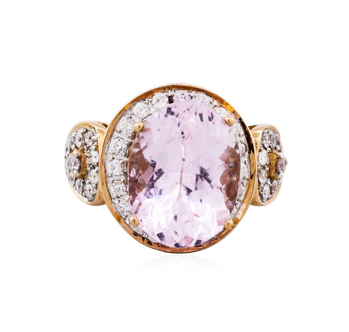 Beautiful morganite and diamond ring set in 14KT rose gold weighing 5.50 grams containing a 7.73 carat oval shaped morganite center stone beautifully framed by 0.71 carats of round diamonds which continue down the both sides.