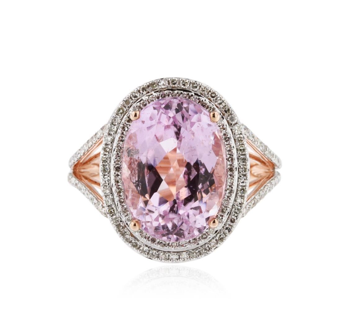 One ring featuring: 14KT rose gold weighing 5.00 grams containing one kunzite with a total weight of 7.76ct and 148 round diamonds with a total weight of 0.62ct.
