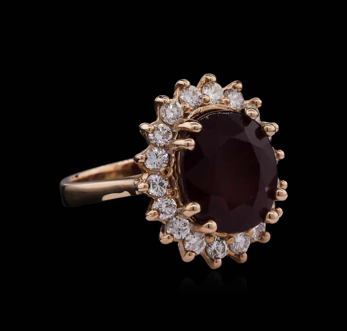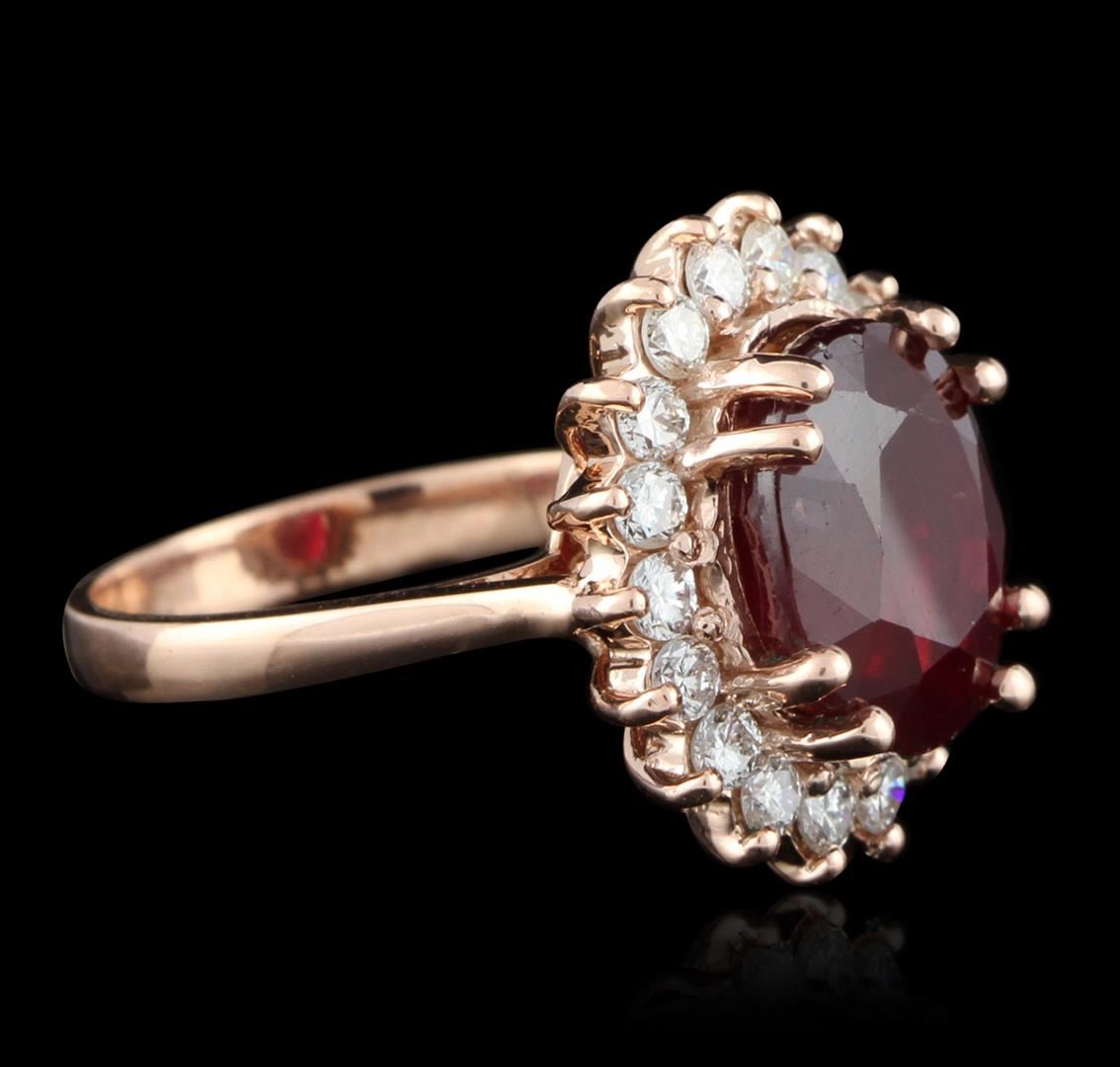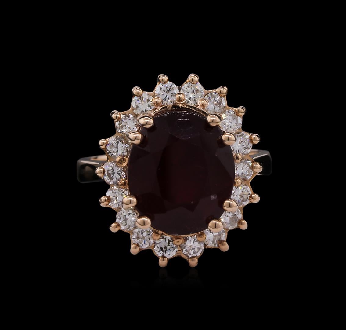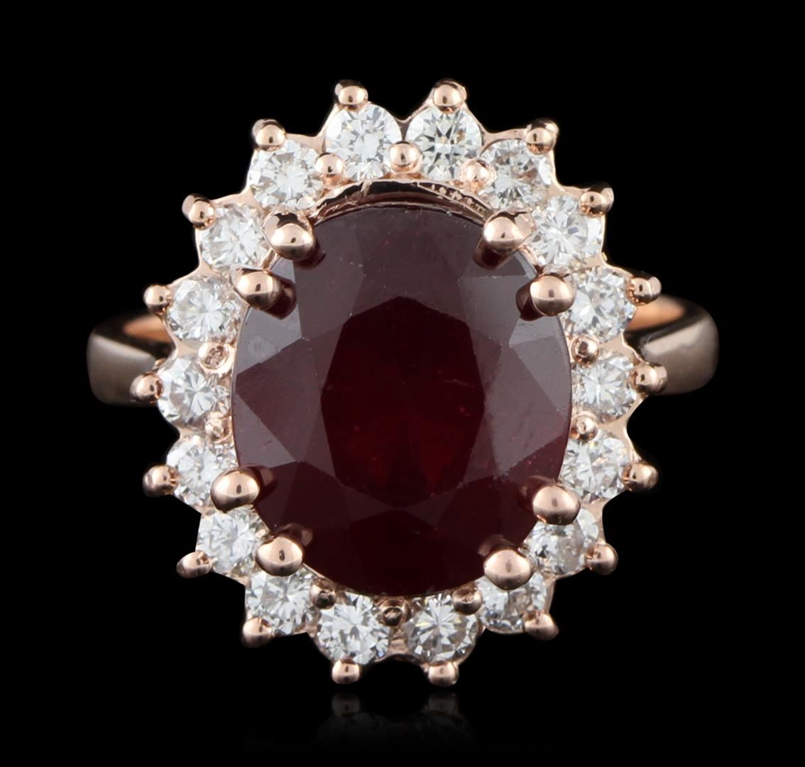 One electronically tested 14KT rose gold ladies cast ruby and diamond ring with a bright polish finish. Condition is new, good workmanship. The featured ruby is set within a diamond bezel, completed by a two and one-half millimeter wide band. Identified with markings of "K14". Containing: One prong set oval mixed cut natural ruby, measuring 11.75 x 10.20 x 7.45mm, approximate weight of 7.94ct., clarity is heavily included, type II, dark, strong, slightly purplish red color, (GIA slpR 7/5), cut is good. Transmitting light somewhat diffusely, transparent to translucent. Naturally occurring internal & external characteristics are present. Indications of laboratory high temperature heat treatment, with glass & flux additives. Colored Stone Grading Report attached. Graded in the setting. Ruby has a low tolerance to rhodium plating, repolishing the surface, & ultrasonic cleaning. Eighteen prong set round brilliant cut diamonds, measuring 2.40 - 2.40 x 1.44mm (depth est.) approximate total weight of 18 Stones = 0.90ct. Graded in the setting. Clarity VS-2 to SI-1. Color F -- H. Total Weight of Colored Stones 7.94ct. Total Weight of Diamonds 0.90ct. Total Weight of Ring 7.50gm. AIG Appraised at $6,885.00.