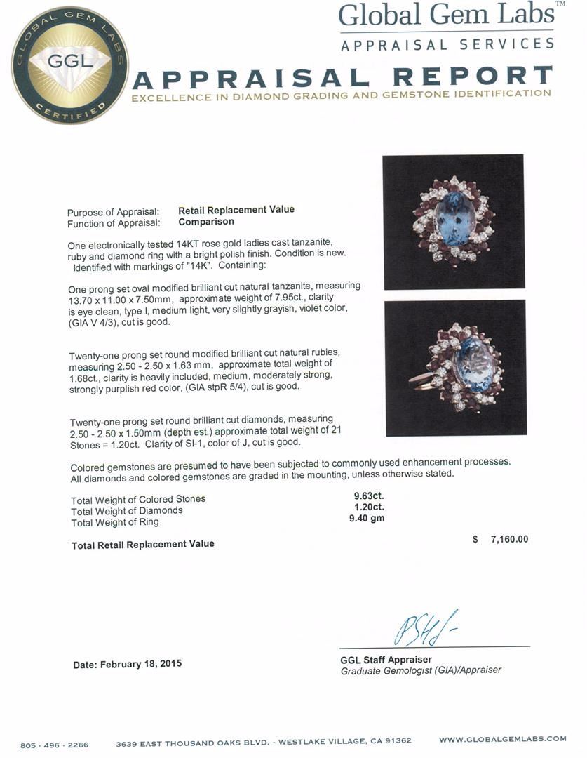 One electronically tested 14KT rose gold ladies cast tanzanite, ruby and diamond ring with a bright polish finish. Identified with markings of "14K". Condition is new. Containing: One prong set oval modified brilliant cut natural tanzanite, measuring 13.70 x 11.00 x 7.50mm, approximate weight of 7.95ct., clarity is eye clean, type I, medium light, very slightly grayish, violet color, (GIA V 4/3), cut is good. Twenty-one prong set round modified brilliant cut natural rubies, measuring 2.50 - 2.50 x 1.63 mm, approximate total weight of 1.68ct., clarity is heavily included, medium, moderately strong, strongly purplish red color, (GIA stpR 5/4), cut is good. Twenty-One prong set round brilliant cut diamonds, measuring 2.50 - 2.50 x 1.50mm (depth est.) approximate total weight of 21 Stones = 1.20ct. Clarity: SI-1. Color: J, Cut is Good. Colored gemstones are presumed to have been subjected to commonly used enhancement processes. All diamonds and colored gemstones are graded in the mounting, unless otherwise stated. Total Weight of Colored Stones 9.63ct. Total Weight of Diamonds 1.20ct. Total Weight of Ring 9.40 grams. GGL Appraised at $7,160.00.