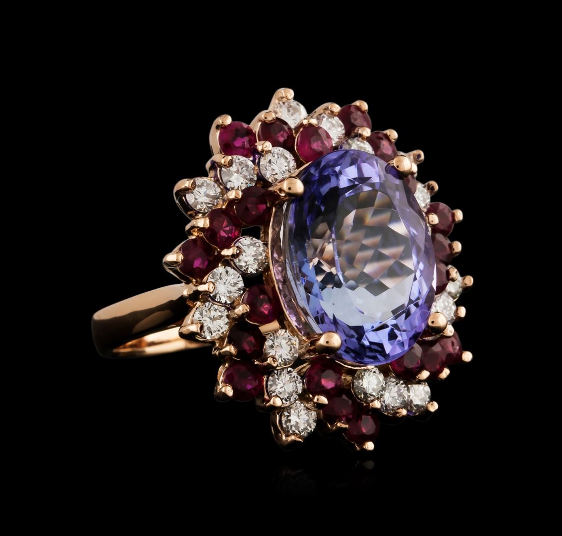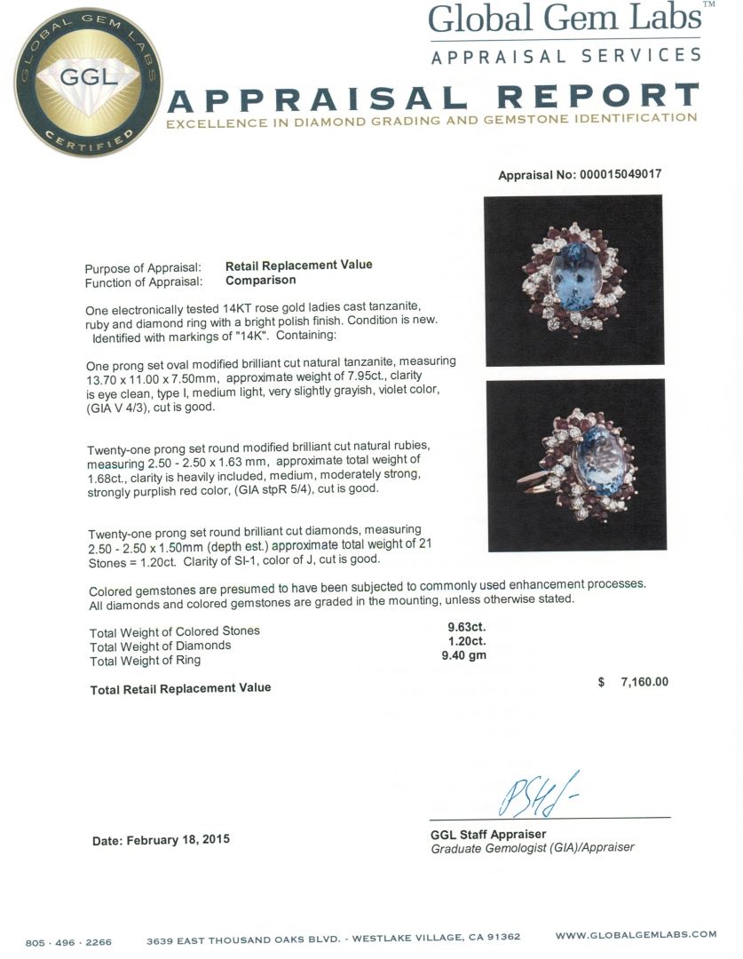 One electronically tested 14KT rose gold ladies cast tanzanite, ruby and diamond ring with a bright polish finish. Identified with markings of "14K". Condition is new. Containing: One prong set oval modified brilliant cut natural tanzanite, measuring 13.70 x 11.00 x 7.50mm, approximate weight of 7.95ct., clarity is eye clean, type I, medium light, very slightly grayish, violet color, (GIA V 4/3), cut is good. Twenty-one prong set round modified brilliant cut natural rubies, measuring 2.50 - 2.50 x 1.63 mm, approximate total weight of 1.68ct., clarity is heavily included, medium, moderately strong, strongly purplish red color, (GIA stpR 5/4), cut is good. Twenty-One prong set round brilliant cut diamonds, measuring 2.50 - 2.50 x 1.50mm (depth est.) approximate total weight of 21 Stones = 1.20ct. Clarity: SI-1. Color: J, Cut is Good. Colored gemstones are presumed to have been subjected to commonly used enhancement processes. All diamonds and colored gemstones are graded in the mounting, unless otherwise stated. Total Weight of Colored Stones 9.63ct. Total Weight of Diamonds 1.20ct. Total Weight of Ring 9.40 grams. GGL Appraised at $7,160.00.