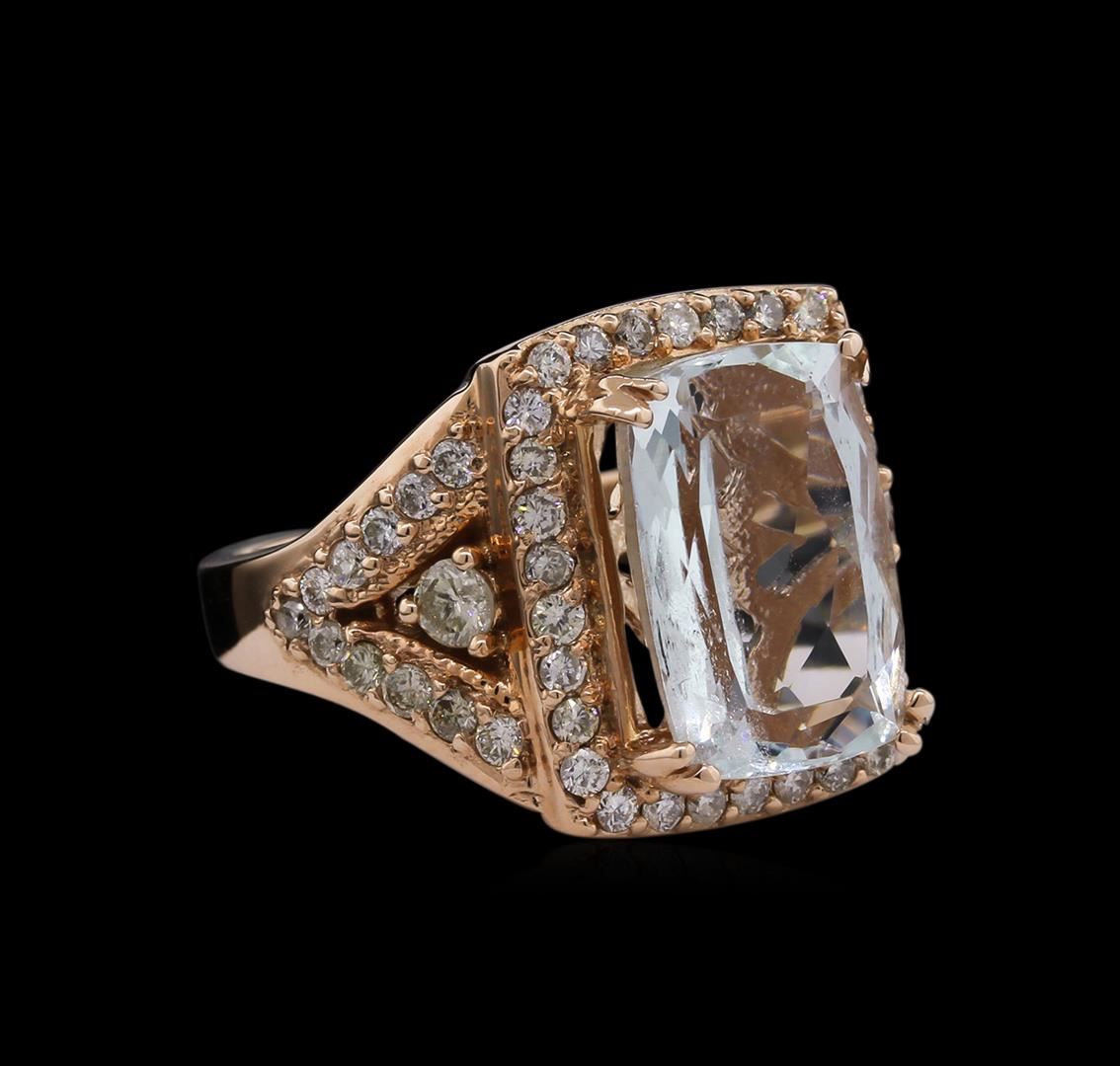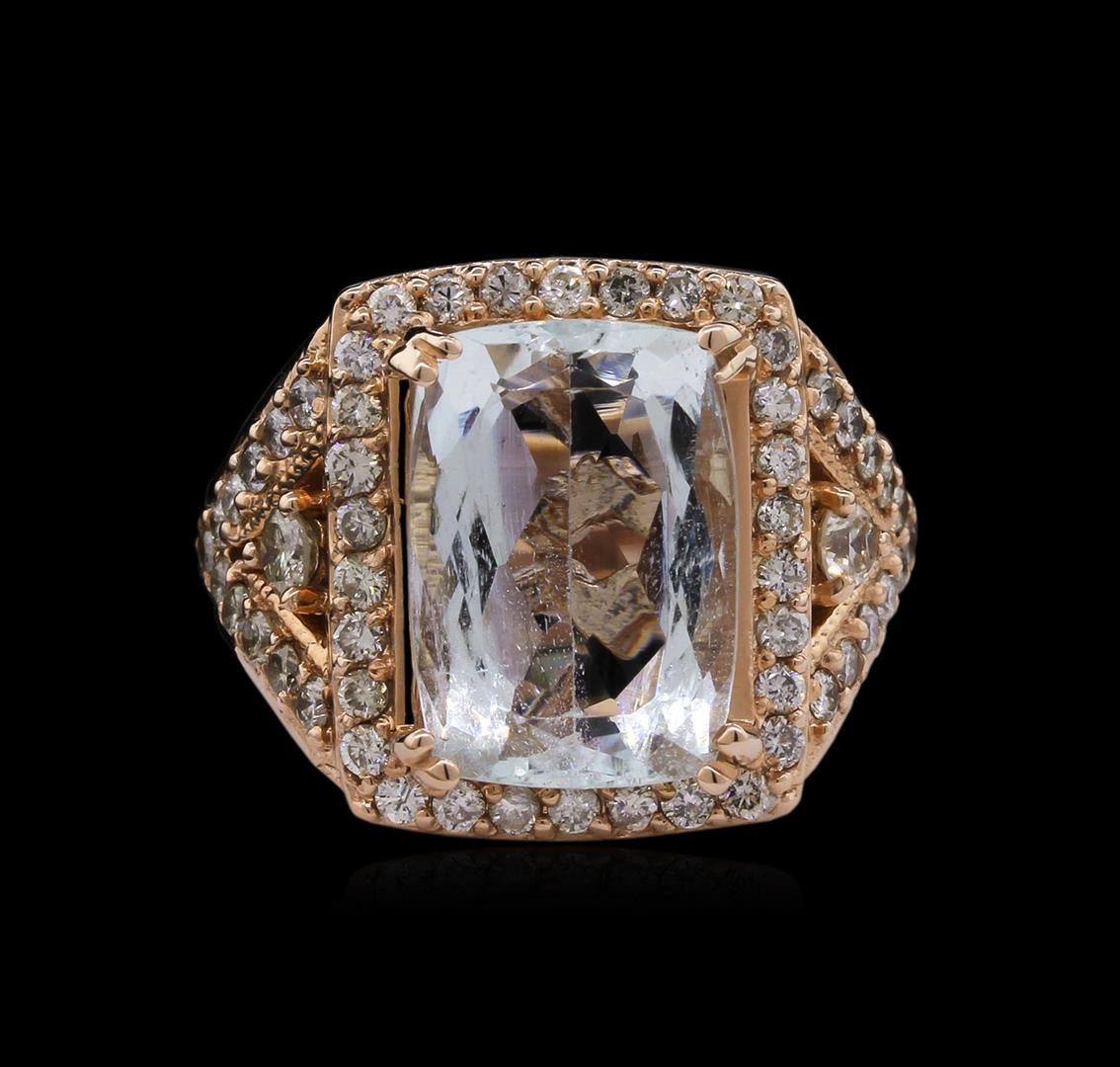 One electronically tested 14KT rose gold ladies cast aquamarine and diamond ring. The featured aquamarine is set within a diamond bezel supported by elaborate diamond set shoulders, completed by a two and one-half millimeter wide band. Bright polish finish with milgrain detailing. Trademark is SA. Identified with markings of "14K". Condition is new, good workmanship. Containing: One prong set rectangular cushion mixed cut natural aquamarine, measuring 14.50 x 10.20 x 7.65mm, 10%. bulge factor, approximate weight of 7.96ct., clarity is slightly included, type I, medium light, very slightly grayish, very slightly greenish blue color, (GIA vslgB 4/3), cut is good. Transmitting light with no distortion, transparent. Naturally occurring internal & external characteristics are present. Colored Stone Grading Report attached. Graded in the setting. Two prong set round brilliant cut diamonds, measuring 3.20 - 3.10 x 1.89mm (depth est.) approximate. Total Weight of 2 Stones = 0.25ct. Graded in the setting. Clarity: I-1. Color: H - I Fifty-Two prong set round brilliant cut diamonds, measuring 1.80 - 1.70 x 1.05mm (depth est.) approximate. Total Weight of 52 Stones = 1.12ct. Faint brown secondary color throughout. Graded in the setting. Clarity: SI-1 to I-1. Color: I - K. Total Weight of Colored Stones 7.96ct. Total Weight of Diamonds 1.37ct. AIG Appraised at $9,475.00.