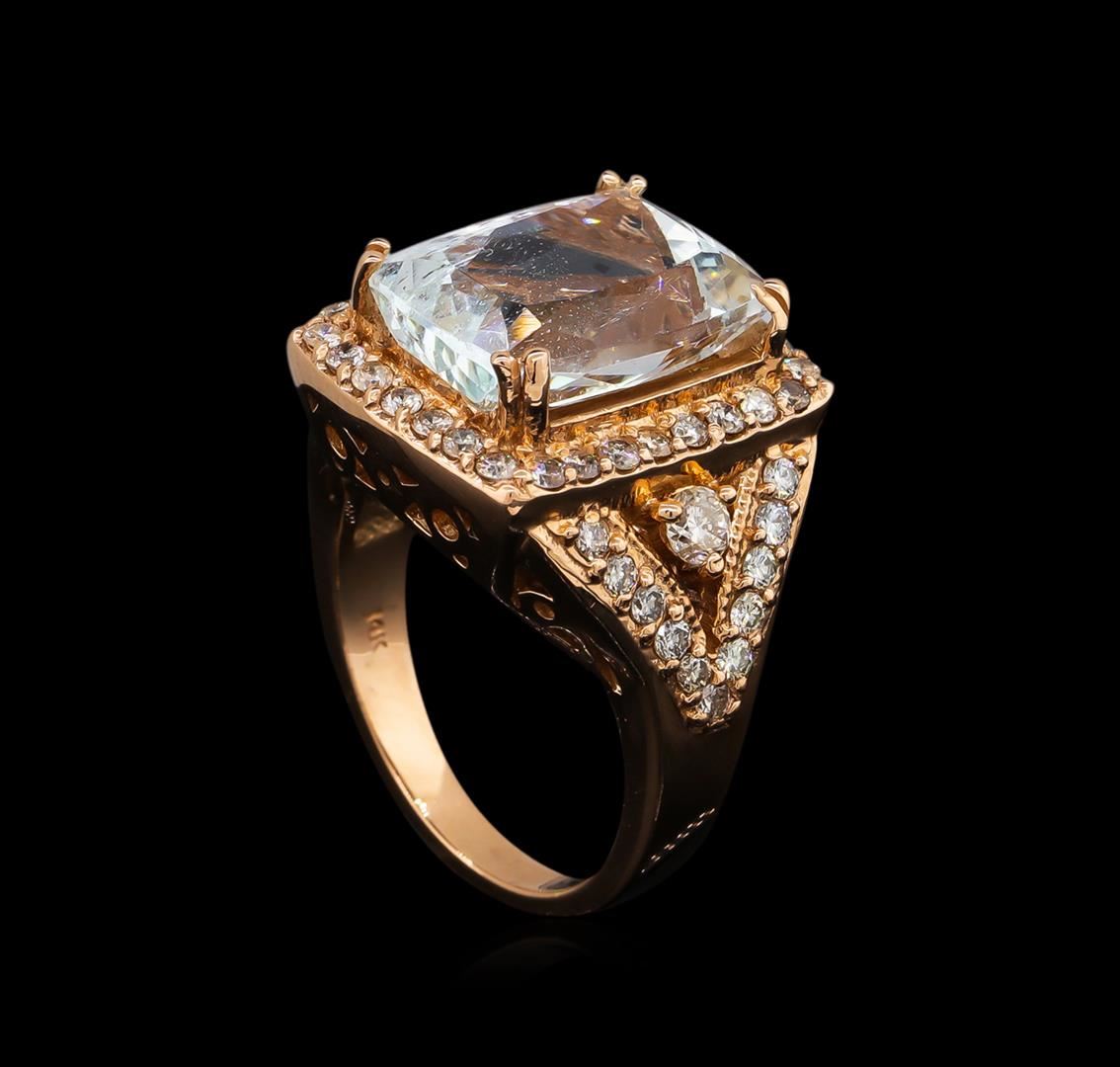 One electronically tested 14KT rose gold ladies cast aquamarine and diamond ring. The featured aquamarine is set within a diamond bezel supported by elaborate diamond set shoulders, completed by a two and one-half millimeter wide band. Bright polish finish with milgrain detailing. Trademark is SA. Identified with markings of "14K". Condition is new, good workmanship. Containing: One prong set rectangular cushion mixed cut natural aquamarine, measuring 14.50 x 10.20 x 7.65mm, 10%. bulge factor, approximate weight of 7.96ct., clarity is slightly included, type I, medium light, very slightly grayish, very slightly greenish blue color, (GIA vslgB 4/3), cut is good. Transmitting light with no distortion, transparent. Naturally occurring internal & external characteristics are present. Colored Stone Grading Report attached. Graded in the setting. Two prong set round brilliant cut diamonds, measuring 3.20 - 3.10 x 1.89mm (depth est.) approximate. Total Weight of 2 Stones = 0.25ct. Graded in the setting. Clarity: I-1. Color: H - I Fifty-Two prong set round brilliant cut diamonds, measuring 1.80 - 1.70 x 1.05mm (depth est.) approximate. Total Weight of 52 Stones = 1.12ct. Faint brown secondary color throughout. Graded in the setting. Clarity: SI-1 to I-1. Color: I - K. Total Weight of Colored Stones 7.96ct. Total Weight of Diamonds 1.37ct. AIG Appraised at $9,475.00.