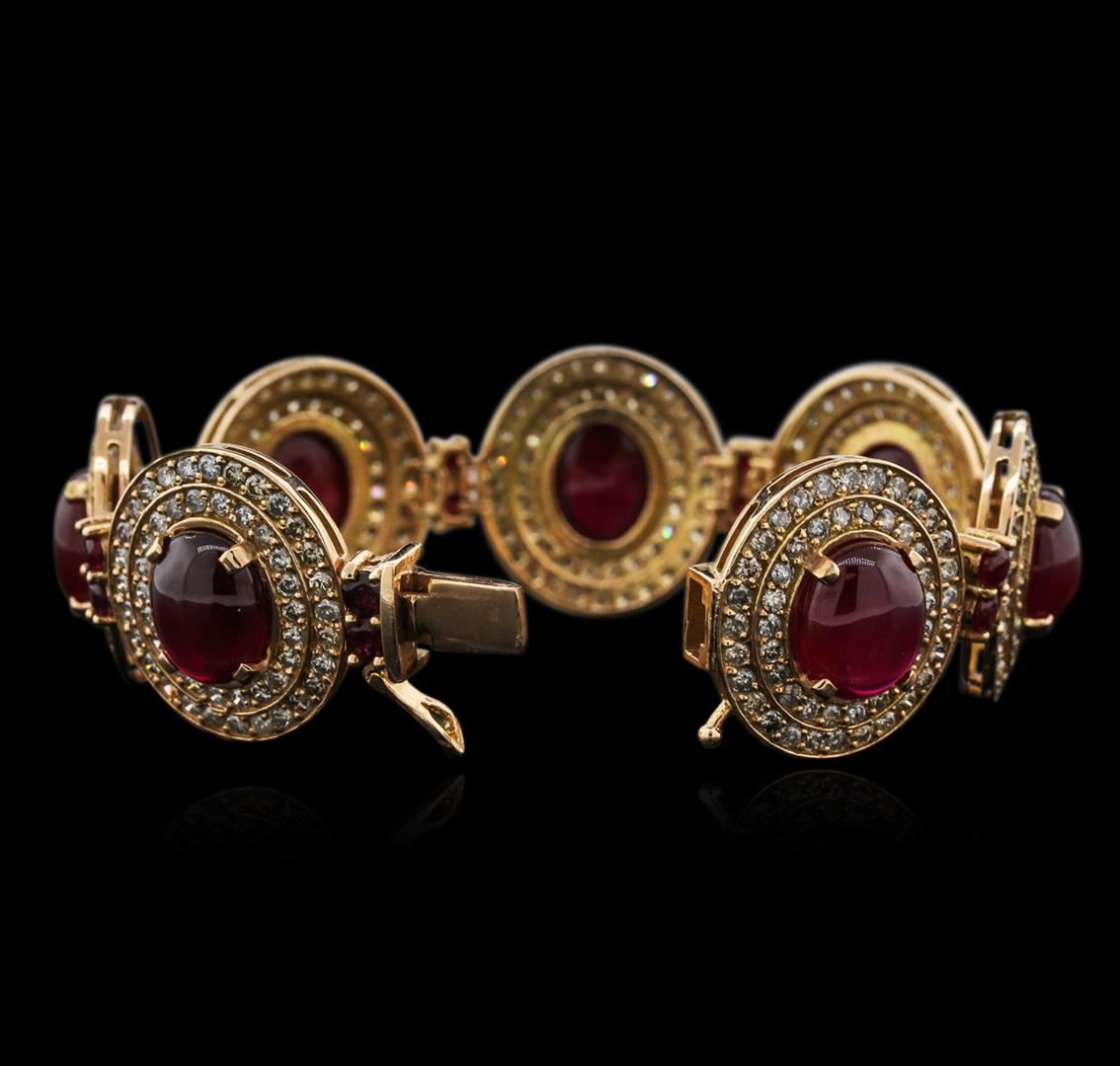 One electronically tested 14KT rose gold ladies cast ruby and diamond bracelet with a hidden box clasp with safety closer with a bright polish finish. Measurements: 7" in length. Identified with markings of "14K". Condition is new. Containing: Nine prong set oval cabochon cut natural rubies, measuring 12.00 x 10.00 x 5.90mm, approximate total weight of 68.85ct., clarity is moderately included, type II, dark, very slightly brownish, strongly purplish red color, (GIA stpR 7/3), cut is good. Eighteen prong set round modified brilliant cut natural rubies, measuring 3.50 - 3.50 x 2.28 mm, approximate total weight of 3.96ct., clarity is heavily included, type II, dark, moderately strong, strongly purplish red color, (GIA stpR 7/4), cut is good. Three Hundred Forty-Three prong set round brilliant cut diamonds, measuring 1.70 - 1.70 x 1.02mm (depth est.) approximate total weight of 343 Stones = 6.14ct. Clarity: I-1 to I-3. Color: K - L, Cut is Good. Diamonds and colored gemstones are graded in the mounting, unless otherwise stated. Colored gemstones are presumed to have been subjected to commonly used enhancement processes. Total Weight of Colored Stones 72.81ct. Total Weight of Diamonds 6.14ct. Total Weight of Bracelet 52.30 grams. GGL Appraised at $16,990.00.