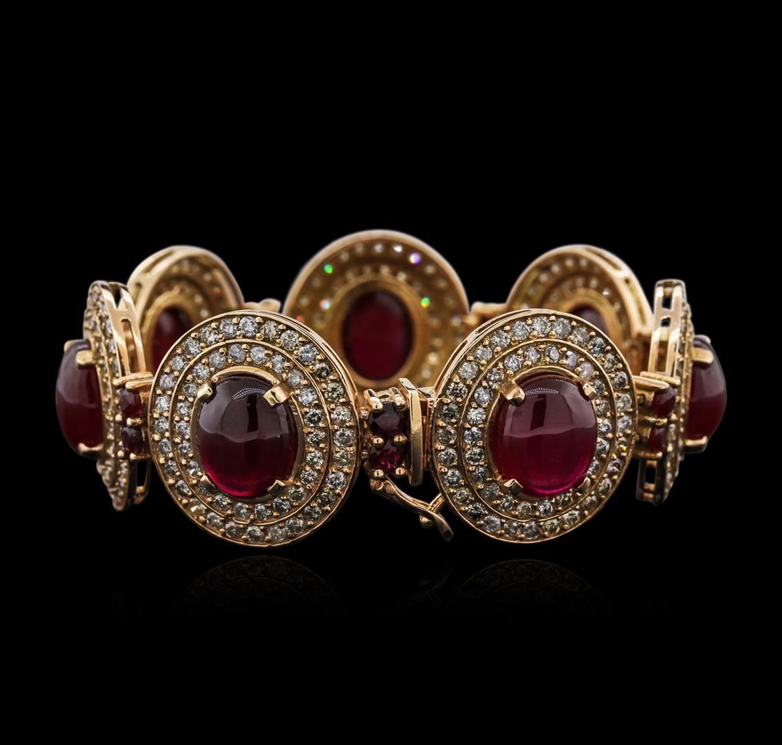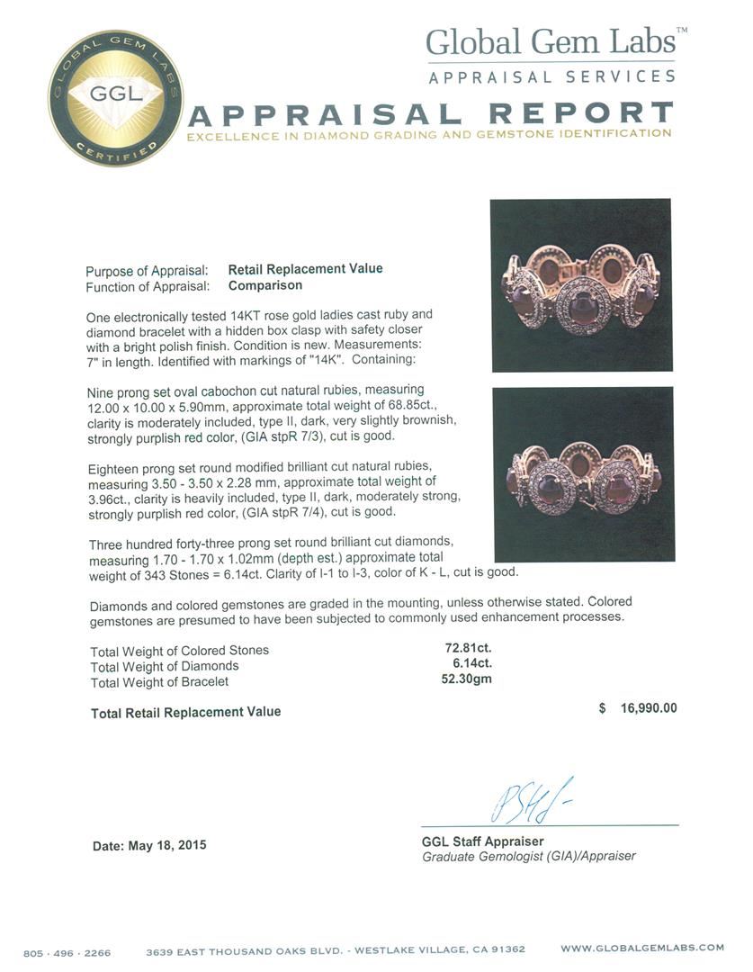 One electronically tested 14KT rose gold ladies cast ruby and diamond bracelet with a hidden box clasp with safety closer with a bright polish finish. Measurements: 7" in length. Identified with markings of "14K". Condition is new. Containing: Nine prong set oval cabochon cut natural rubies, measuring 12.00 x 10.00 x 5.90mm, approximate total weight of 68.85ct., clarity is moderately included, type II, dark, very slightly brownish, strongly purplish red color, (GIA stpR 7/3), cut is good. Eighteen prong set round modified brilliant cut natural rubies, measuring 3.50 - 3.50 x 2.28 mm, approximate total weight of 3.96ct., clarity is heavily included, type II, dark, moderately strong, strongly purplish red color, (GIA stpR 7/4), cut is good. Three Hundred Forty-Three prong set round brilliant cut diamonds, measuring 1.70 - 1.70 x 1.02mm (depth est.) approximate total weight of 343 Stones = 6.14ct. Clarity: I-1 to I-3. Color: K - L, Cut is Good. Diamonds and colored gemstones are graded in the mounting, unless otherwise stated. Colored gemstones are presumed to have been subjected to commonly used enhancement processes. Total Weight of Colored Stones 72.81ct. Total Weight of Diamonds 6.14ct. Total Weight of Bracelet 52.30 grams. GGL Appraised at $16,990.00.