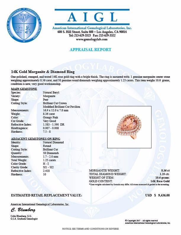 One 14KT Rose Gold 8.36ct Morganite and Diamond Ring. (1) Morganite stone with a total weight of 8.36cts. (58) diamonds with a total weight of 1.25cts. Total weight of this ring is 10.6 grams.