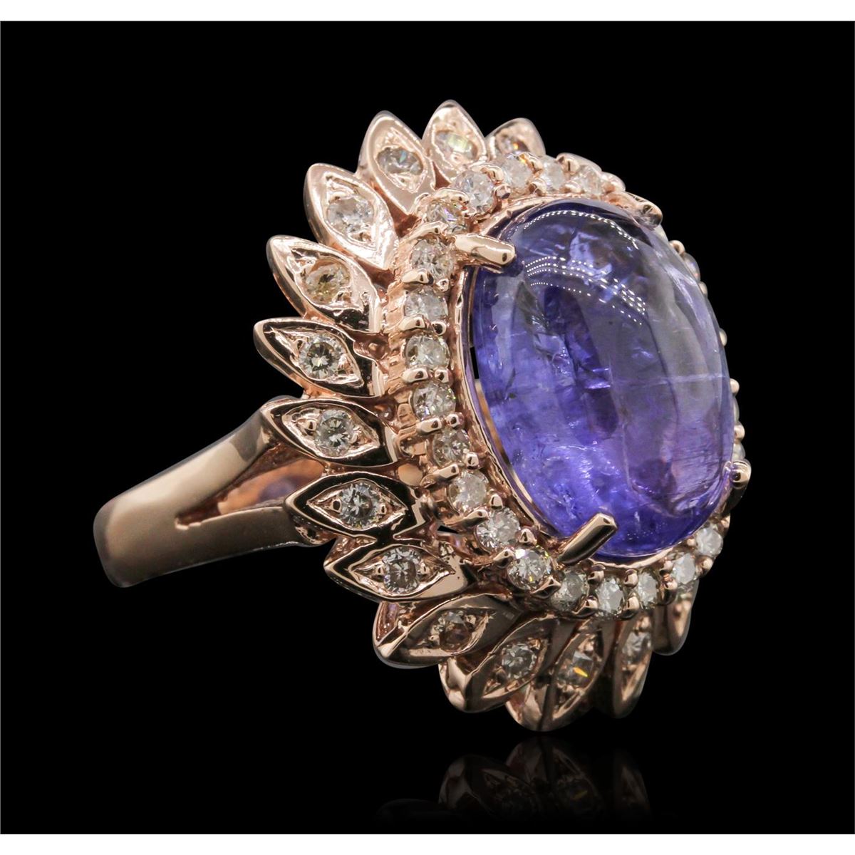One electronically tested 14KT rose gold Ladies cast fancy ring with a bright polish finish. Condition is new. Identified with markings of "14K". Containing: One prong set oval cabochon cut natural tanzanite, measuring 14.00 x 10.00 x 6.50mm, approximate weight of 8.53ct., clarity is heavily included, medium light, very slightly grayish, violet color, (GIA V 4/3), cut is good. Colored gemstones are presumed to have been subjected to commonly used color/clarity enhancement processes. Forty-Six prong set round brilliant cut diamonds, measuring 1.80 - 1.80 x 1.08mm (depth est.) approximate. Total Weight of 46 Stones = 1.16ct. Clarity: SI-1 to SI-2. Color: K - L, Cut is Good. Total Weight of Colored Stones 8.53ct. Total Weight of Diamonds 1.16ct. Total Weight of Ring 12.50 grams. GGL Appraised at $12,770.00.