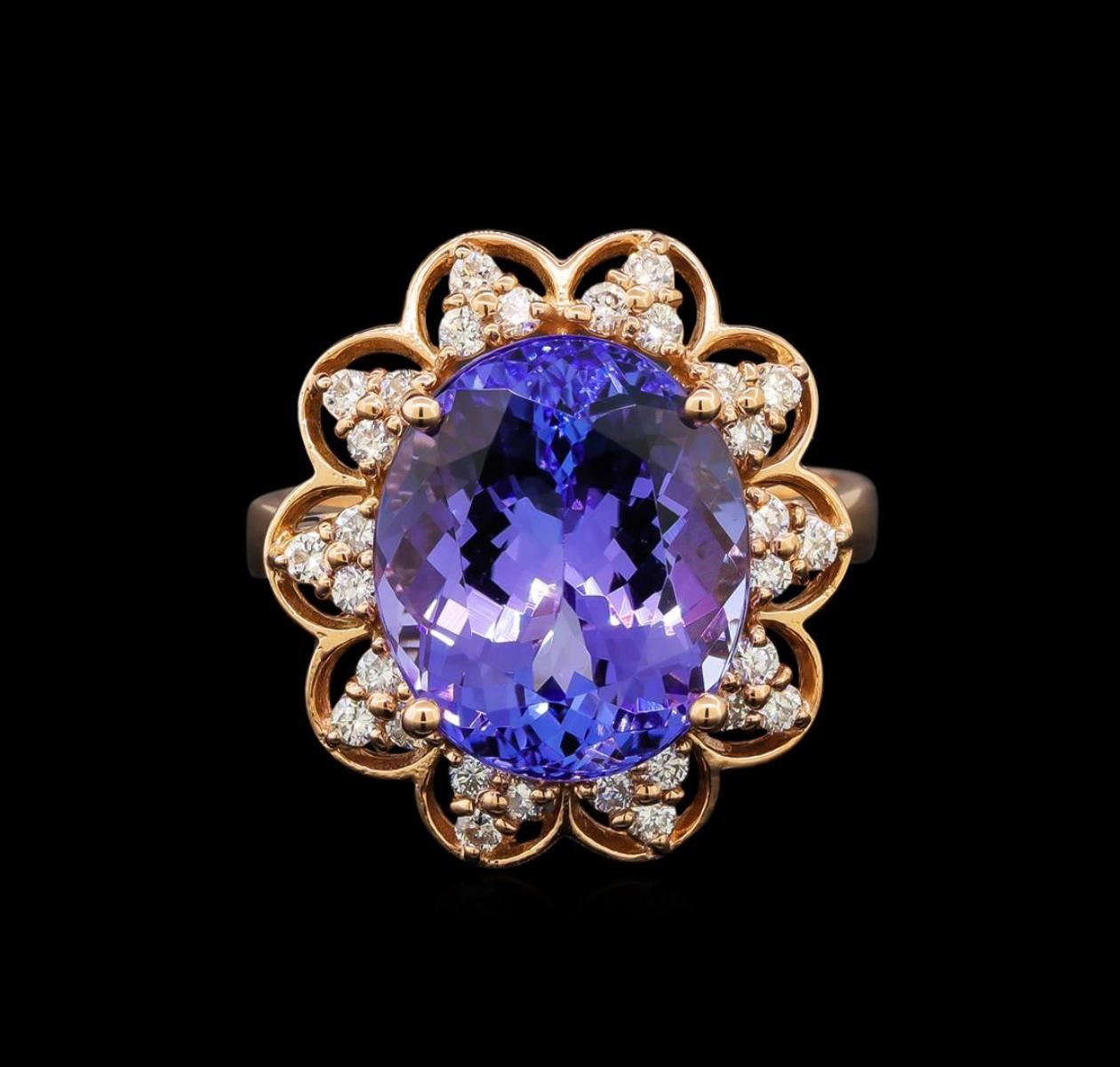 One electronically tested 14KT rose gold ladies cast tanzanite and diamond ring with a bright polish finish. Identified with markings of "K14". Condition is new. Containing: One prong set oval modified brilliant cut natural tanzanite, measuring 13.00 x 11.10 x 8.45mm, approximate weight of 8.58ct., clarity is eye clean, type I, medium light, slightly grayish, violet color, (GIA V 4/2), cut is good. Thirty prong set round brilliant cut diamonds, measuring 1.30 - 1.30 x 0.78mm (depth est.) approximate total weight of 30 Stones = 0.24ct. Clarity: SI-1 to I-1. Color: H - I, Cut is Good. Colored gemstones are presumed to have been subjected to commonly used enhancement processes. All diamonds and colored gemstones are graded in the mounting, unless otherwise stated. Total Weight of Colored Stones 8.58ct. Total Weight of Diamonds 0.24ct. Total Weight of Ring 7.00 grams. GGL Appraised.