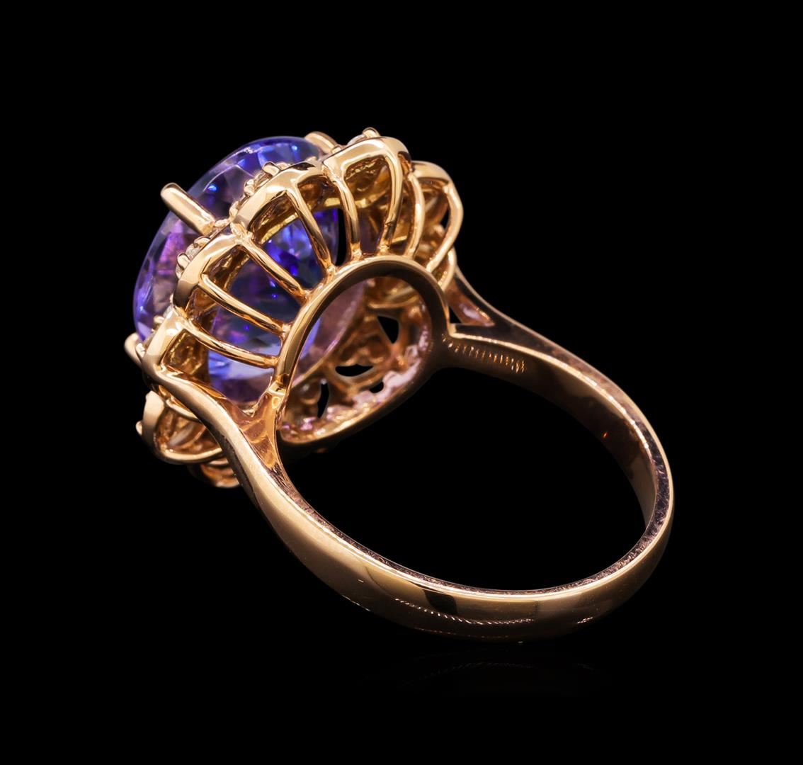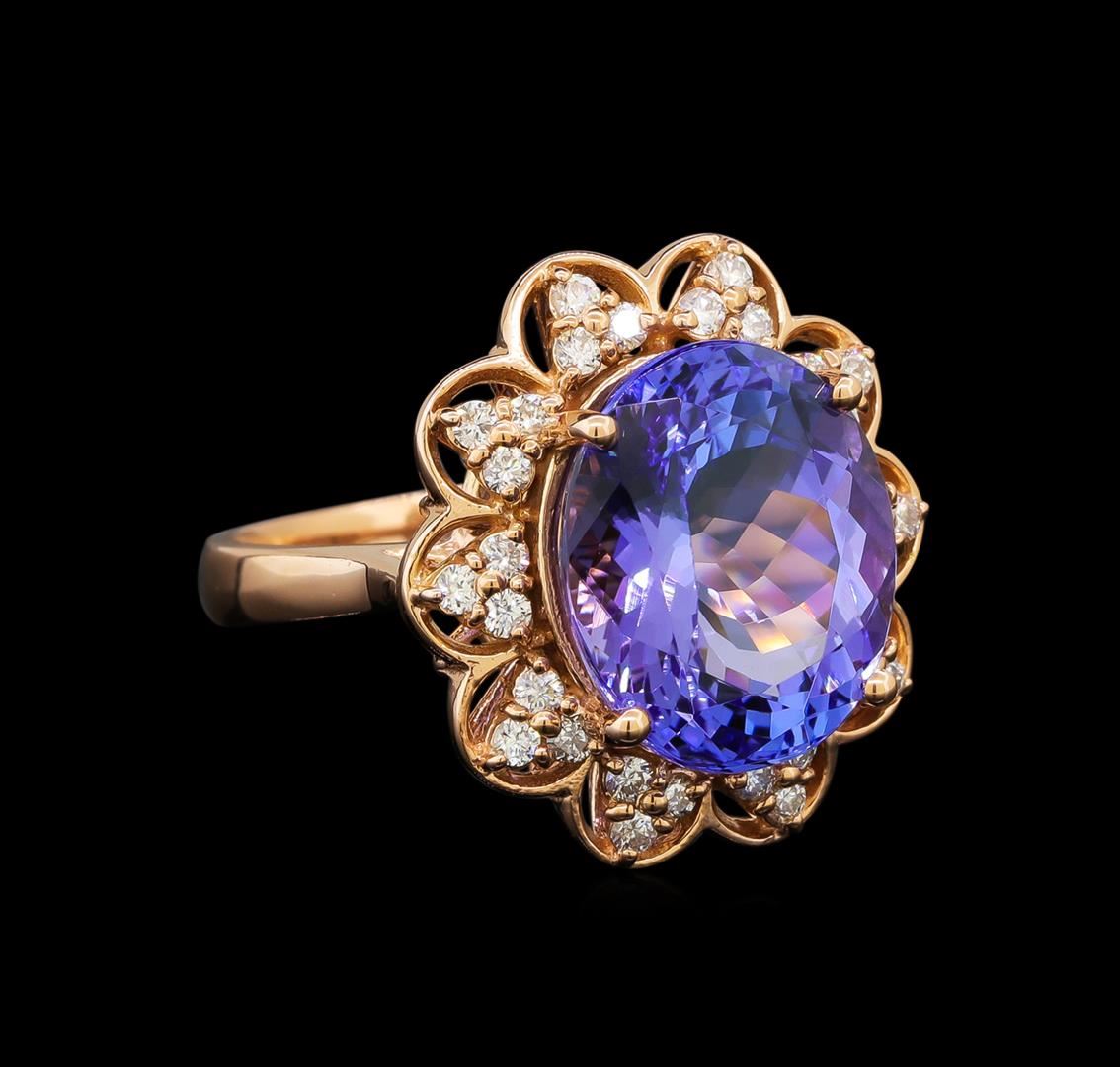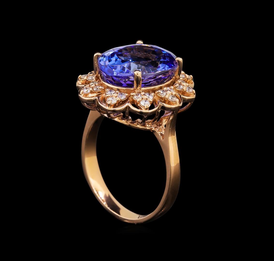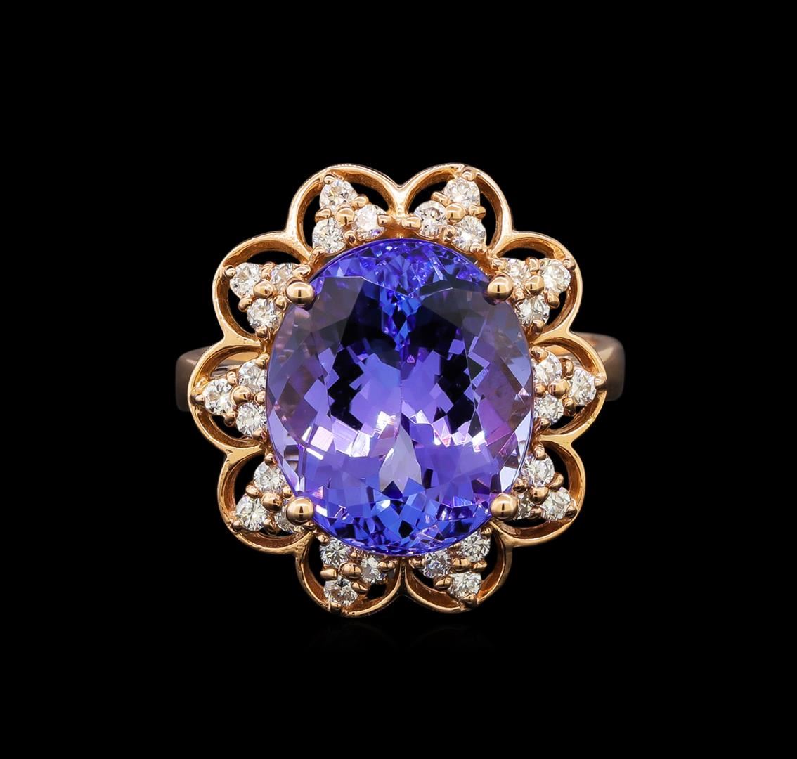 One electronically tested 14KT rose gold ladies cast tanzanite and diamond ring with a bright polish finish. Identified with markings of "K14". Condition is new. Containing: One prong set oval modified brilliant cut natural tanzanite, measuring 13.00 x 11.10 x 8.45mm, approximate weight of 8.58ct., clarity is eye clean, type I, medium light, slightly grayish, violet color, (GIA V 4/2), cut is good. Thirty prong set round brilliant cut diamonds, measuring 1.30 - 1.30 x 0.78mm (depth est.) approximate total weight of 30 Stones = 0.24ct. Clarity: SI-1 to I-1. Color: H - I, Cut is Good. Colored gemstones are presumed to have been subjected to commonly used enhancement processes. All diamonds and colored gemstones are graded in the mounting, unless otherwise stated. Total Weight of Colored Stones 8.58ct. Total Weight of Diamonds 0.24ct. Total Weight of Ring 7.00 grams. GGL Appraised.