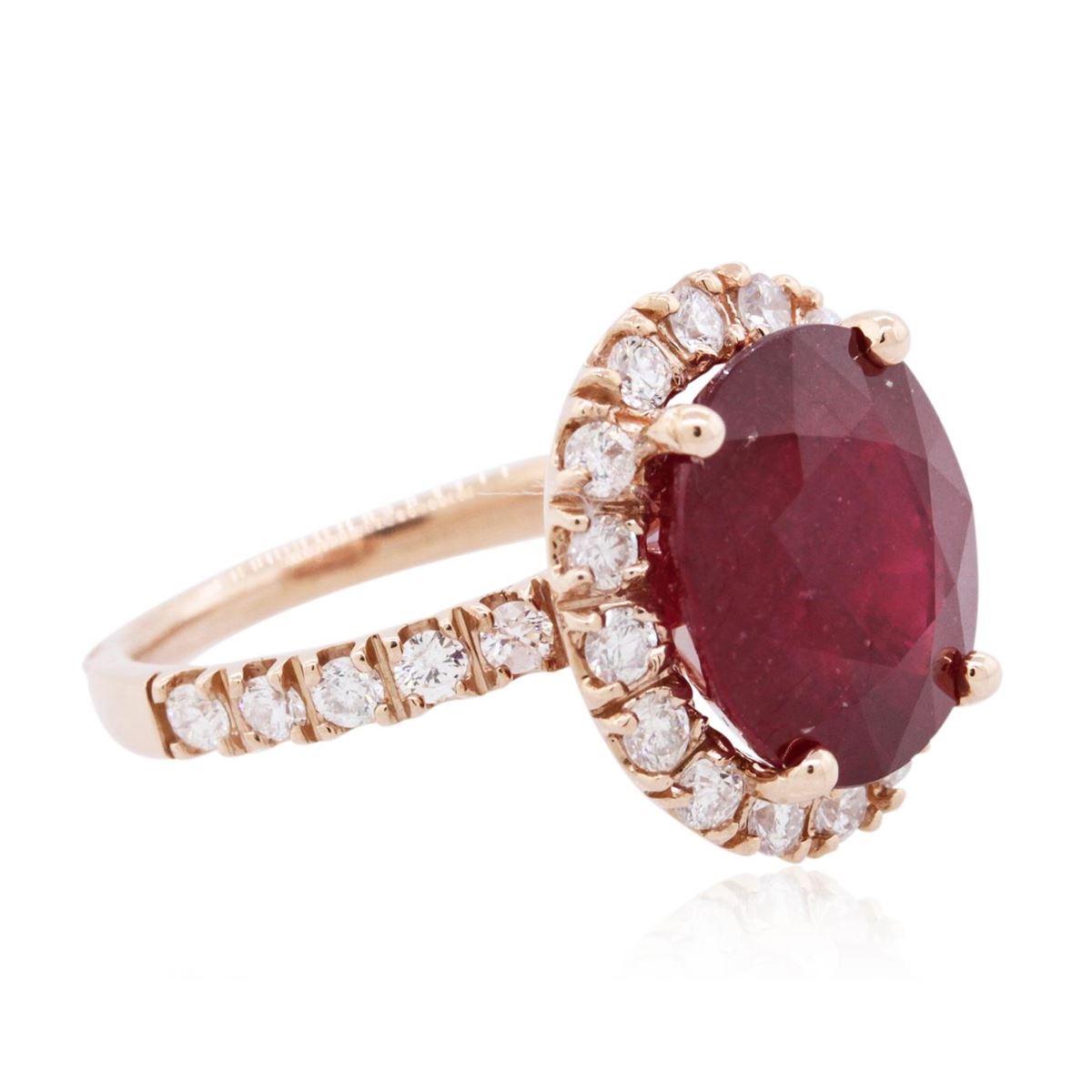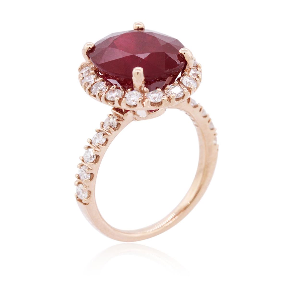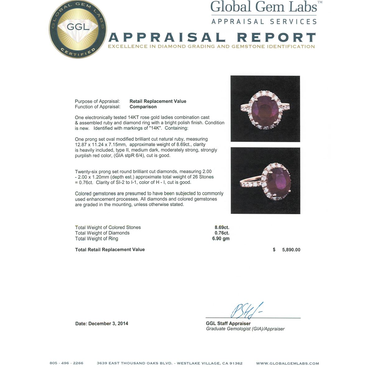 One electronically tested 14KT rose gold ladies combination cast & assembled ruby and diamond ring with a bright polish finish. Identified with markings of "14K". Condition is new. Containing: One prong set oval modified brilliant cut natural ruby, measuring 12.87 x 11.24 x 7.15mm, approximate weight of 8.69ct., clarity is heavily included, type II, medium dark, moderately strong, strongly purplish red color, (GIA stpR 6/4), cut is good. Twenty-Six prong set round brilliant cut diamonds, measuring 2.00 - 2.00 x 1.20mm (depth est.) approximate total weight of 26 Stones = 0.76ct. Clarity: SI-2 to I-1. Color: H - I, Cut is Good. Colored gemstones are presumed to have been subjected to commonly used enhancement processes. All diamonds and colored gemstones are graded in the mounting, unless otherwise stated. Total Weight of Colored Stones 8.69ct. Total Weight of Diamonds 0.76ct. Total Weight of Ring 6.90 grams. GGL Appraised at $5,890.00.
