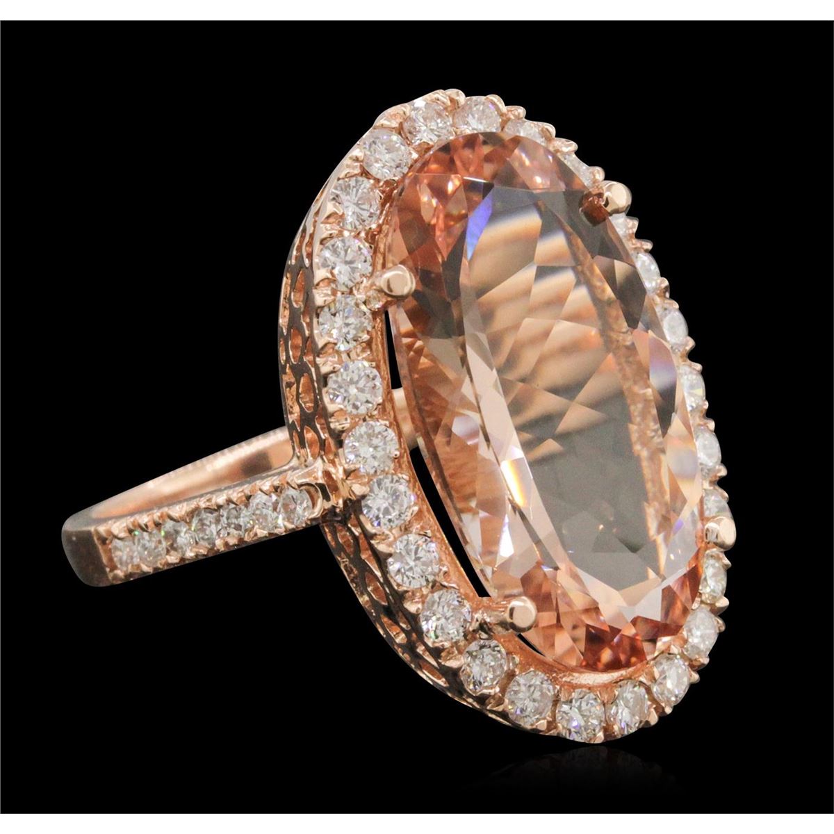 One electronically tested 14KT rose gold ladies combination cast & assembled ring with a bright polish finish. Condition is new. Identified with markings of "K14". Containing: One prong set oval modified brilliant cut natural morganite, measuring 20.14 x 11.18 x 6.61mm, approximate weight of 8.82ct., clarity is eye clean, type I, light, brownish, reddish orange color, (GIA rO 3/1), cut is good. Forty prong set round brilliant cut diamonds, measuring 2.00 - 1.50 x 1.05mm (depth est.) approximate. Total Weight of 40 Stones = 0.78ct. Clarity: SI-2 to I-1. Color: J - K, Cut is Good. Colored gemstones are presumed to have been subjected to commonly used enhancement processes. All diamonds and colored gemstones are graded in the mounting, unless otherwise stated. Total Weight of Colored Stones 8.82ct. Total Weight of Diamonds 0.78ct. Total Weight of Ring 8.10 grams. GGL Appraised at $9,310.00.