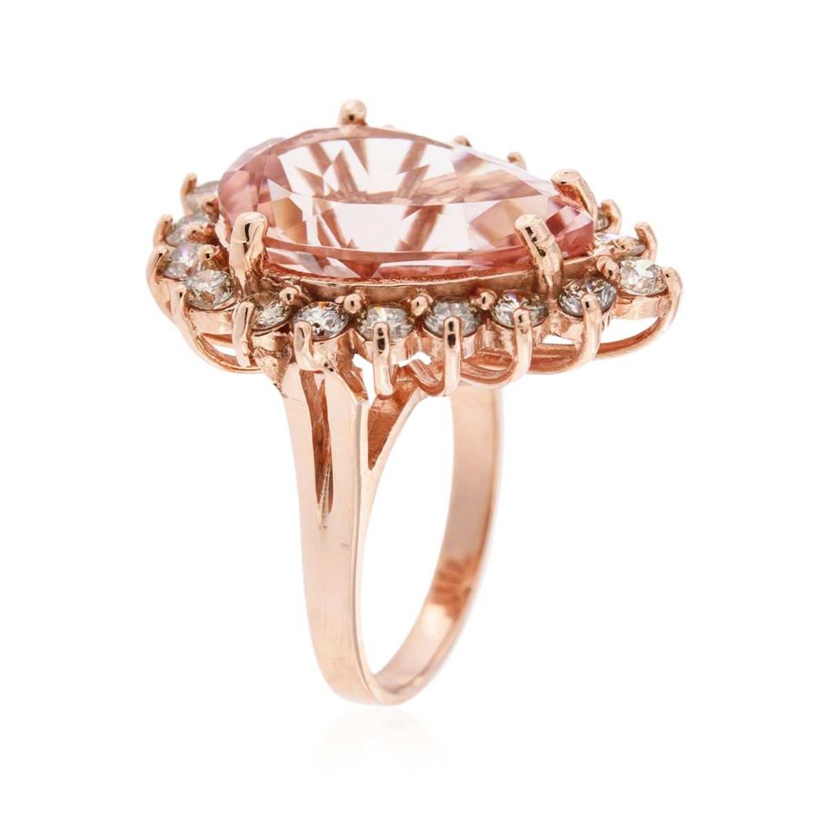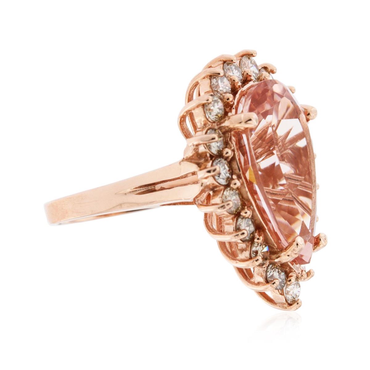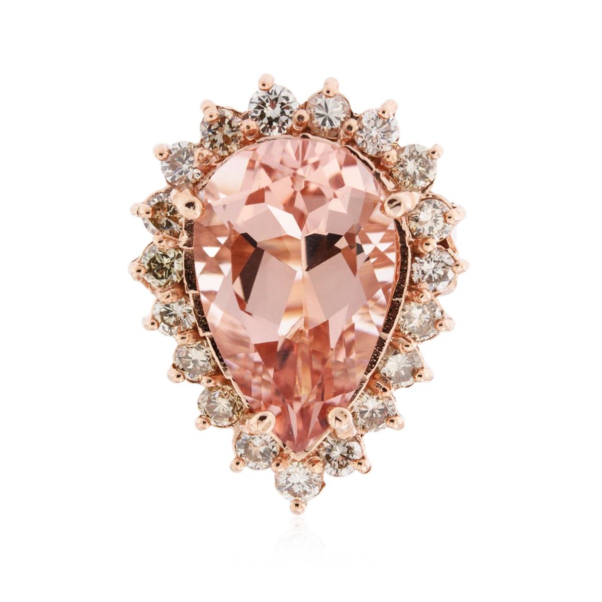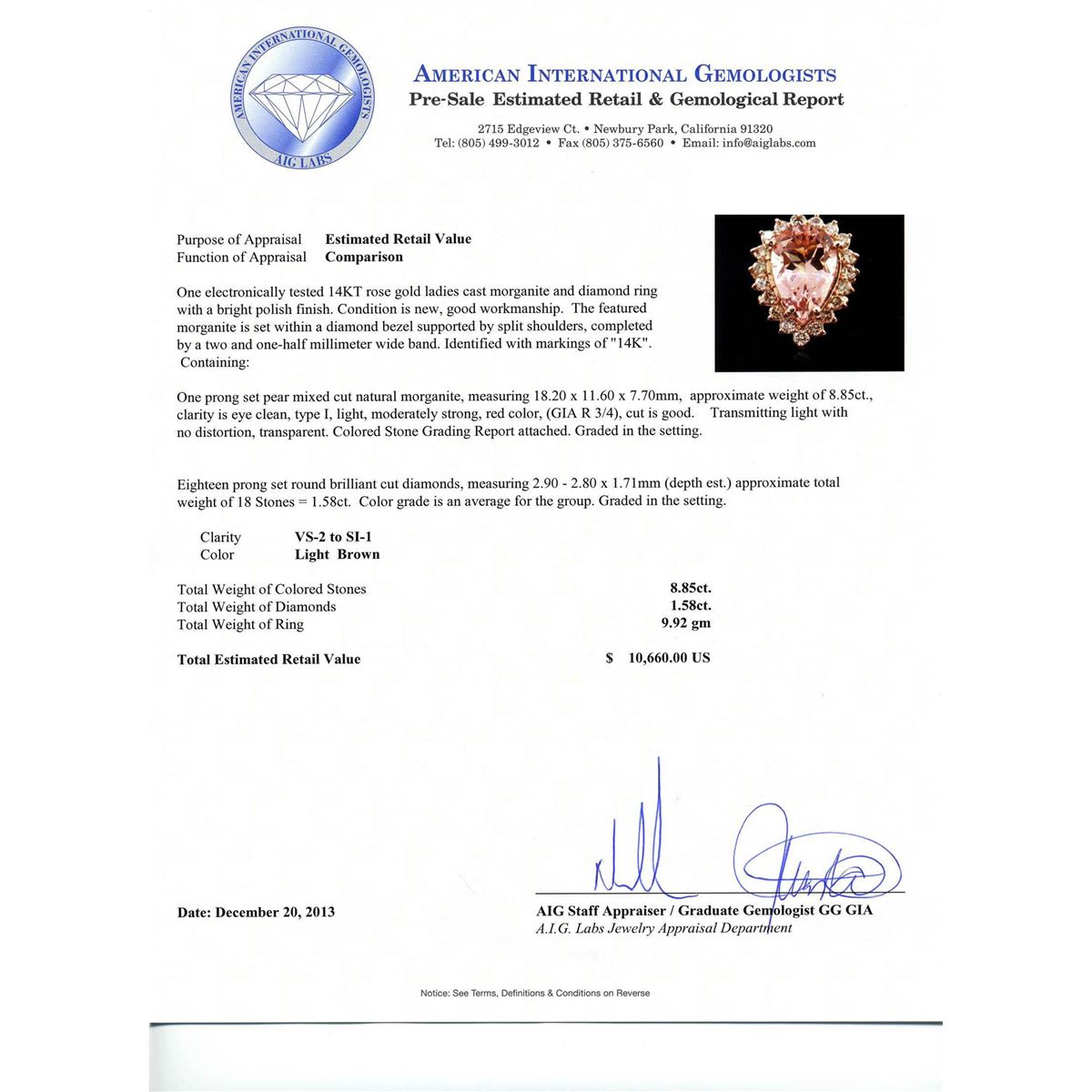 14KT rose gold 8.85ct Morganite and Diamond Ring A6603. One electronically tested 14KT rose gold ladies cast morganite and diamond ring with a bright polish finish. The featured morganite is set within a diamond bezel supported by split shoulders, completed by a two and one-half millimeter wide band. Identified with markings of "14K". Condition is new, good workmanship. Containing: One prong set pear mixed cut natural morganite, measuring 18.20 x 11.60 x 7.70mm, approximate weight of 8.85ct., clarity is eye clean, type I, light, moderately strong, red color, (GIA R 3/4), cut is good. Transmitting light with no distortion, transparent. Colored Stone Grading Report attached. Graded in the setting.Eighteen prong set round brilliant cut diamonds, measuring 2.90 - 2.80 x 1.71mm (depth est.) approximate. Total Weight of 18 Stones = 1.58ct. Color grade is an average for the group. Graded in the setting. Clarity: VS-2 to SI-1. Total Weight of Colored Stones 8.85ct. Total Weight of Diamonds 1.58ct. AIG Appraised at $10,660.00.