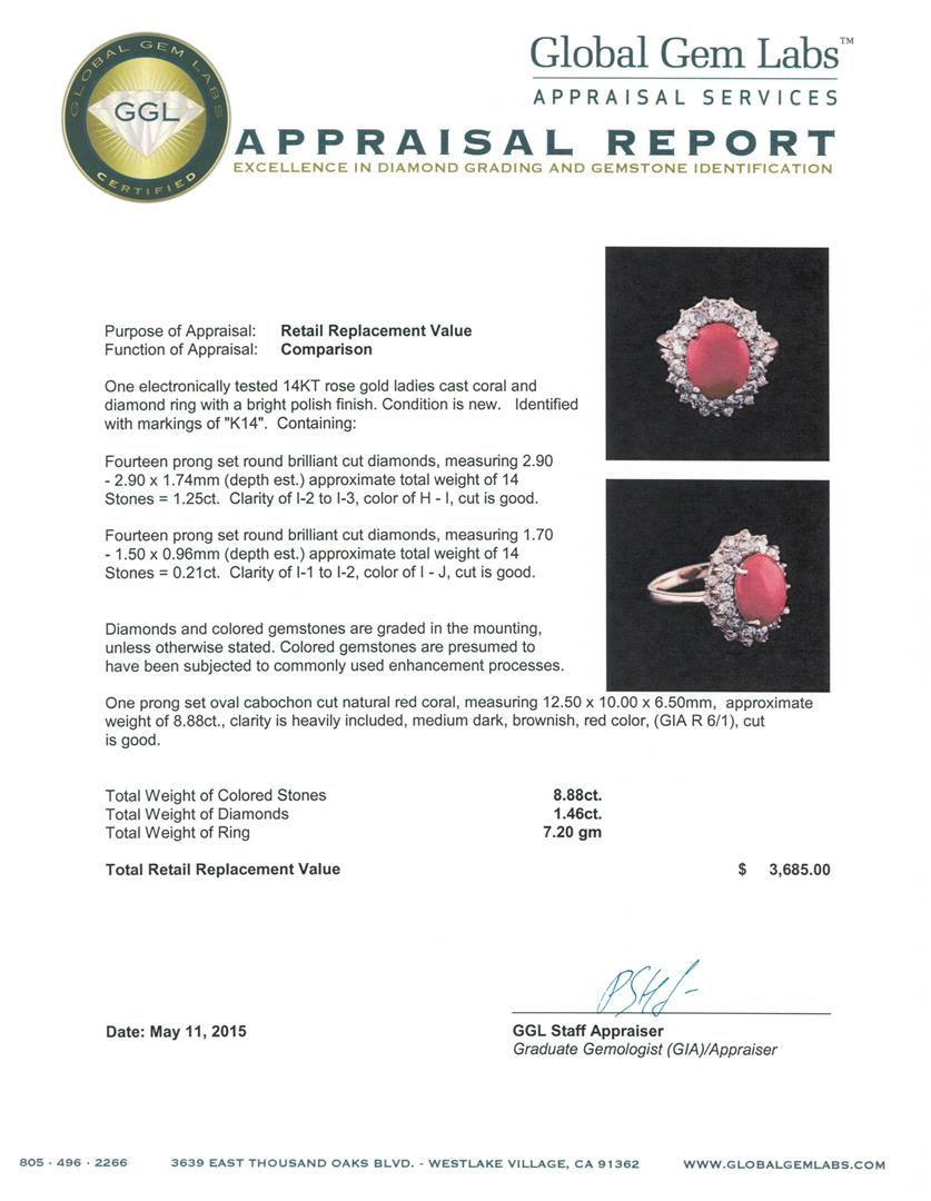 One electronically tested 14KT rose gold ladies cast coral and diamond ring with a bright polish finish. Identified with markings of "K14". Condition is new. Containing: Fourteen prong set round brilliant cut diamonds, measuring 2.90 - 2.90 x 1.74mm (depth est.) approximate total weight of 14 Stones = 1.25ct. Clarity: I-2 to I-3. Color: H - I, Cut is Good. Fourteen prong set round brilliant cut diamonds, measuring 1.70 - 1.50 x 0.96mm (depth est.) approximate total weight of 14 Stones = 0.21ct. Clarity: I-1 to I-2. Color: I - J, Cut is Good. Diamonds and colored gemstones are graded in the mounting, unless otherwise stated. Colored gemstones are presumed to have been subjected to commonly used enhancement processes. One prong set oval cabochon cut natural red coral, measuring 12.50 x 10.00 x 6.50mm, approximate weight of 8.88ct., clarity is heavily included, medium dark, brownish, red color, (GIA R 6/1), cut is good. Total Weight of Colored Stones 8.88ct. Total Weight of Diamonds 1.46ct. Total Weight of Ring 7.20 grams. GGL Appraised at $3,685.00.