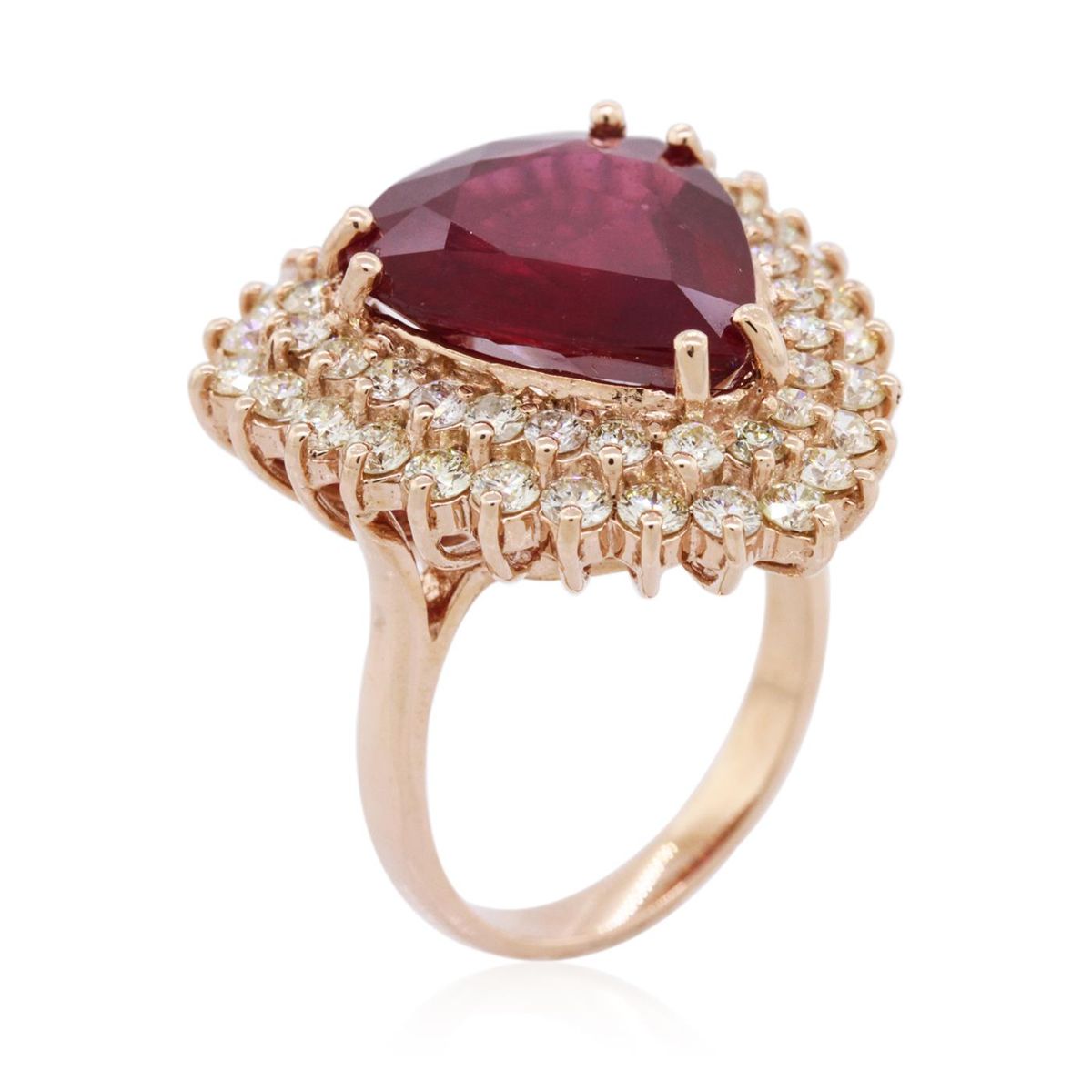 One electronically tested 14KT rose gold ladies combination cast & assembled ruby and diamond ring with a bright polish finish. Identified with markings of "K14". Condition is new. Containing: One prong set pear modified brilliant cut natural ruby, measuring 15.83 x 11.90 x 6.20mm, approximate weight of 9.34ct., clarity is heavily included, type II, medium dark, moderately strong, strongly purplish red color, (GIA stpR 6/4), cut is good. Fifty-Three prong set round brilliant cut diamonds, measuring 2.20 - 1.90 x 1.23mm (depth est.) approximate total weight of 53 Stones = 1.67ct. Clarity: SI-1 to I-1. Color: K - L, Cut is Good. Colored gemstones are presumed to have been subjected to commonly used enhancement processes. All diamonds and colored gemstones are graded in the mounting, unless otherwise stated. Total Weight of Colored Stones 9.34ct. Total Weight of Diamonds 1.67ct. Total Weight of Ring 11.20 grams. GGL Appraised at $7,450.00.