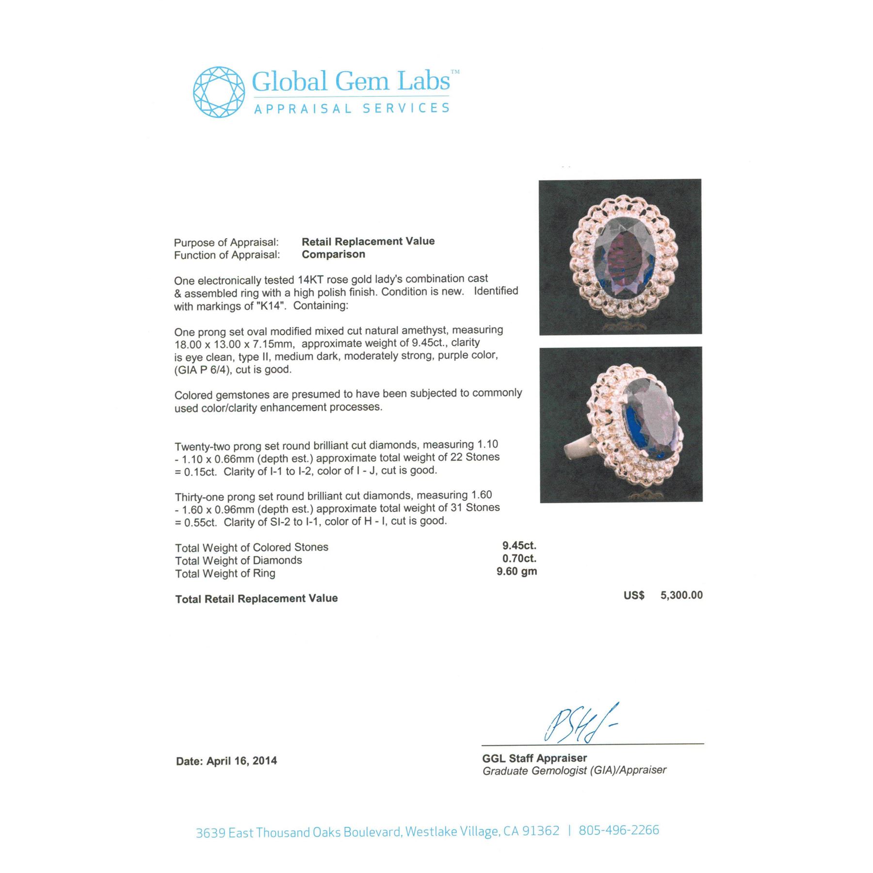 One electronically tested 14KT rose gold Ladies combination cast & assembled ring with a high polish finish. Condition is new. Identified with markings of "K14". Containing: One prong set oval modified mixed cut natural amethyst, measuring 18.00 x 13.00 x 7.15mm, approximate weight of 9.45ct., clarity is eye clean, type II, medium dark, moderately strong, purple color, (GIA P 6/4), cut is good. Colored gemstones are presumed to have been subjected to commonly used color/clarity enhancement processes. Twenty-Two prong set round brilliant cut diamonds, measuring 1.10 - 1.10 x 0.66mm (depth est.) approximate. Total Weight of 22 Stones = 0.15ct. Clarity: I-1 to I-2. Color: I - J, Cut is Good. Thirty-One prong set round brilliant cut diamonds, measuring 1.60 - 1.60 x 0.96mm (depth est.) approximate. Total Weight of 31 Stones = 0.55ct. Clarity: SI-2 to I-1. Color: H - I, Cut is Good. Total Weight of Colored Stones 9.45ct. Total Weight of Diamonds 0.70 ct. Total Weight of Ring 9.60 grams. GGL Appraised.