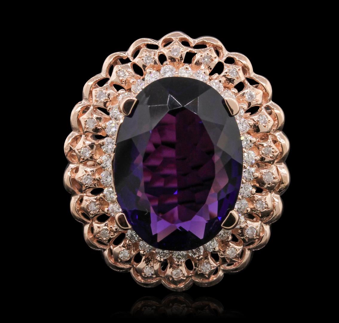One electronically tested 14KT rose gold Ladies combination cast & assembled ring with a high polish finish. Condition is new. Identified with markings of "K14". Containing: One prong set oval modified mixed cut natural amethyst, measuring 18.00 x 13.00 x 7.15mm, approximate weight of 9.45ct., clarity is eye clean, type II, medium dark, moderately strong, purple color, (GIA P 6/4), cut is good. Colored gemstones are presumed to have been subjected to commonly used color/clarity enhancement processes. Twenty-Two prong set round brilliant cut diamonds, measuring 1.10 - 1.10 x 0.66mm (depth est.) approximate. Total Weight of 22 Stones = 0.15ct. Clarity: I-1 to I-2. Color: I - J, Cut is Good. Thirty-One prong set round brilliant cut diamonds, measuring 1.60 - 1.60 x 0.96mm (depth est.) approximate. Total Weight of 31 Stones = 0.55ct. Clarity: SI-2 to I-1. Color: H - I, Cut is Good. Total Weight of Colored Stones 9.45ct. Total Weight of Diamonds 0.70ct. Total Weight of Ring 9.60 grams. GGL Appraised at $5,300.00.