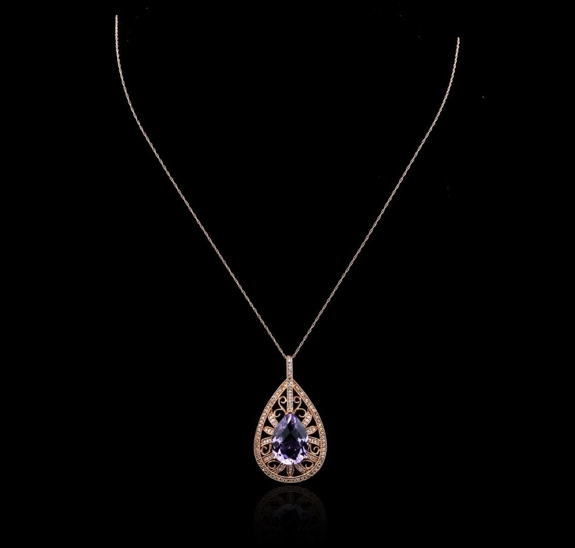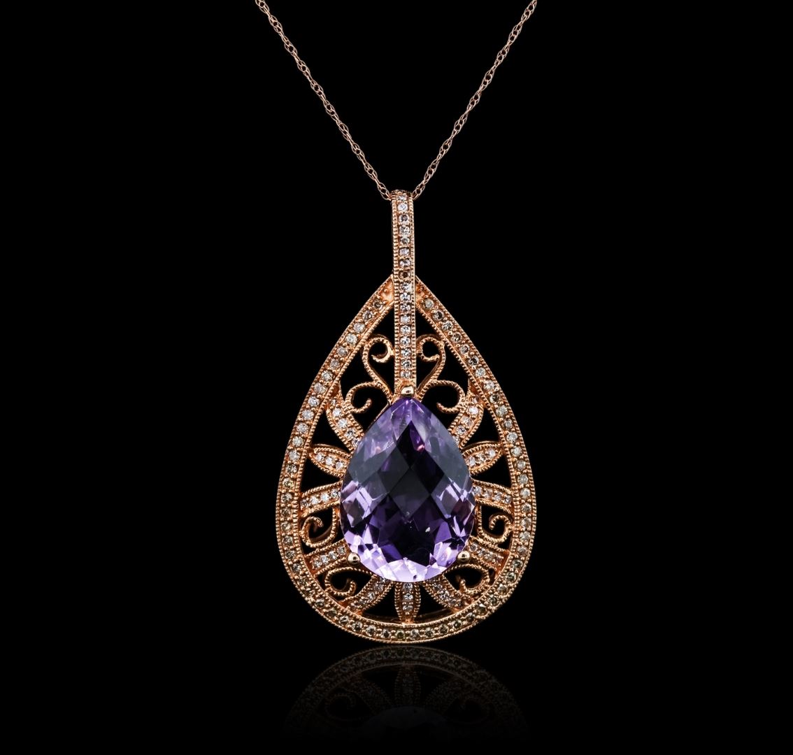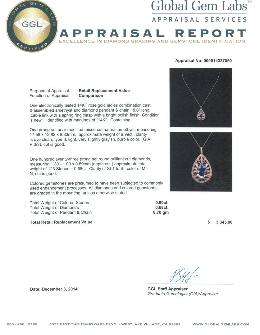 One electronically tested 14KT rose gold ladies combination cast & assembled amethyst and diamond pendant & chain 18.0" long, cable link with a spring ring clasp with a bright polish finish. Identified with markings of "14K". Condition is new. Containing: One prong set pear modified mixed cut natural amethyst, measuring 17.58 x 12.82 x 8.33mm, approximate weight of 9.99ct., clarity is eye clean, type II, light, very slightly grayish, purple color, (GIA P 3/3), cut is good. One Hundred Twenty-Three prong set round brilliant cut diamonds, measuring 1.30 - 1.00. x 0.69mm (depth est.) approximate total weight of 123 Stones = 0.68ct. Clarity: SI-1 to SI. Color: M - N, Cut is Good. Colored gemstones are presumed to have been subjected to commonly used enhancement processes. All diamonds and colored gemstones are graded in the mounting, unless otherwise stated. Total Weight of Colored Stones 9.99ct. Total Weight of Diamonds 0.68ct. Total Weight of Pendant & Chain 8.70 grams. GGL Appraised at $3,345.00.