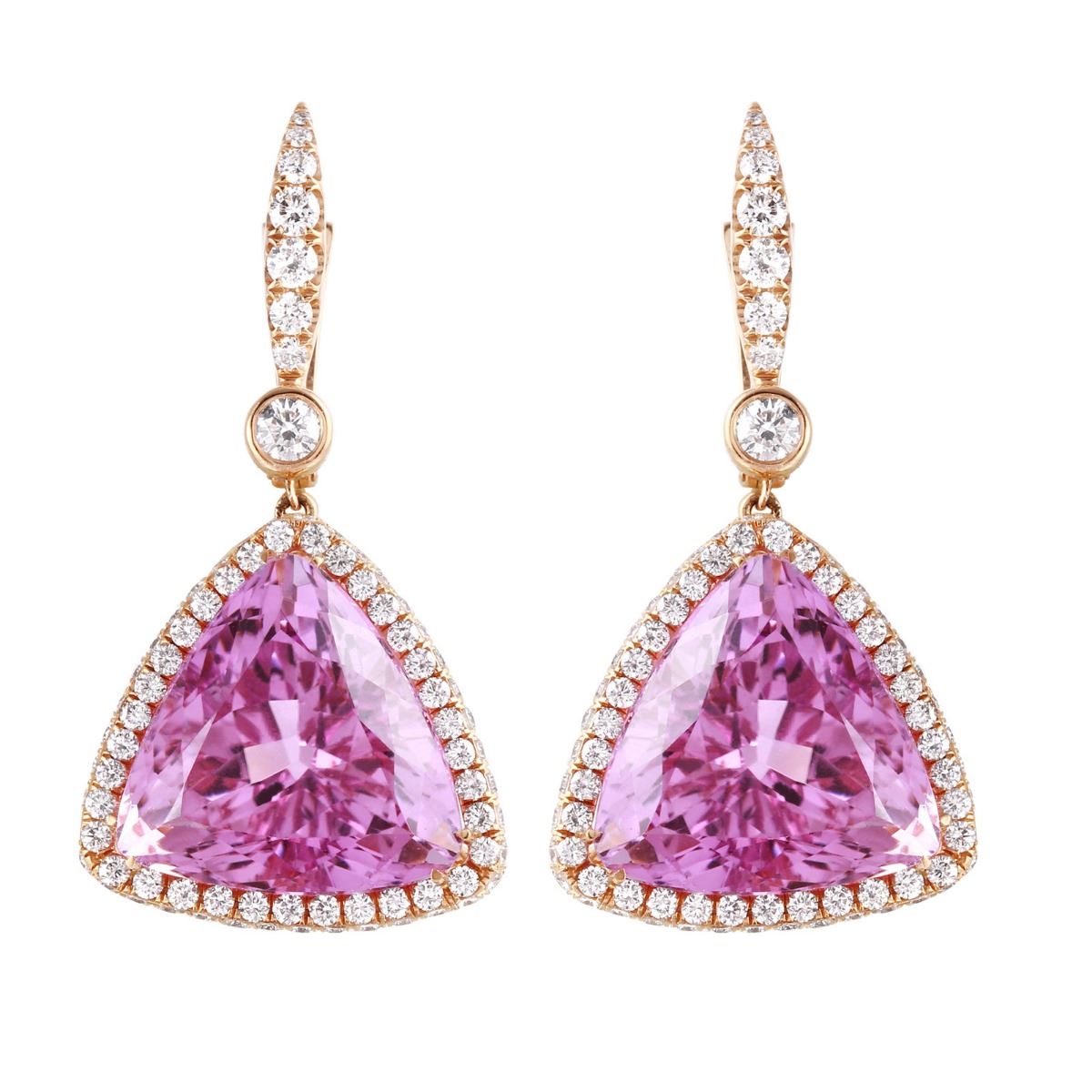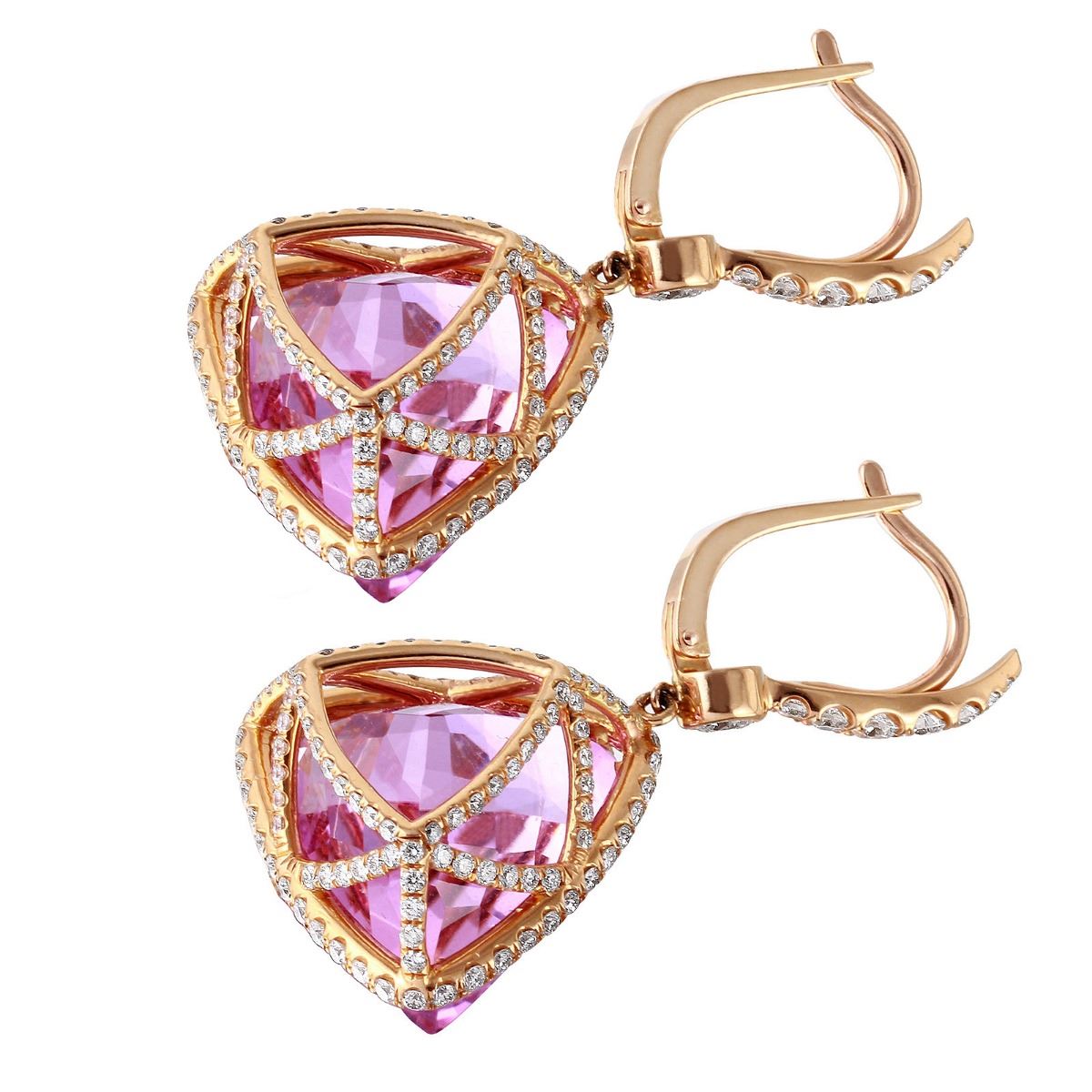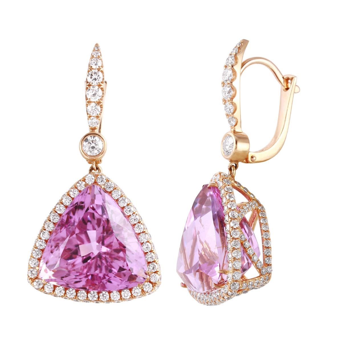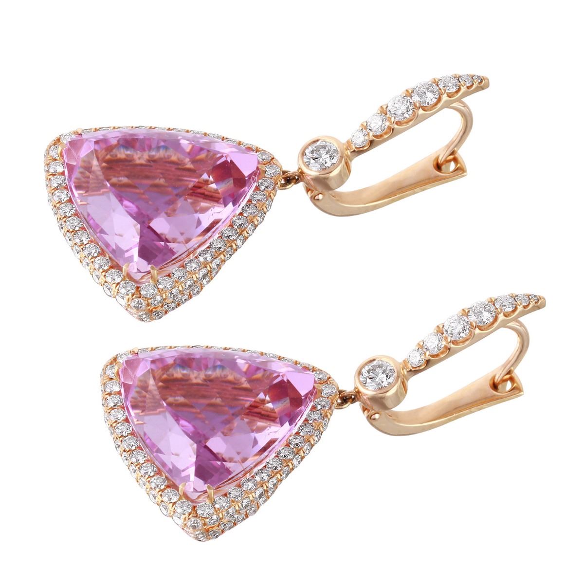 One pair electronically tested 18KT rose gold ladies custom wax & cast pink kunzite and diamond earrings with lever backs with a bright polish finish. Condition is new. Containing: Two prong set triangle modified brilliant cut natural kunzites, measuring 17.50 x 17.50 x 11.90mm, approximate total weight of 41.20ct., clarity is eye clean, type I, medium light, moderately strong, purple color, cut is excellent. Two bezel set round brilliant cut diamonds, measuring 4.00 - 4.00 x 2.40mm (depth est.) approximate total weight of 2 Stones = 0.47ct. Clarity: VS-2. Color: F - G, Cut is Excellent. Three Hundred Four prong set round brilliant cut diamonds, measuring 2.50 - 1.50 x 1.20mm (depth est.) approximate total weight of 304 Stones = 3.17ct. Clarity: VS-2. Color: G - H, Cut is Excellent. Approximate Total Weight of Colored Stones 41.20ct. Approximate Total Weight of Diamonds 3.64ct. Total Weight of Earrings 19.00gm. The descriptions listed should not be construed as an appraisal. The detail is provided as a guideline for color, clarity, weights and measurements to the best of our ability. We welcome inspections. WE SHIP WORLDWIDE!