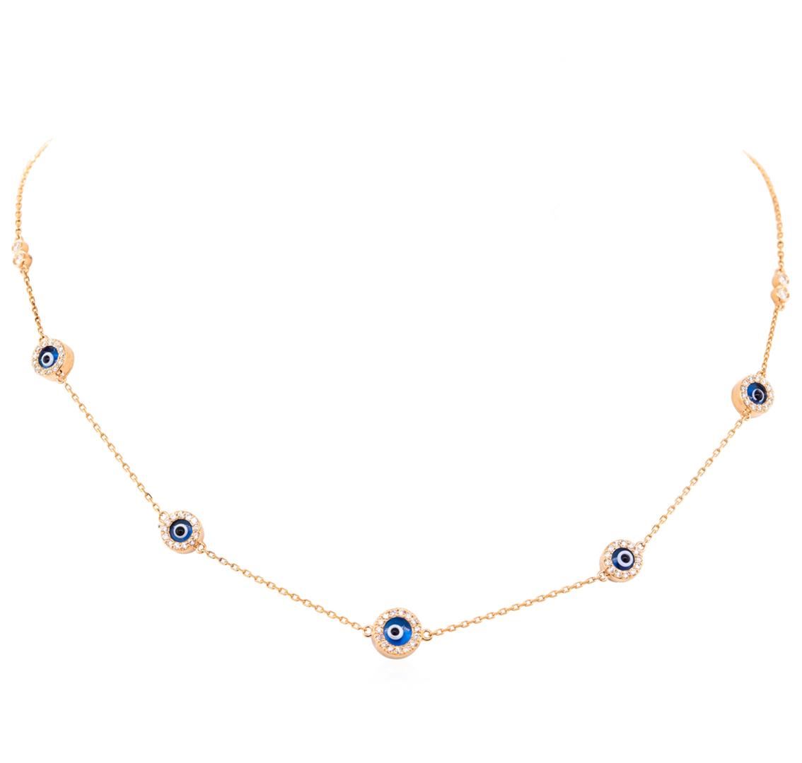 One electronically tested 14KT rose gold lady's combination cast & assembled diamonds by the yard necklace with a spring ring clasp with a bright polish finish. The featured lady's necklace has five bezel set "evil eyes" and an adjustable 1.1 millimeter diamond cut cable link measuring between 16 and 18 inches. Identified with markings of "14K". Condition is new, good workmanship. Containing: Four bezel set round brilliant cut diamonds, measuring 2.00 - 1.80 x 1.18mm (depth est.) approximate. Total Weight of 4 Stones = 0.10ct. Graded in the setting. Clarity: VS-2 to SI-1. Color: G - H, Cut Very Good. Sixty-Seven prong set round brilliant cut diamonds, measuring 1.20 - 1.15 x 0.73mm (depth est.) approximate. Total Weight of 67 Stones = 0.41ct. Graded in the setting. Clarity: VS-1 to SI-1. Color: H - I, Cut Very Good. Total Weight of Diamonds 0.51ct. Total Weight of Necklace 6.20gm. GAS Appraised at $3,080.00.
