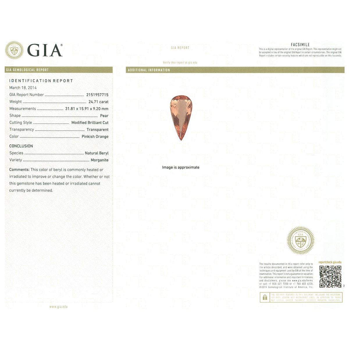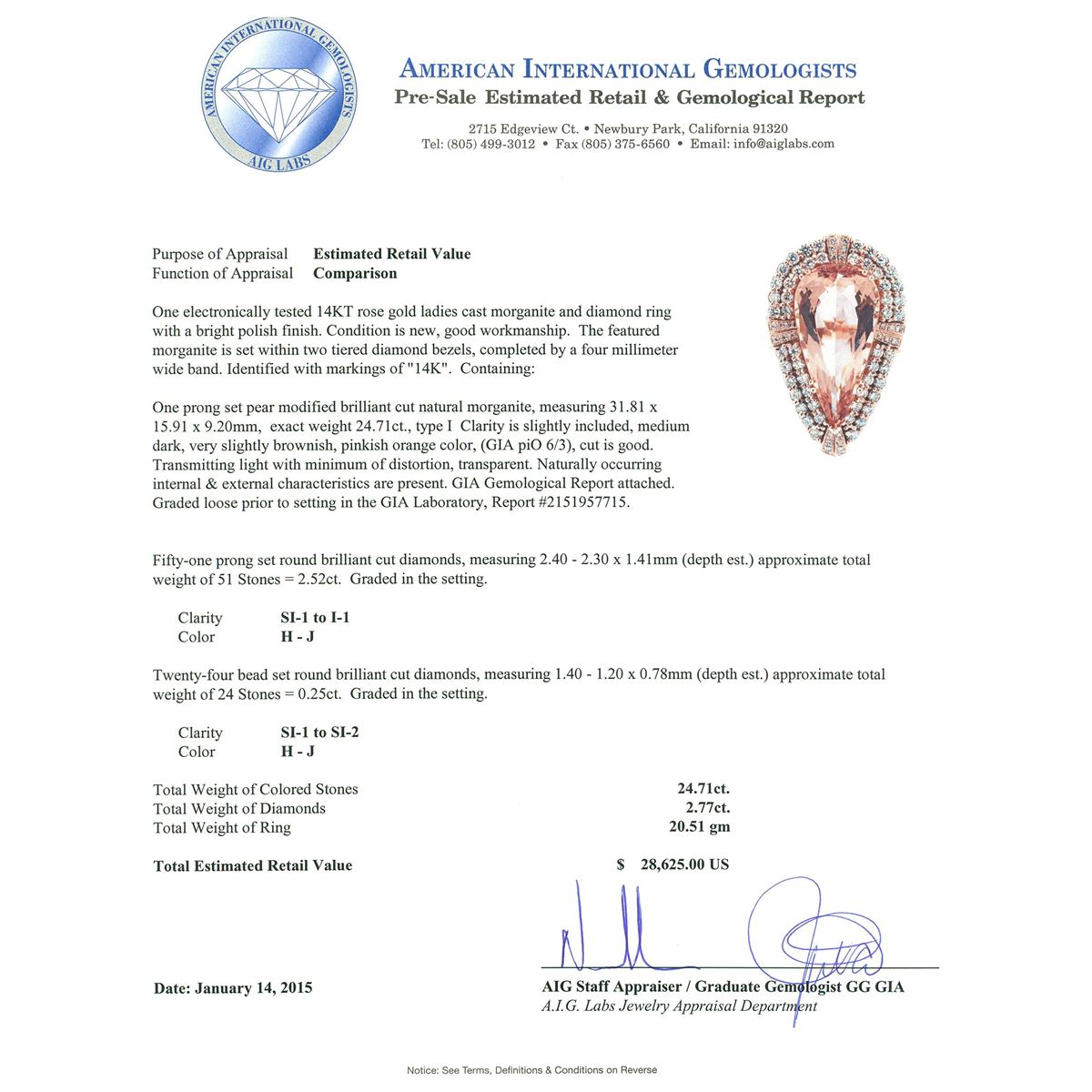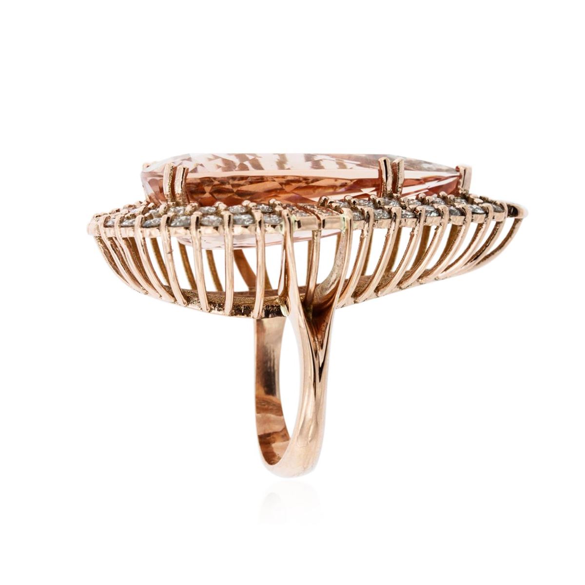One electronically tested 14KT rose gold ladies cast morganite and diamond ring with a bright polish finish. The featured morganite is set within two tiered diamond bezels, completed by a four millimeter wide band. Identified with markings of "14K". Condition is new, good workmanship. Containing: One prong set pear modified brilliant cut natural morganite, measuring 31.81 x 15.91 x 9.20mm, exact weight 24.71ct., type I Clarity is slightly included, medium dark, very slightly brownish, pinkish orange color, (GIA piO 6/3), cut is good. Transmitting light with minimum of distortion, transparent. Naturally occurring internal & external characteristics are present. GIA Gemological Report attached. Graded loose prior to setting in the GIA Laboratory, Report #2151957715.Fifty-One prong set round brilliant cut diamonds, measuring 2.40 - 2.30 x 1.41mm (depth est.) approximate total weight of 51 Stones = 2.52ct. Graded in the setting. Clarity: SI-1 to I-1. Color: H - J Twenty-Four bead set round brilliant cut diamonds, measuring 1.40 - 1.20 x 0.78mm (depth est.) approximate total weight of 24 Stones = 0.25ct. Graded in the setting. Clarity: SI-1 to SI-2. Color: H - J. Total Weight of Colored Stones 24.71ct. Total Weight of Diamonds 2.77ct. Total Weight of Ring 20.51 grams. AIG Appraised at $28,625.00.