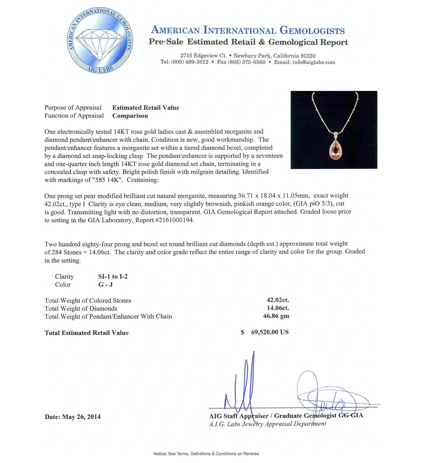 One electronically tested 14KT rose gold ladies cast & assembled morganite and diamond pendant/enhancer with chain. Condition is new, good workmanship. The pendant/enhancer features a morganite set within a tiered diamond bezel, completed by a diamond set snap-locking clasp. The pendant/enhancer is supported by a seventeen and one-quarter inch length 14KT rose gold diamond set chain, terminating in a concealed clasp with safety. Bright polish finish with milgrain detailing. Identified with markings of "585 14K". Containing: One prong set pear modified brilliant cut natural morganite, measuring 36.71 x 18.04 x 11.05mm, exact weight 42.02ct., type I Clarity is eye clean, medium, very slightly brownish, pinkish orange color, (GIA piO 5/3), cut is good. Transmitting light with no distortion, transparent. GIA Gemological Report attached. Graded loose prior to setting in the GIA Laboratory, Report #2161000194.Two Hundred Eighty-Four prong and bezel set round brilliant cut diamonds (depth est.) approximate. Total Weight of 284 Stones = 14.06ct. The clarity and color grade reflect the entire range of clarity and color for the group. Graded in the setting. Clarity: SI-1 to I-2. Color: G - J. Total Weight of Colored Stones 42.02ct. Total Weight of Diamonds 14.06ct. Total Weight of Pendant/Enhancer With Chain 46.86 grams. AIG Appraised at $69,520.00.