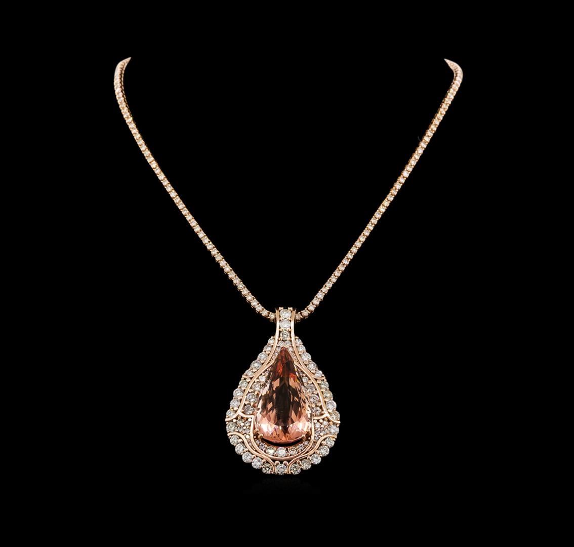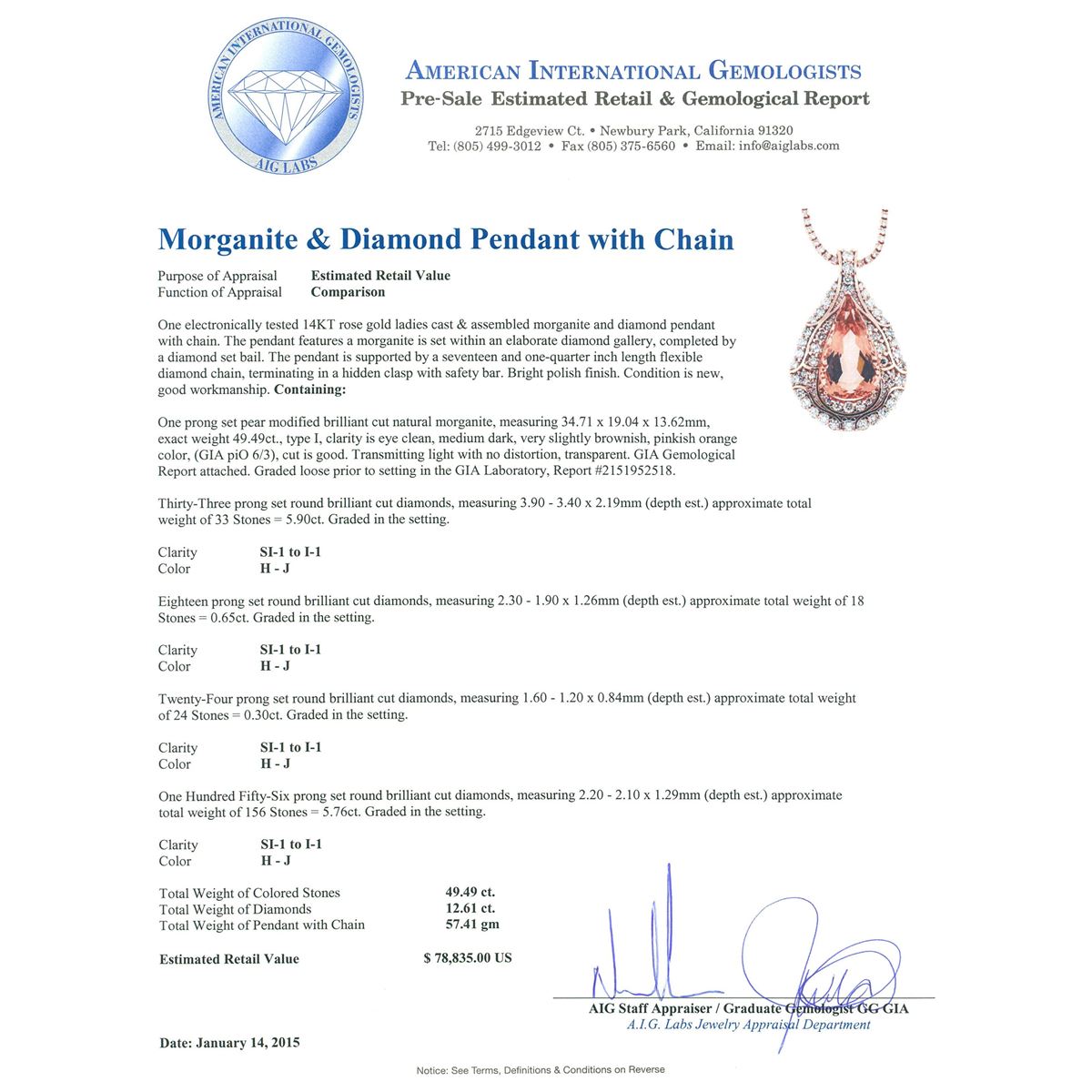One electronically tested 14KT rose gold ladies cast & assembled morganite and diamond pendant with chain. The pendant features a morganite set within an elaborate diamond gallery, completed by a diamond set bail. The pendant is supported by a seventeen and one-quarter inch length flexible diamond chain, terminating in a hidden clasp with safety bar. Bright polish finish. Condition is new, good workmanship. Containing: One prong set pear modified brilliant cut natural morganite, measuring 34.71 x 19.04 x 13.62mm, exact weight 49.49ct., type I Clarity is eye clean, medium dark, very slightly brownish, pinkish orange color, (GIA piO 6/3), cut is good. Transmitting light with no distortion, transparent. GIA Gemological Report attached. Graded loose prior to setting in the GIA Laboratory, Report #2151952518.Thirty-Three prong set round brilliant cut diamonds, measuring 3.90 - 3.40 x 2.19mm (depth est.) approximate total weight of 33 Stones = 5.90ct. Graded in the setting. Clarity: SI-1 to I-1. Color: H - J Eighteen prong set round brilliant cut diamonds, measuring 2.30 - 1.90 x 1.26mm (depth est.) approximate total weight of 18 Stones = 0.65ct. Graded in the setting. Clarity: SI-1 to I-1. Color: H - J Twenty-Four prong set round brilliant cut diamonds, measuring 1.60 - 1.20 x 0.84mm (depth est.) approximate total weight of 24 Stones = 0.30ct. Graded in the setting. Clarity: SI-1 to I-1. Color: H - J One Hundred Fifty-Six prong set round brilliant cut diamonds, measuring 2.20 - 2.10 x 1.29mm (depth est.) approximate total weight of 156 Stones = 5.76ct. Graded in the setting. Clarity: SI-1 to I-1. Color: H - J. Total Weight of Colored Stones 49.49ct. Total Weight of Diamonds 12.61ct. Total Weight of Pendant With Chain 57.41 grams. AIG Appraised at $78,835.00.