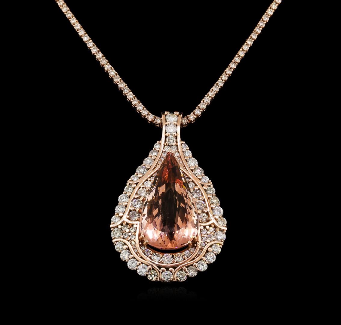 One electronically tested 14KT rose gold ladies cast & assembled morganite and diamond pendant with chain. The pendant features a morganite set within an elaborate diamond gallery, completed by a diamond set bail. The pendant is supported by a seventeen and one-quarter inch length flexible diamond chain, terminating in a hidden clasp with safety bar. Bright polish finish. Condition is new, good workmanship. Containing: One prong set pear modified brilliant cut natural morganite, measuring 34.71 x 19.04 x 13.62mm, exact weight 49.49ct., type I Clarity is eye clean, medium dark, very slightly brownish, pinkish orange color, (GIA piO 6/3), cut is good. Transmitting light with no distortion, transparent. GIA Gemological Report attached. Graded loose prior to setting in the GIA Laboratory, Report #2151952518.Thirty-Three prong set round brilliant cut diamonds, measuring 3.90 - 3.40 x 2.19mm (depth est.) approximate total weight of 33 Stones = 5.90ct. Graded in the setting. Clarity: SI-1 to I-1. Color: H - J Eighteen prong set round brilliant cut diamonds, measuring 2.30 - 1.90 x 1.26mm (depth est.) approximate total weight of 18 Stones = 0.65ct. Graded in the setting. Clarity: SI-1 to I-1. Color: H - J Twenty-Four prong set round brilliant cut diamonds, measuring 1.60 - 1.20 x 0.84mm (depth est.) approximate total weight of 24 Stones = 0.30ct. Graded in the setting. Clarity: SI-1 to I-1. Color: H - J One Hundred Fifty-Six prong set round brilliant cut diamonds, measuring 2.20 - 2.10 x 1.29mm (depth est.) approximate total weight of 156 Stones = 5.76ct. Graded in the setting. Clarity: SI-1 to I-1. Color: H - J. Total Weight of Colored Stones 49.49ct. Total Weight of Diamonds 12.61ct. Total Weight of Pendant With Chain 57.41 grams. AIG Appraised at $78,835.00.