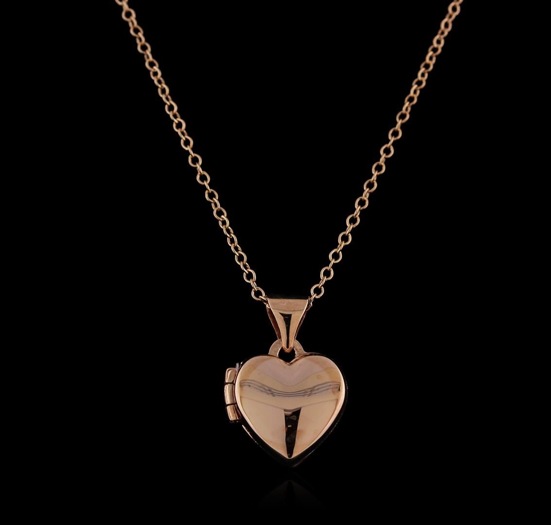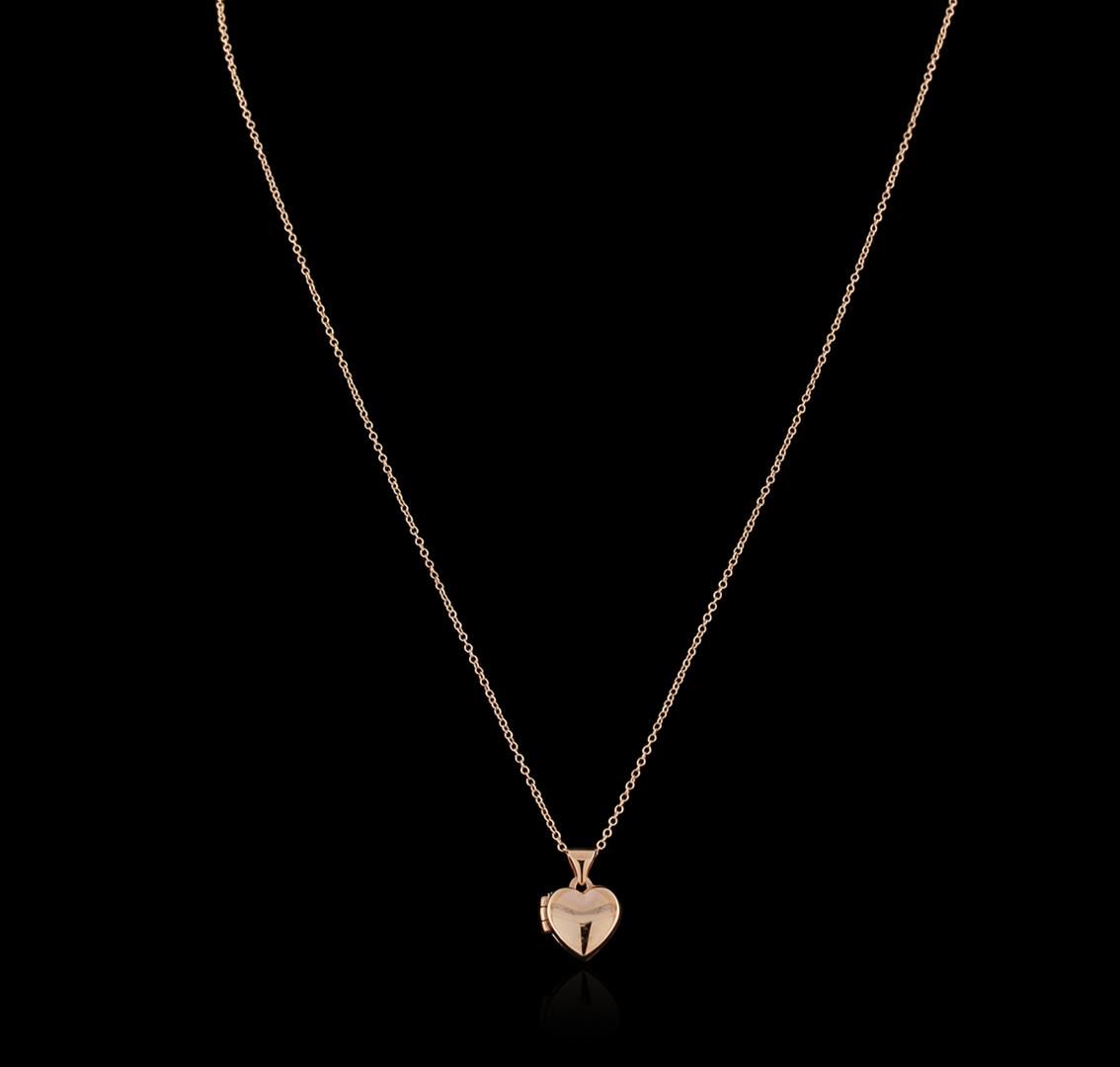 One heart shape locket pendant with chain featuring: 14KT rose gold weighing 1.70 grams.